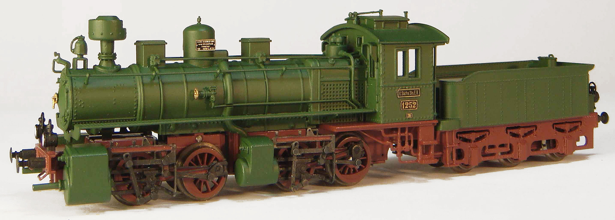 parní lokomotiva tmavě zelená s červeným pojezdem