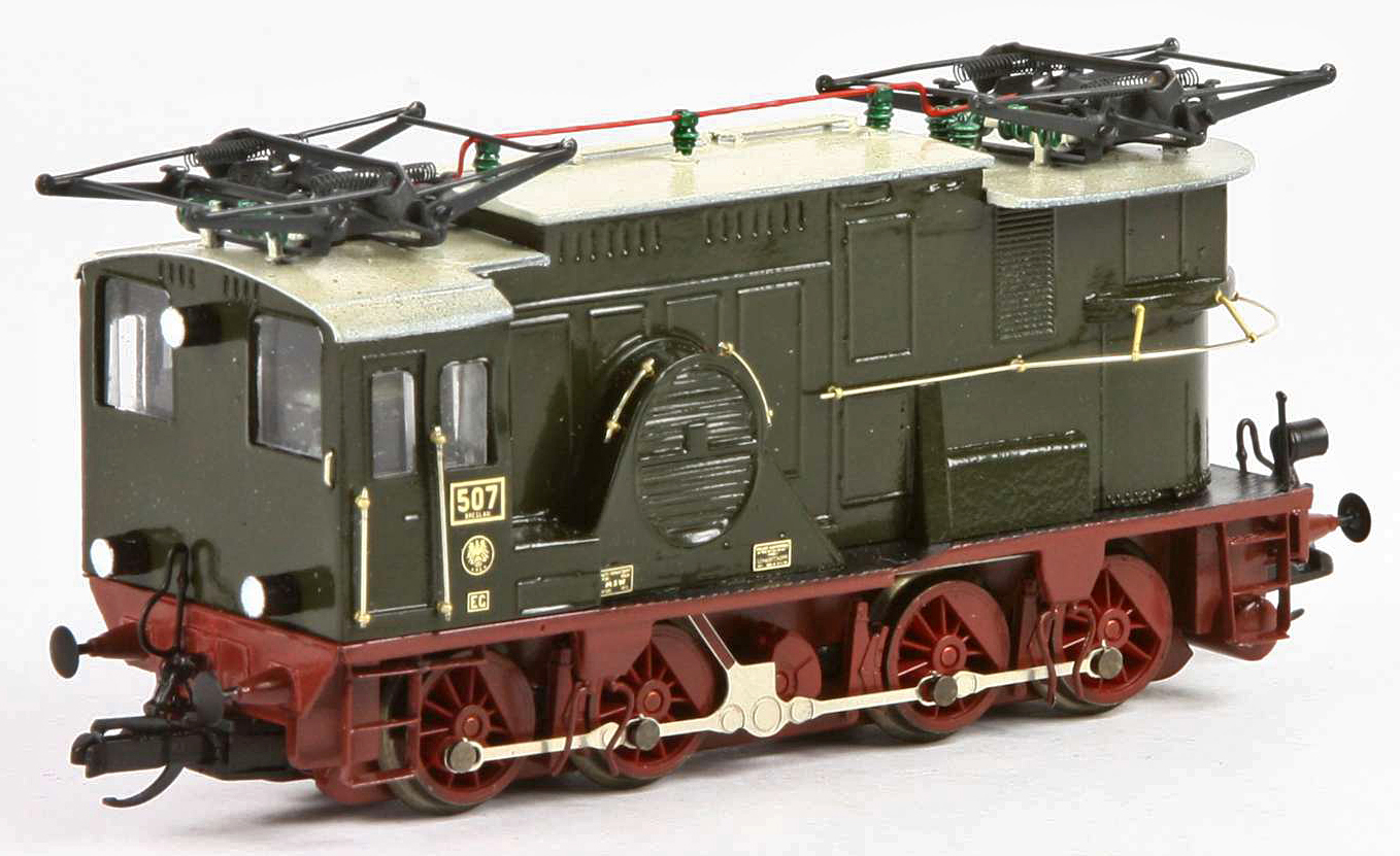 | elektrická lokomotiva tmavě zelená s červeným rámem a pojezdem |