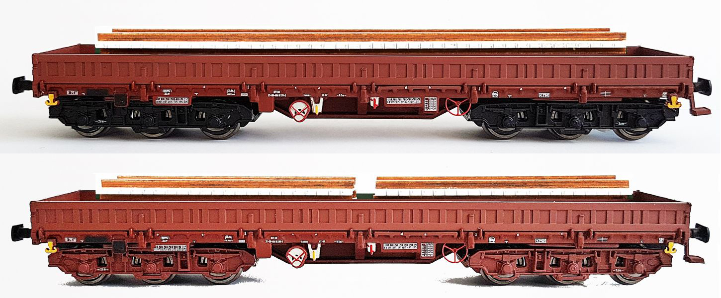 nízkostěnný nákladní vůz červenohnědý s nákladem dlouhého zásobníku pražců