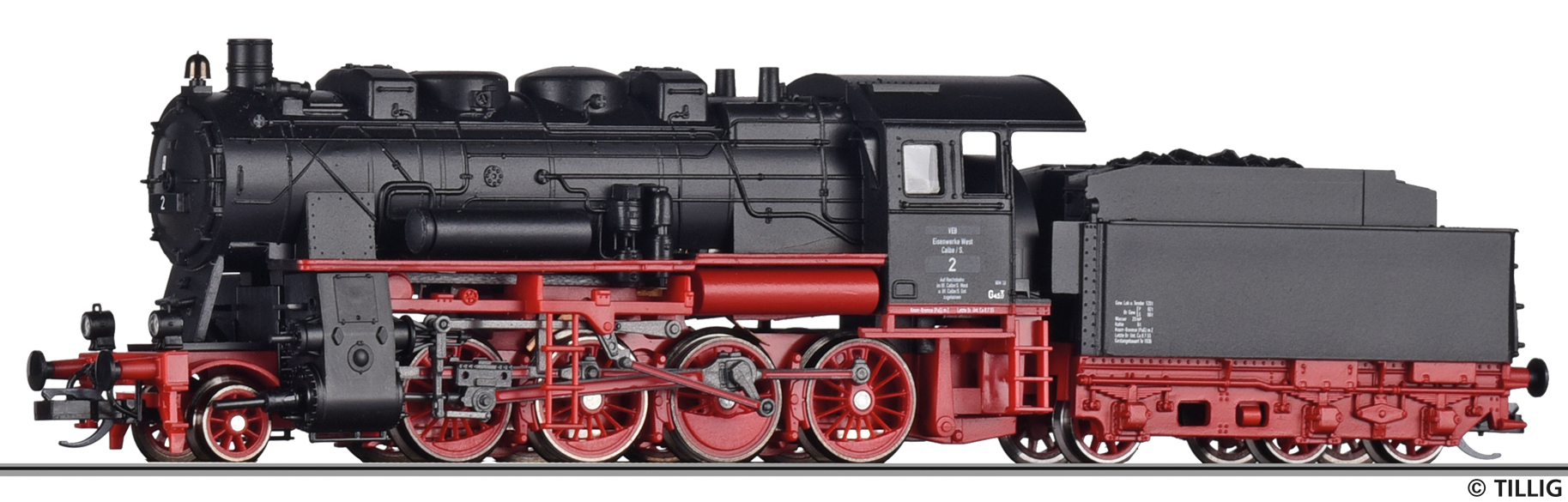 | parní lokomotiva černá s červeným pojezdem „Eisenwerke West“ |