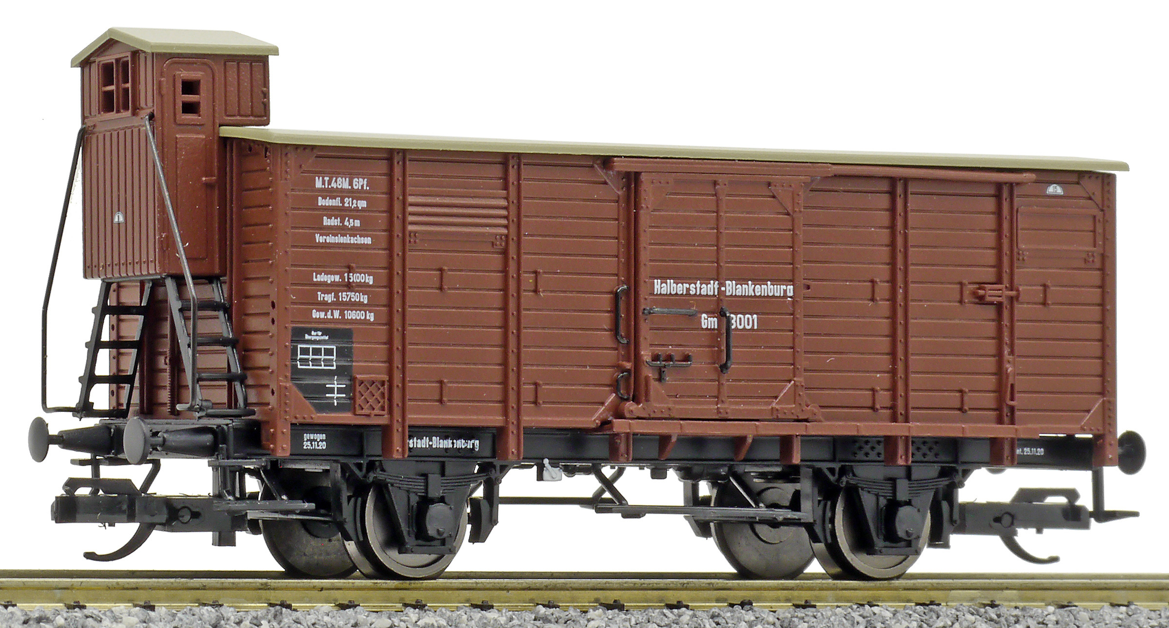 krytý nákladní vůz hnědý s černou střechou a s brzdařskou budkou