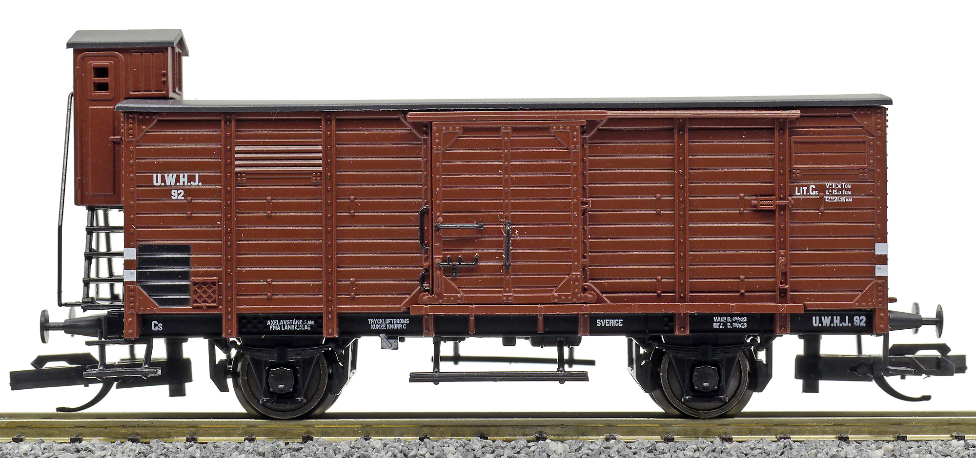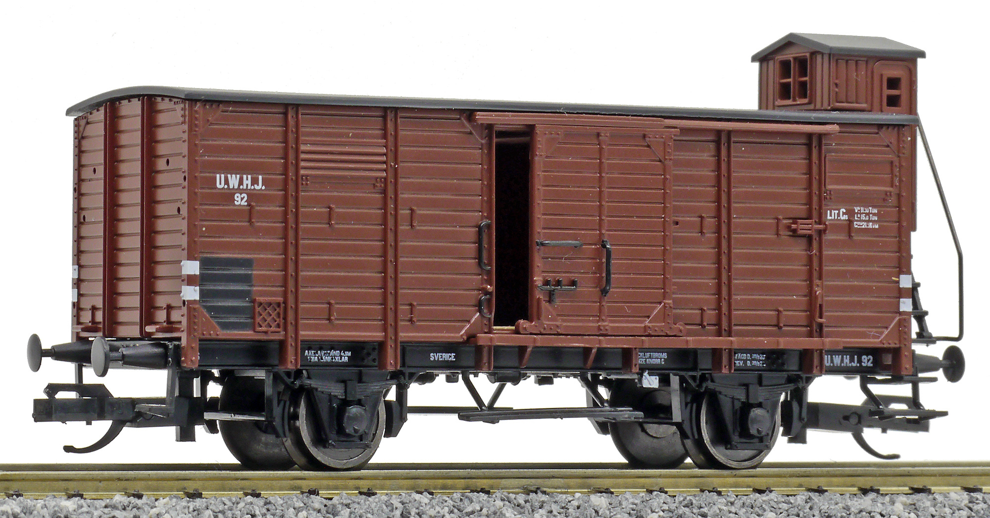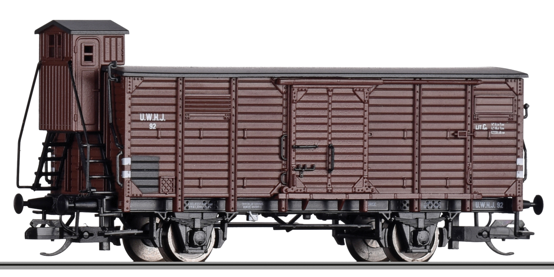 | krytý nákladní vůz červenohnědý s brzdařskou budkou |