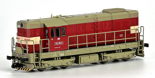 | dieselová lokomotiva červená s pruhem, šedá střecha, rám a pojezd |