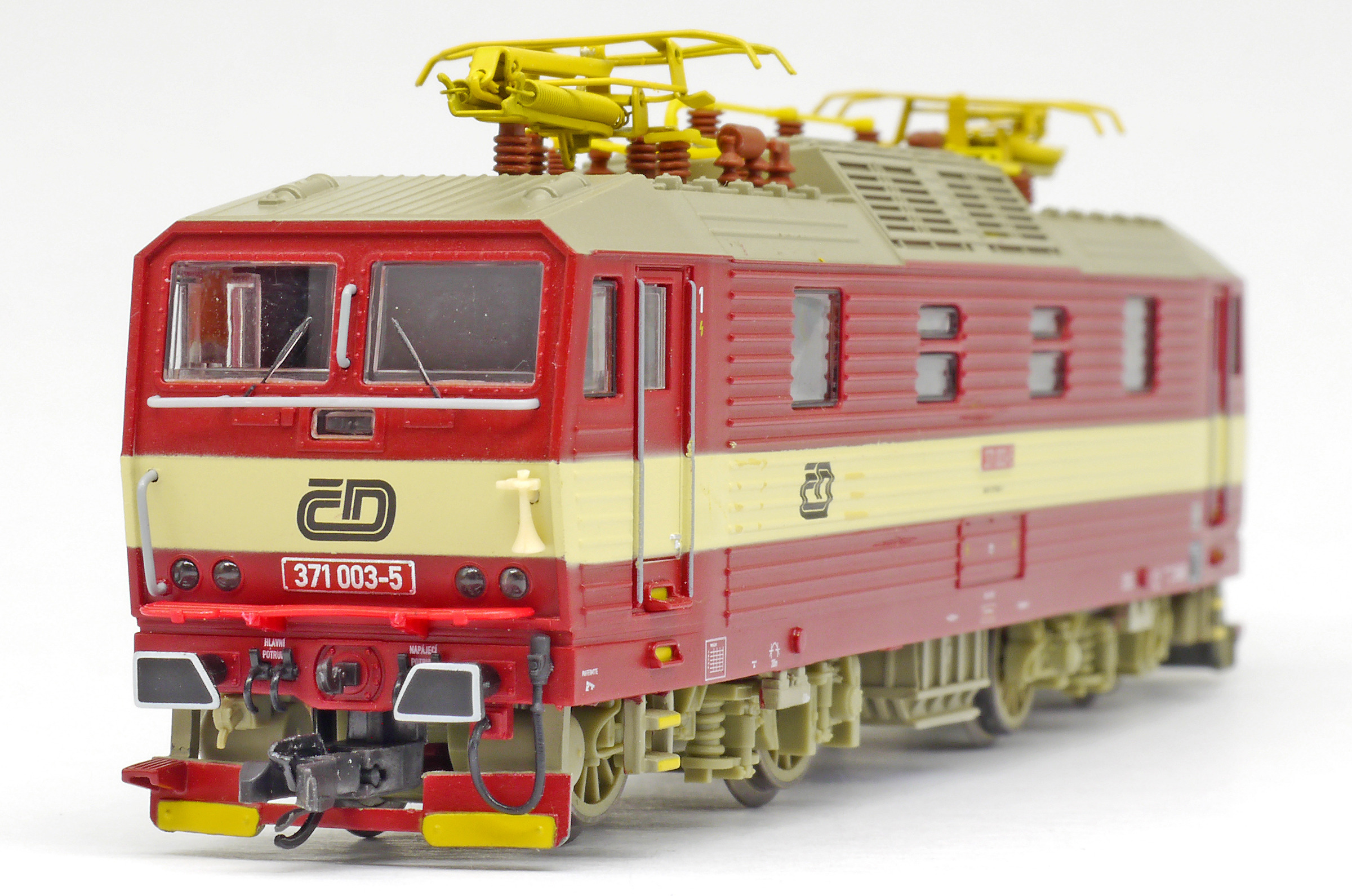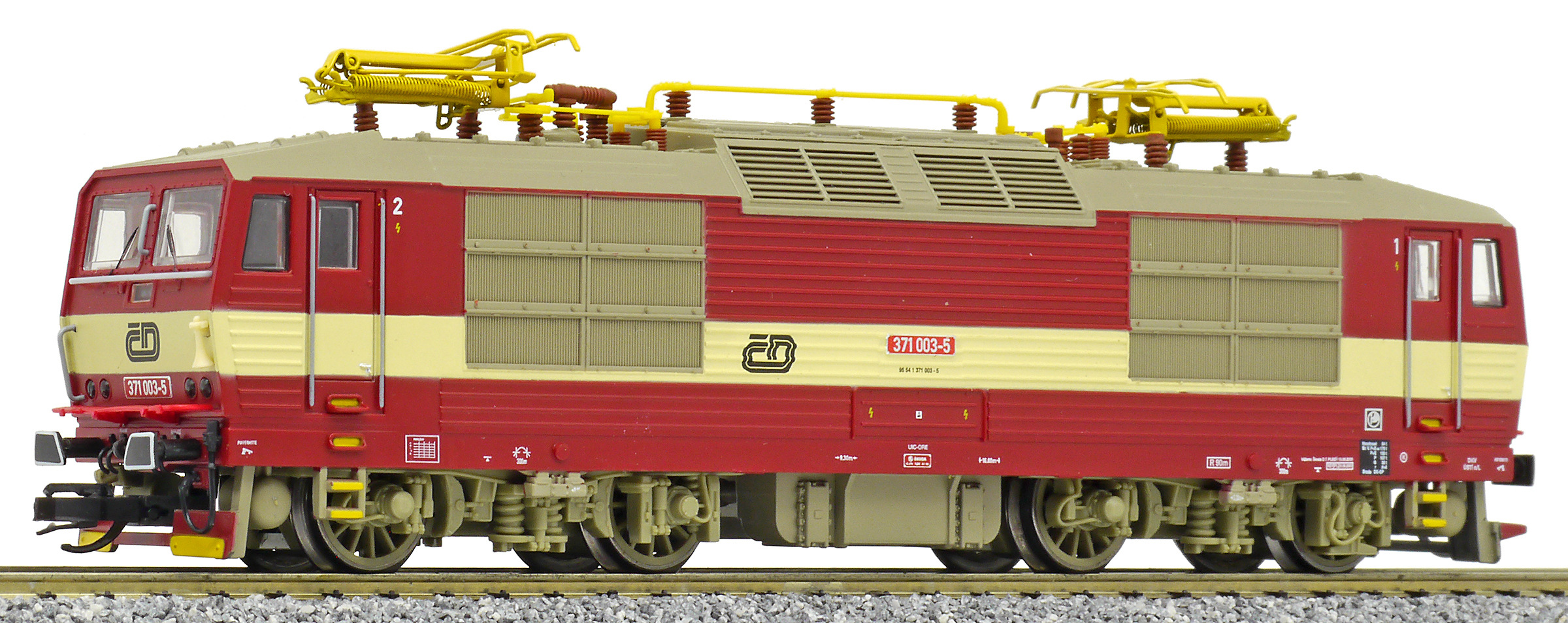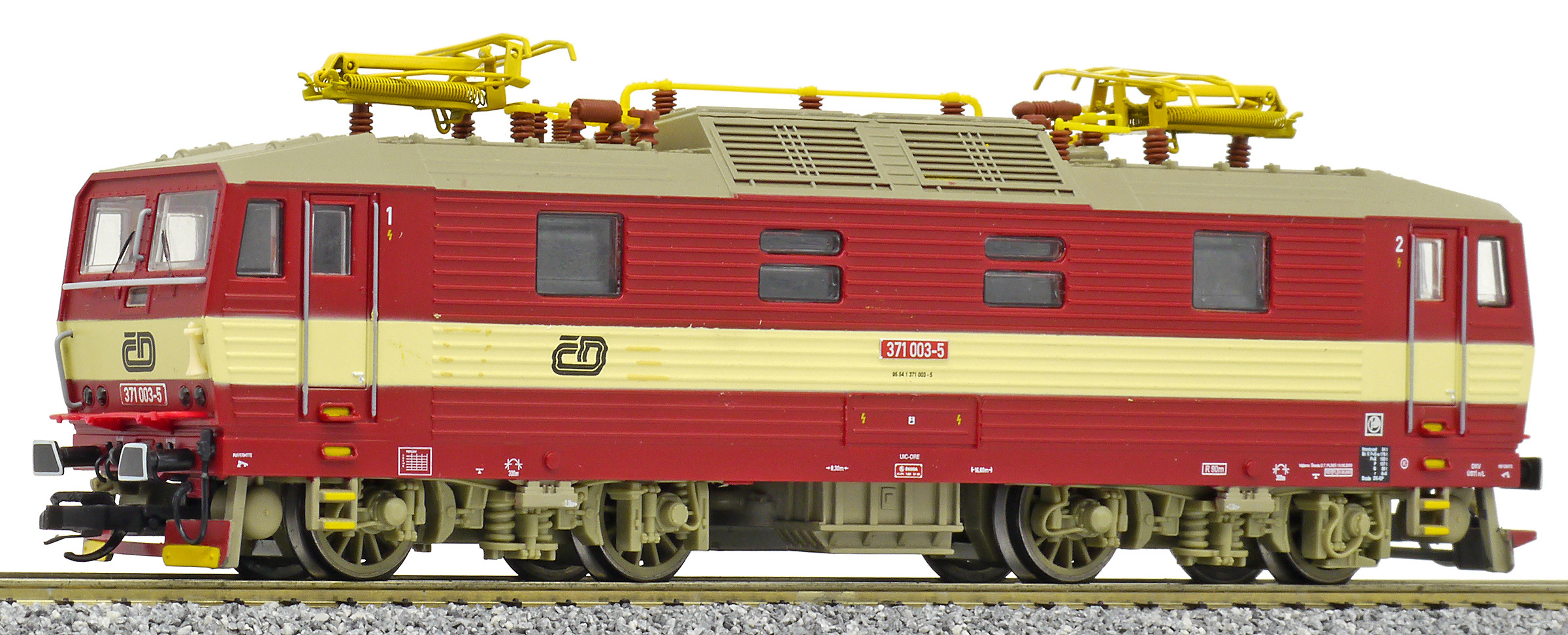 | elektrická lokomotiva červená s krémovým pruhem, šedá střecha a žluté polopantografy |