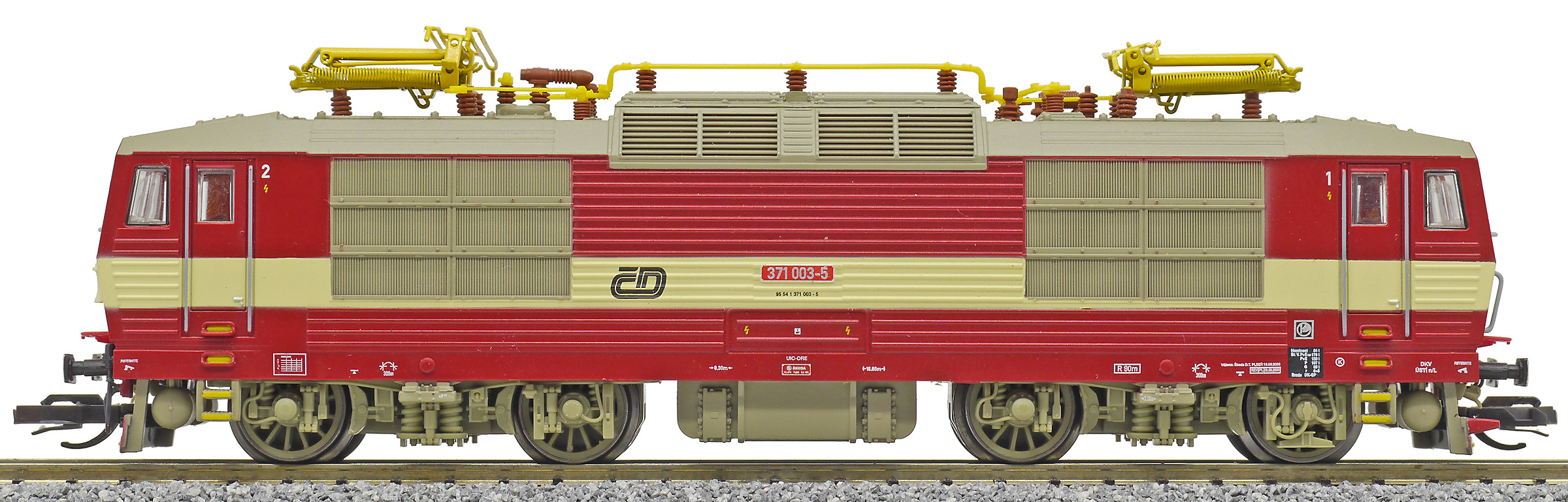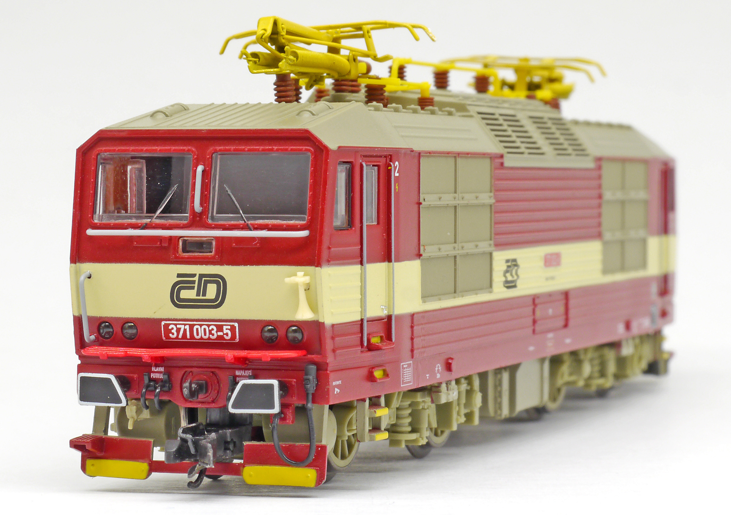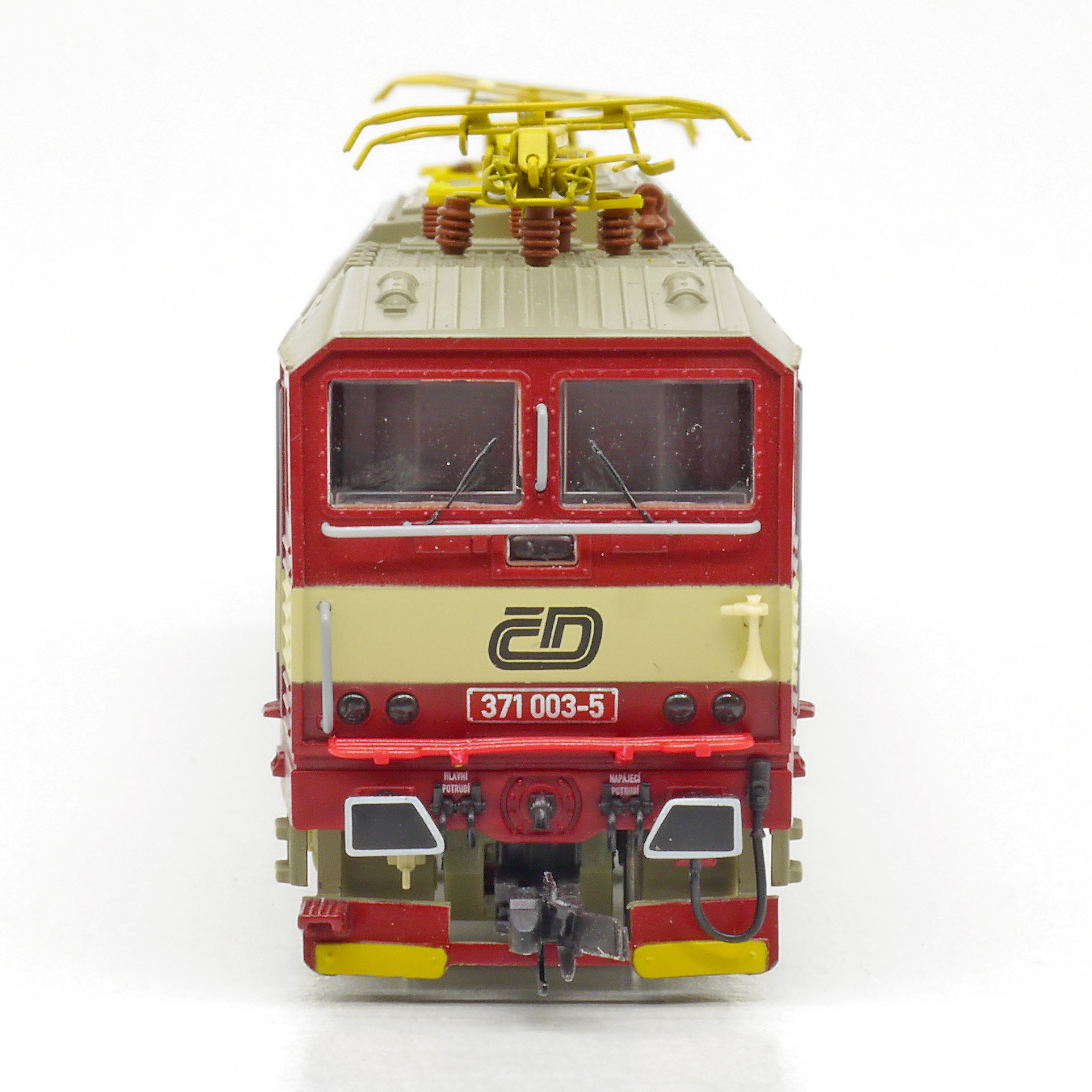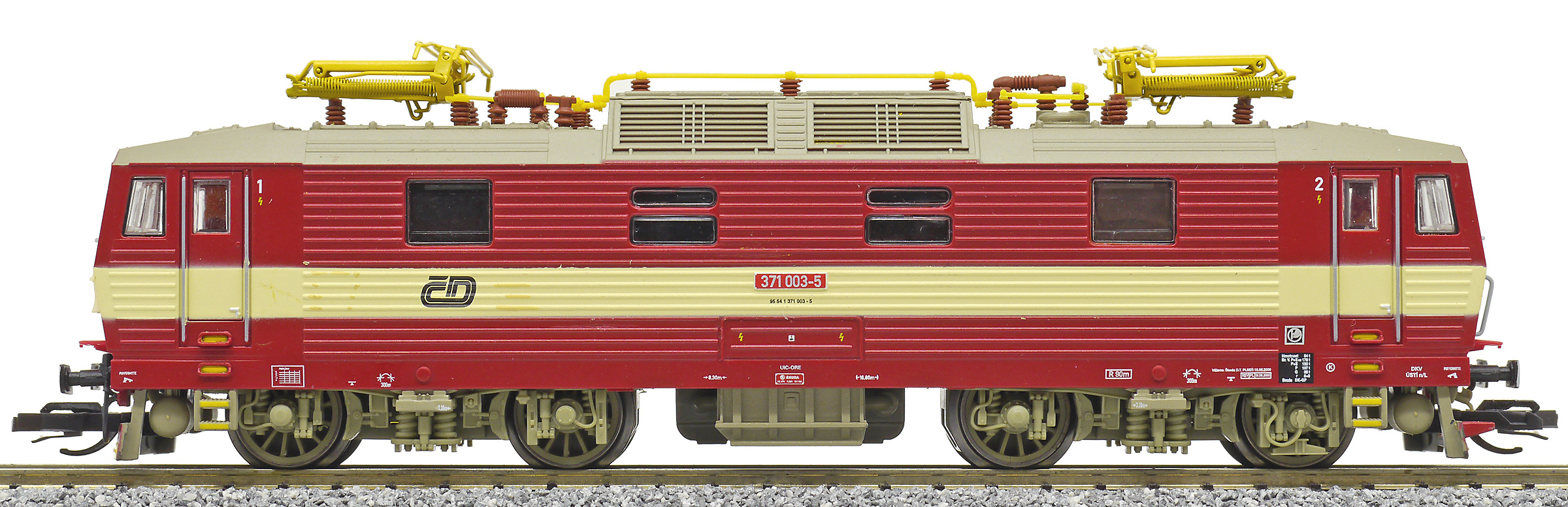 | elektrická lokomotiva červená s krémovým pruhem, šedá střecha a žluté polopantografy |