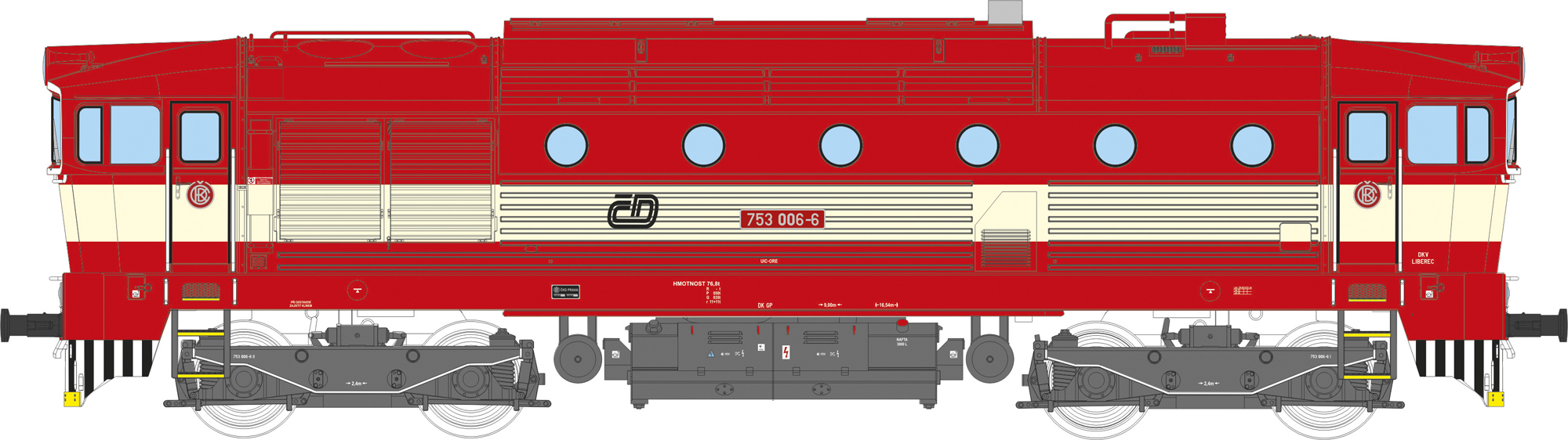 měřítko 1:120 - rozchod kolejí 12 mm osvětlení - 3 reflektory vpředu, 2 světla vzadu, přepínatelné podle směru jízdy 4 hnané nápravy 2 bandážované nápravy kinematika krátkého spřáhla (KKK) podle normy NEM 358 digitální rozhraní podle NEM 662 s konektorem Next18 setrvačník 138 mm - celková délka modelu přes nárazníky 4 - celkový počet náprav nebo rozložení náprav