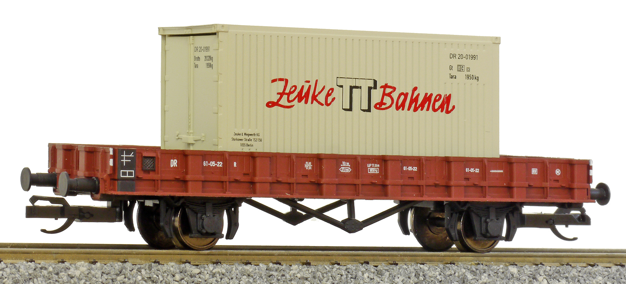 | nízkostěnný nákladní vůz červenohnědý s kontejnerem „Zeuke TT Bahnen“ |