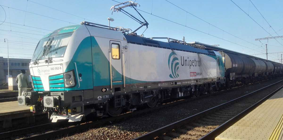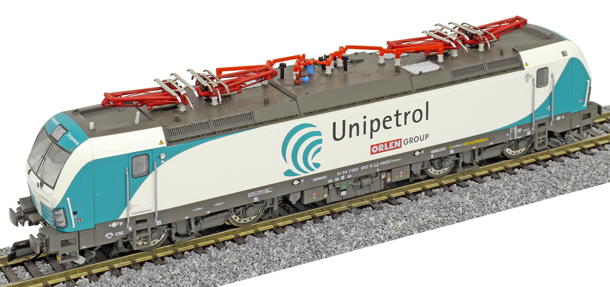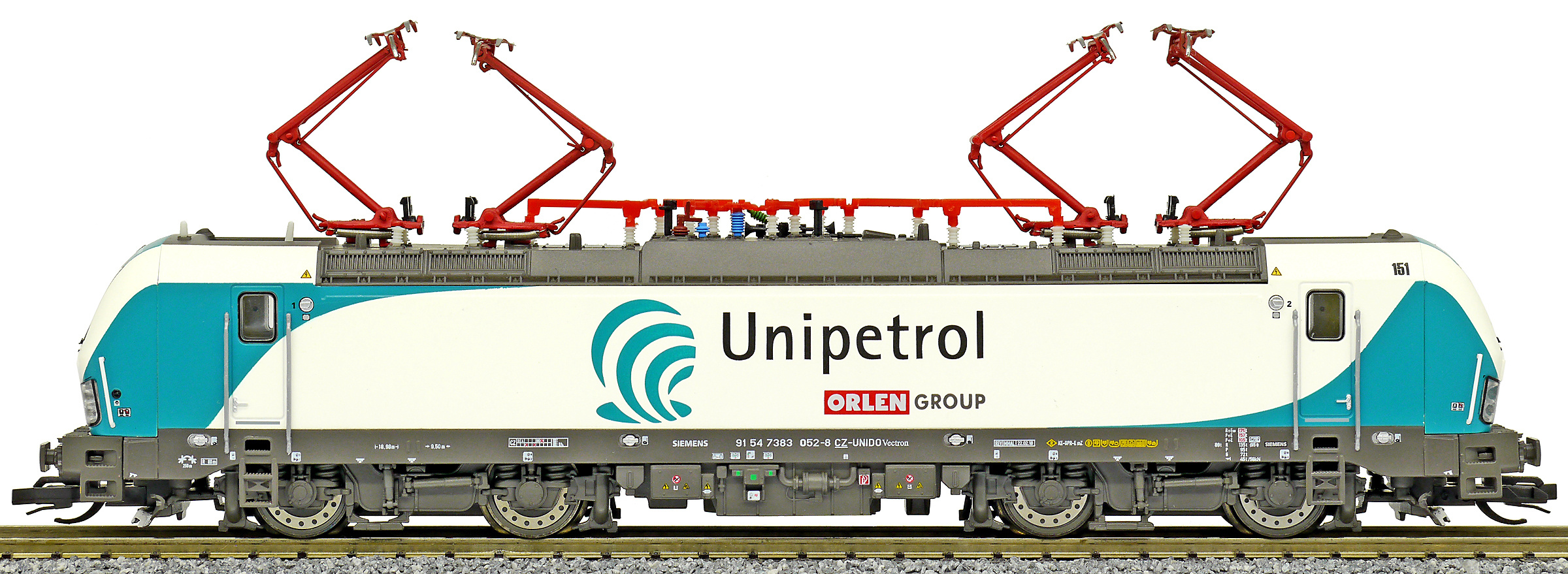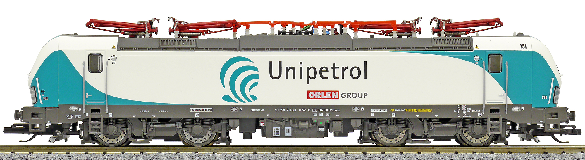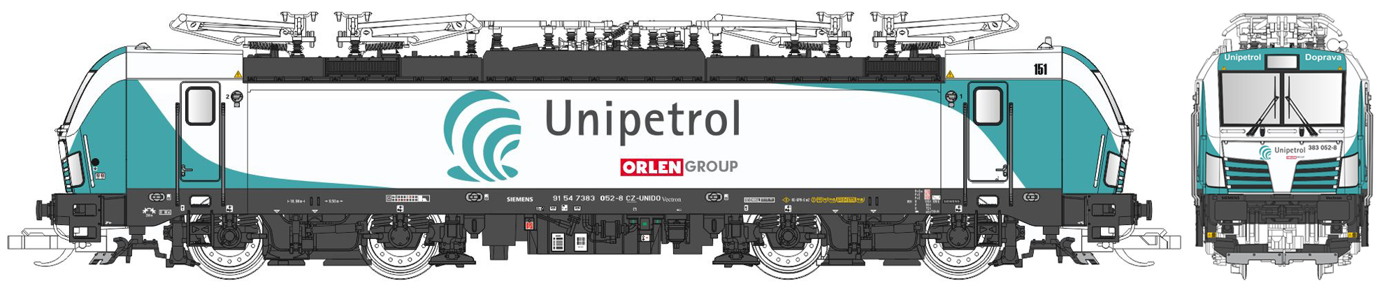| elektrická lokomotiva v barevném schematu „Unipetrol“ |