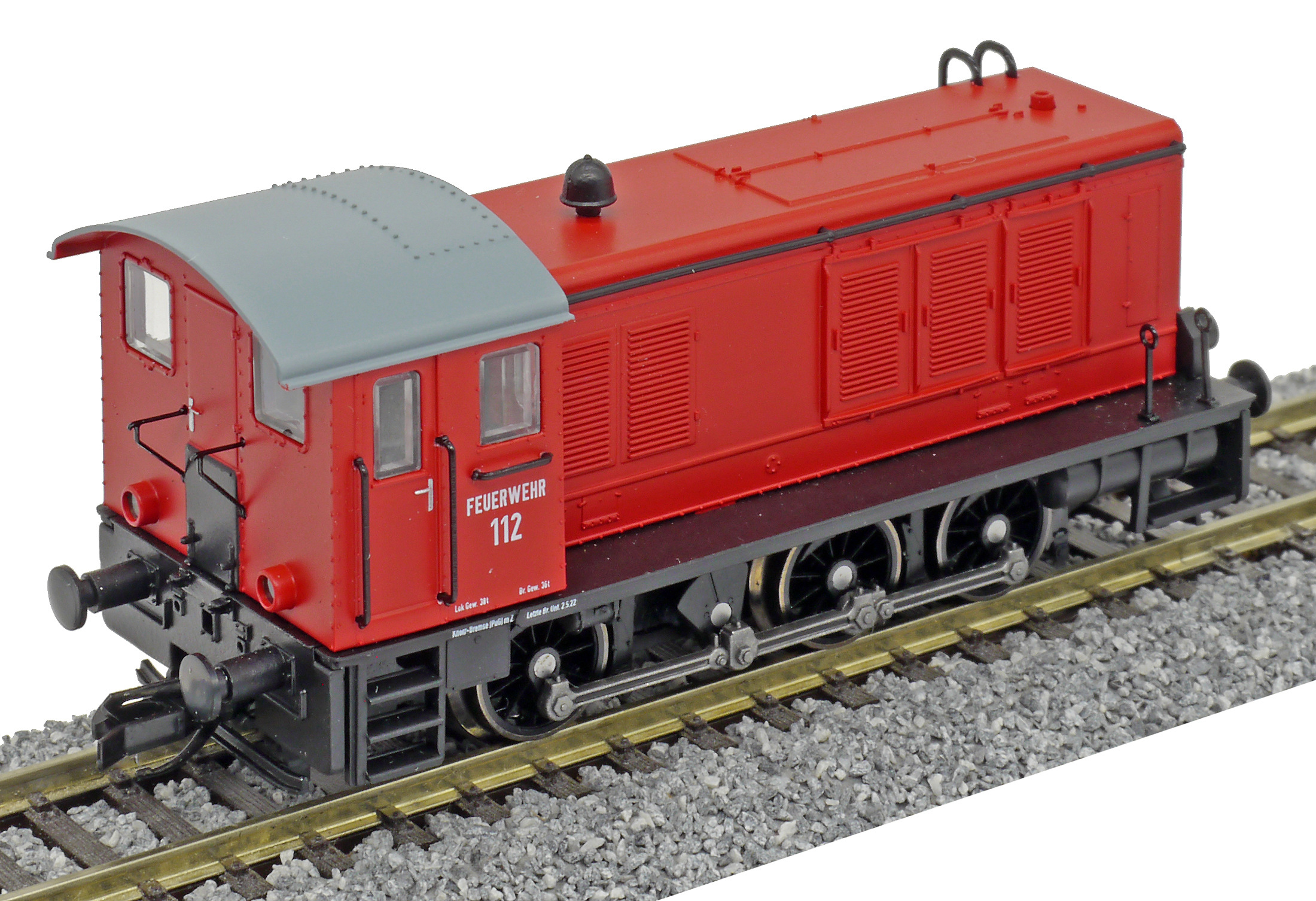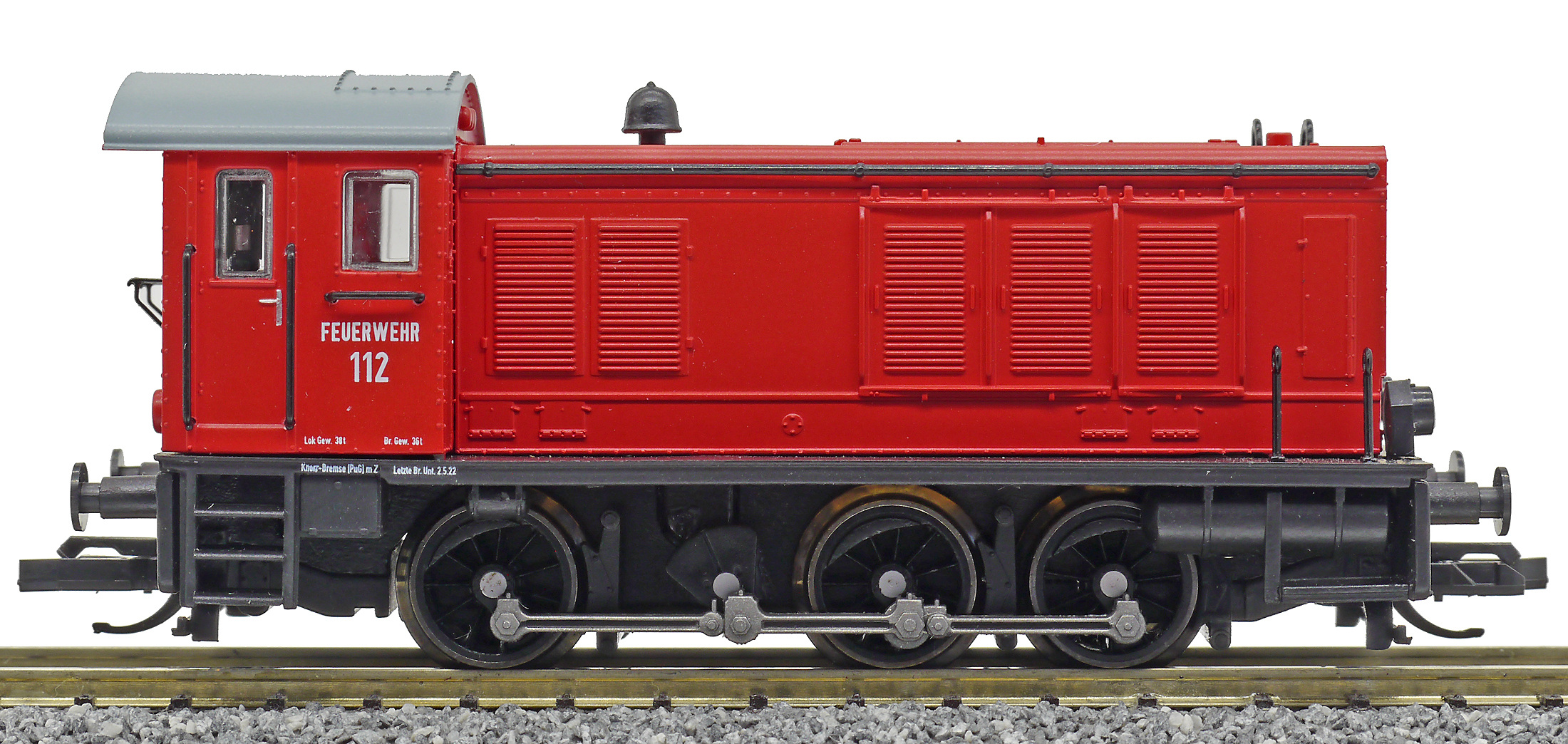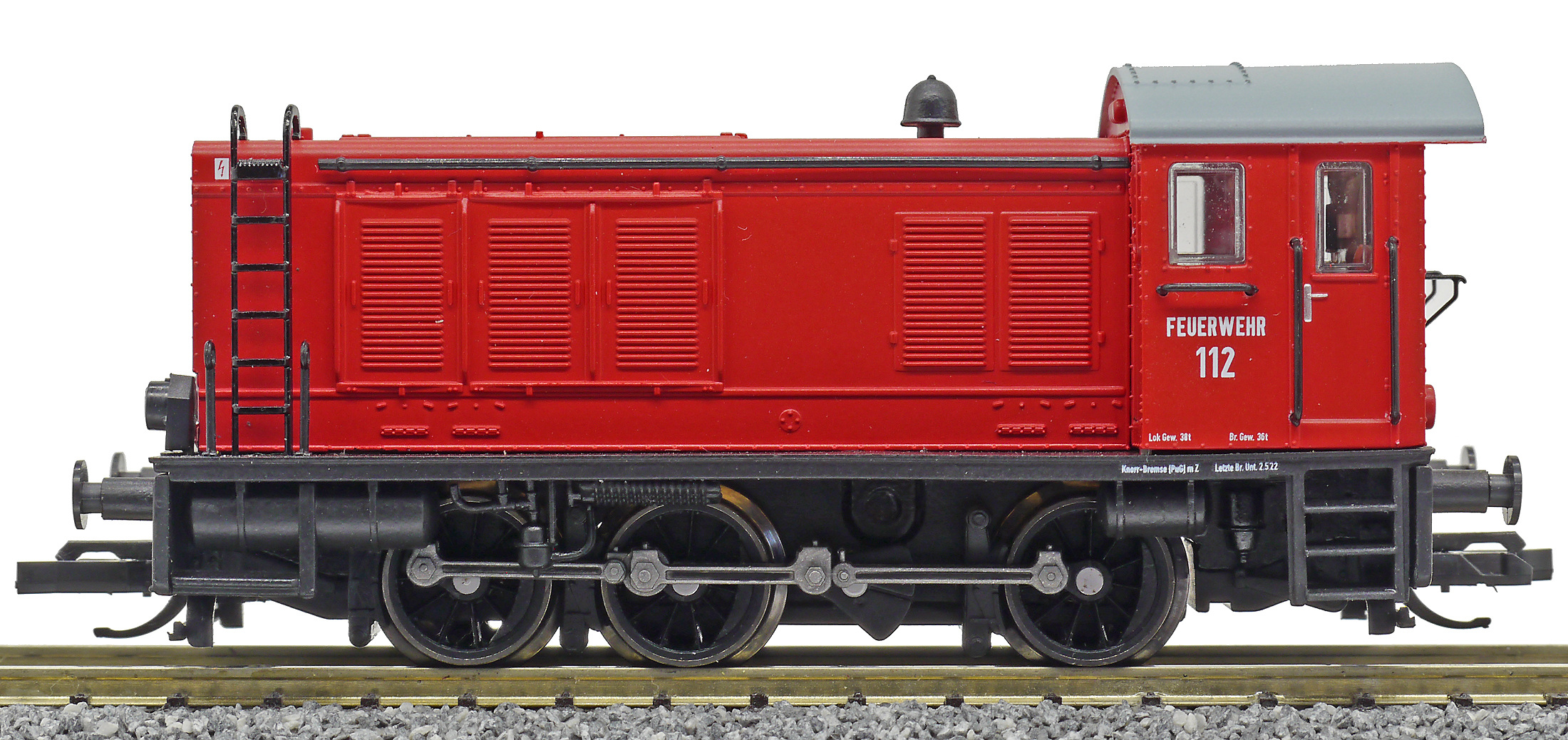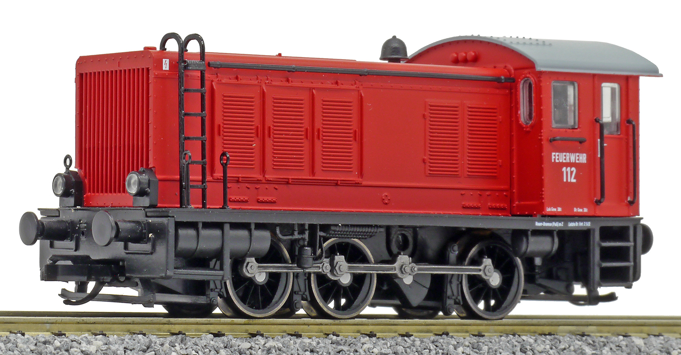 | dieselová lokomotiva červená s šedou střechou, černý rám a pojezd „Feuerlöschzu“ |