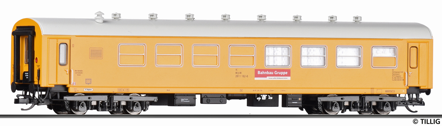 | doprovodný vůz žlutý s šedou střechou do pracovního vlaku „Bahnbau Gruppe“ |