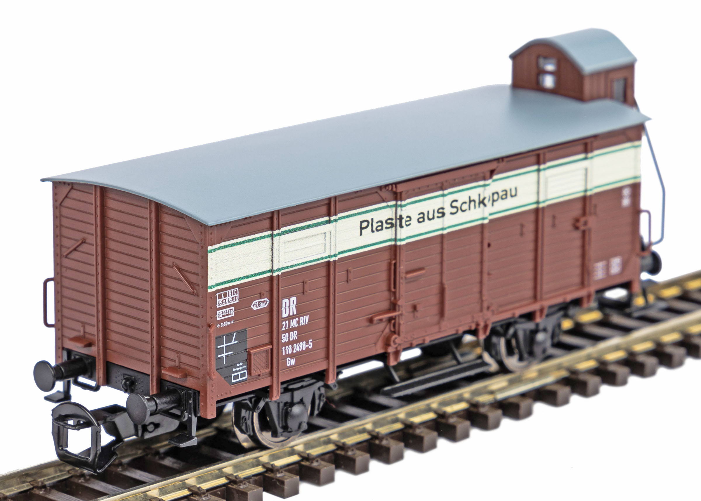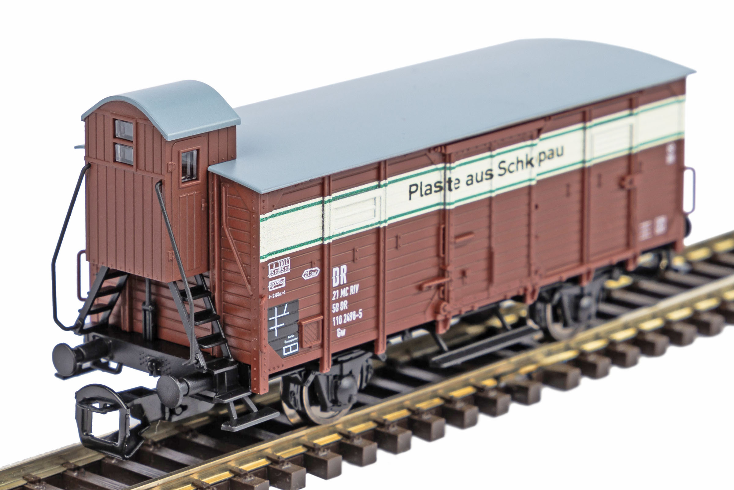 | krytý nákladní vůz červenohnědý s šedou střechou a s brzdařskou budkou „Plaste aus Schkopau“ |
