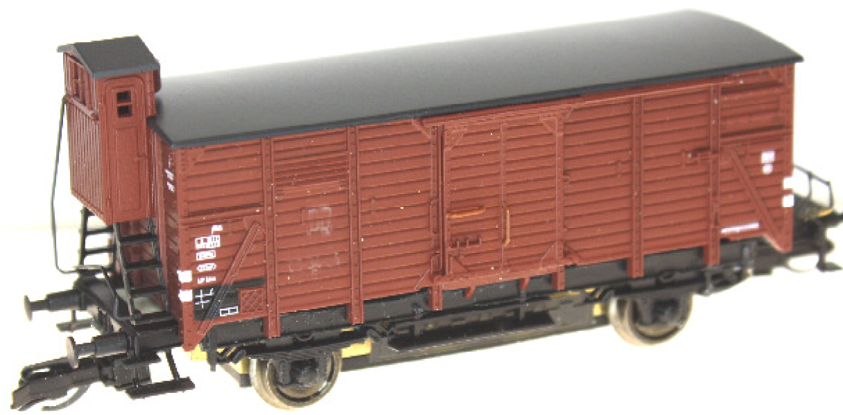| krytý nákladní vůz červenohnědý s brzdařskou budkou |