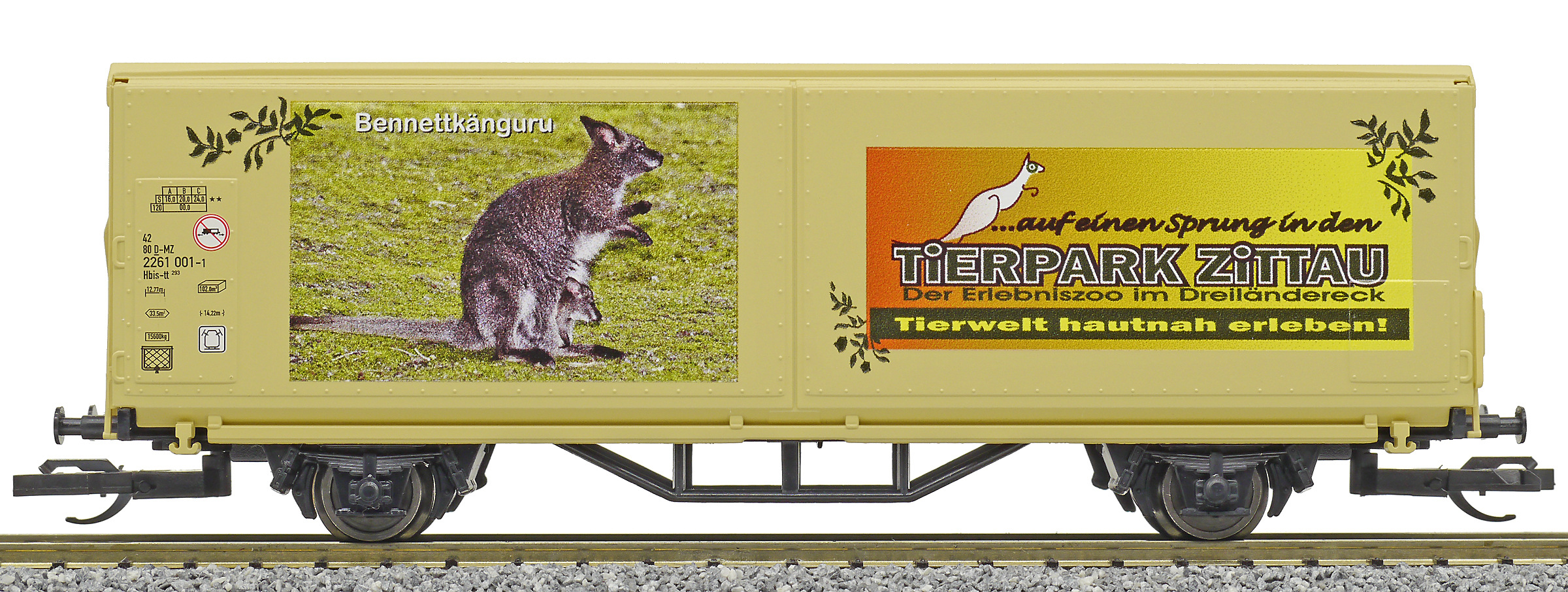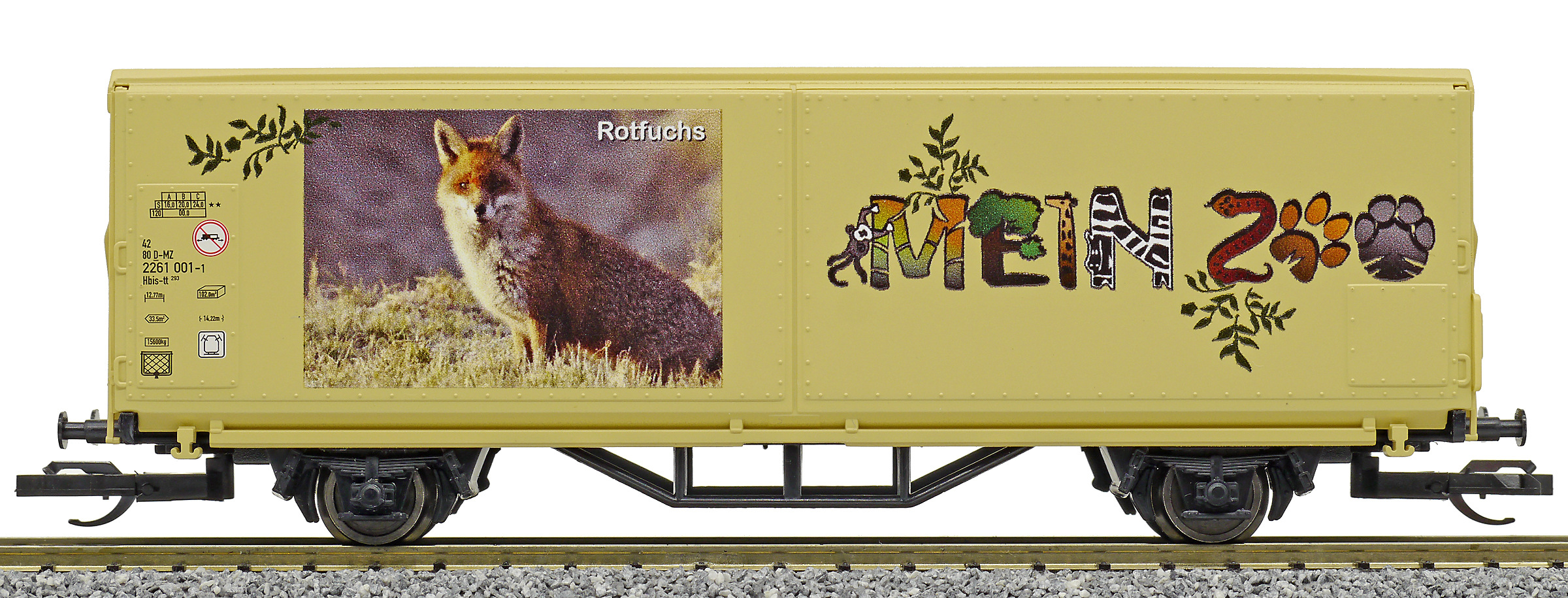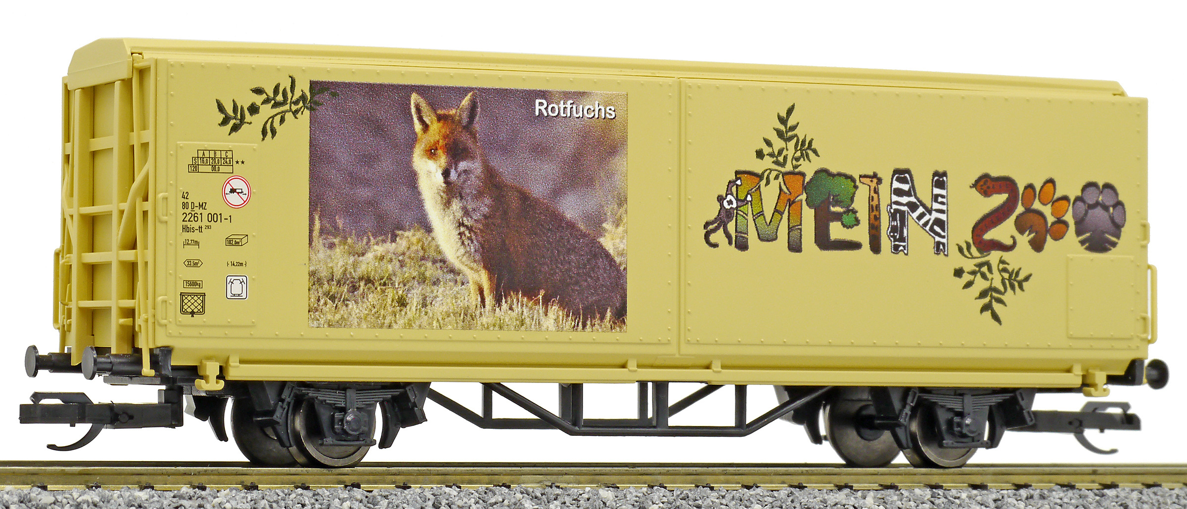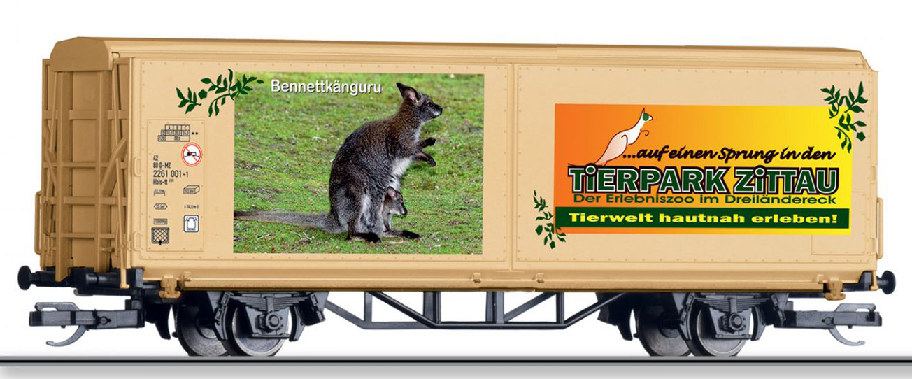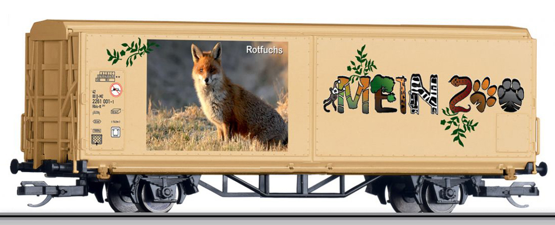 | krytý nákladní vůz s posuvnými stěnami a s reklamním potiskem „Mein Zoo” |