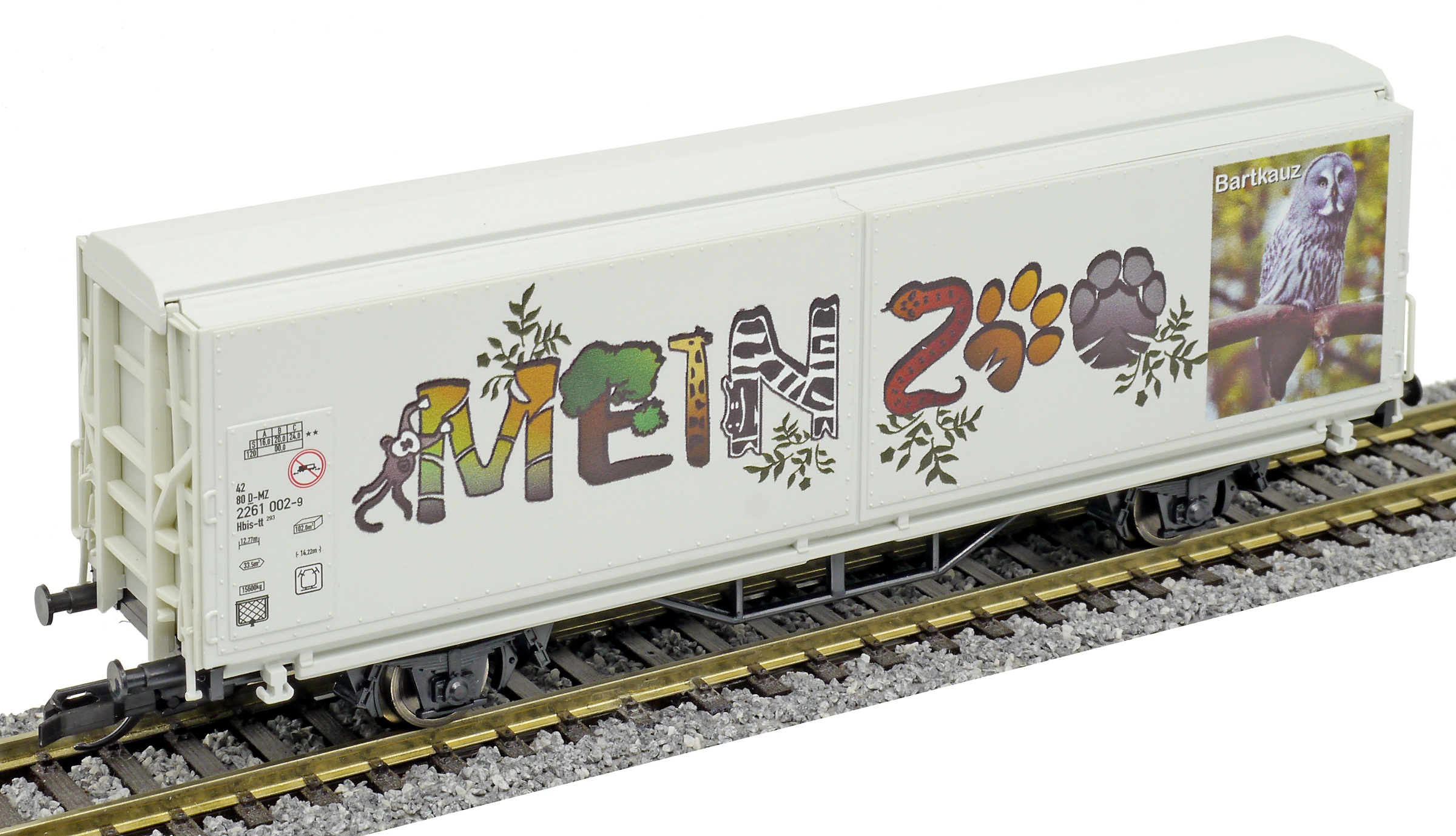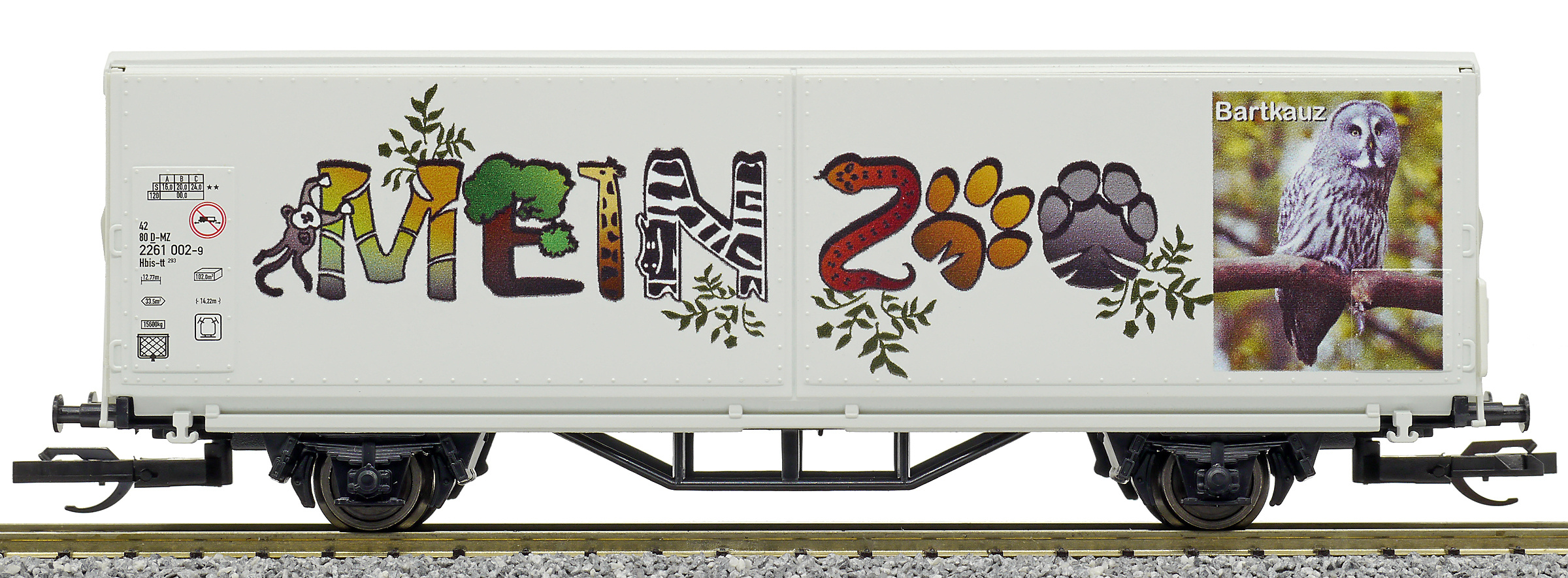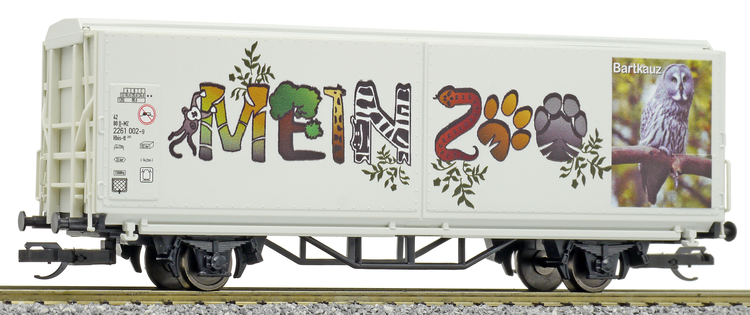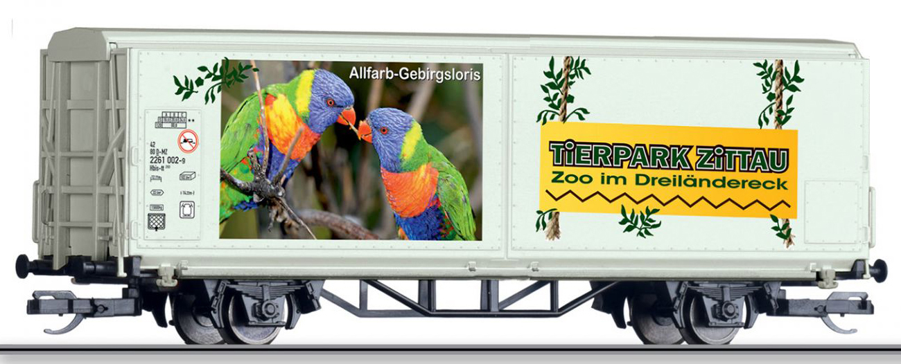 | krytý nákladní vůz s posuvnými stěnami a s reklamním potiskem „Mein Zoo” |