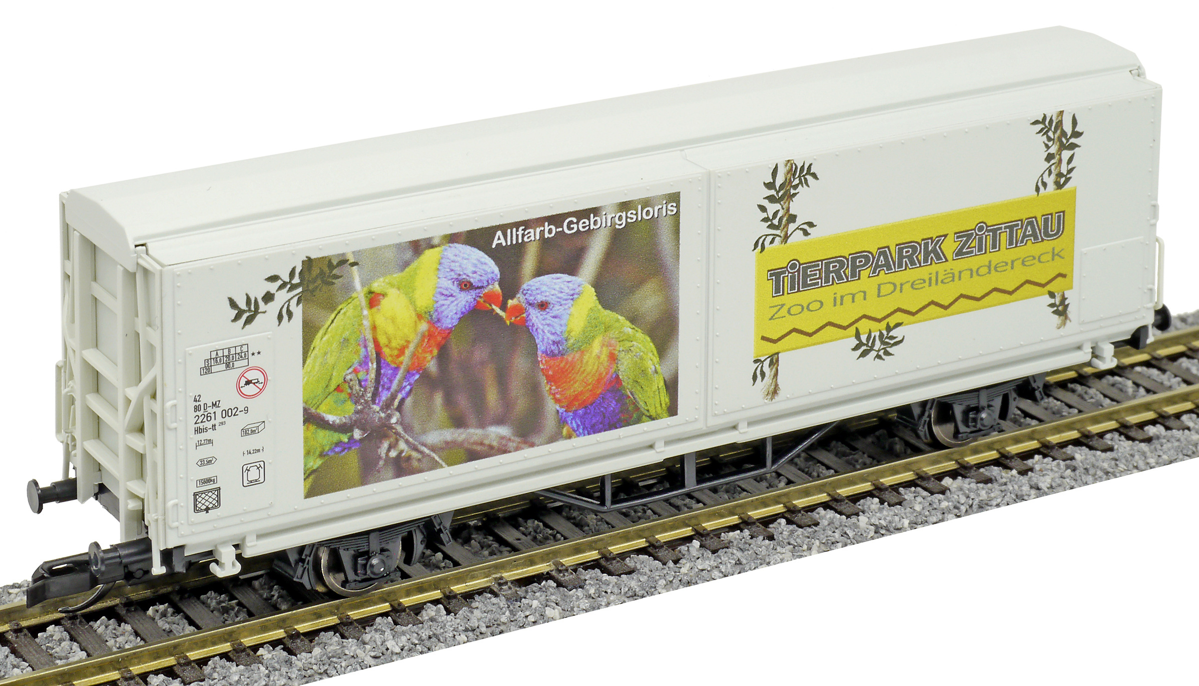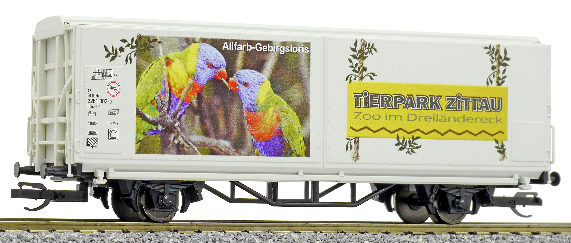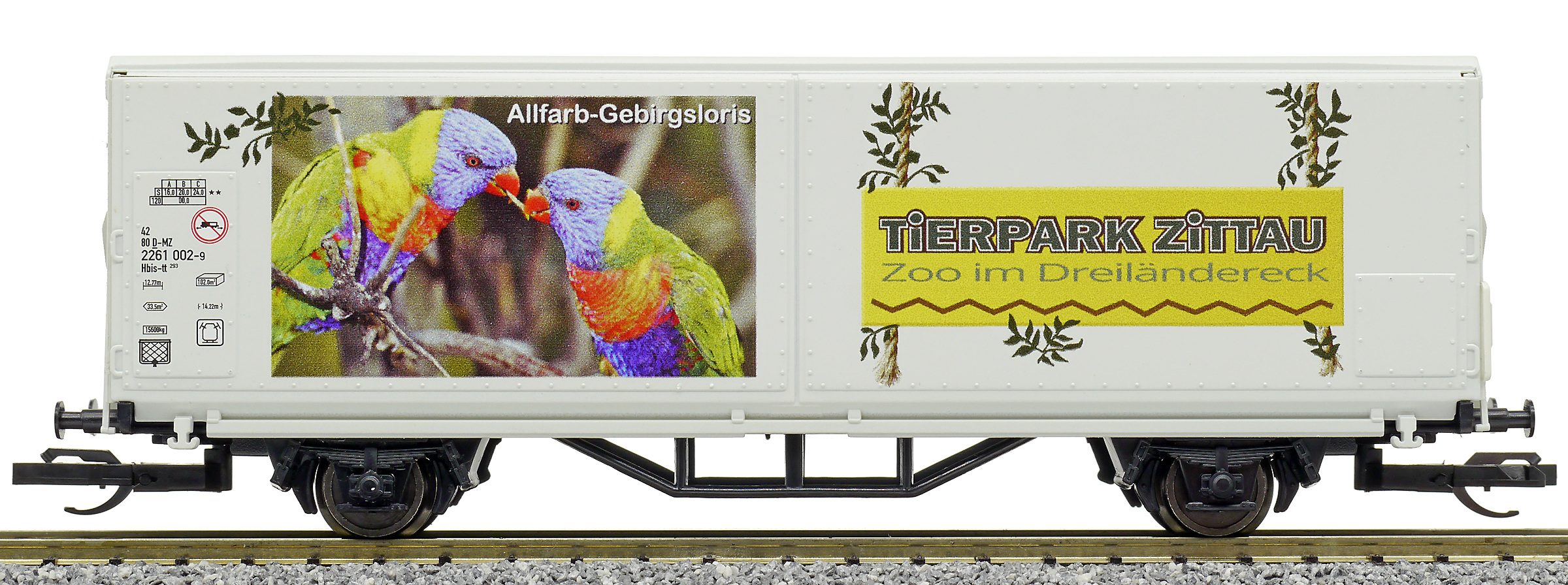 | krytý nákladní vůz s posuvnými stěnami a s reklamním potiskem „Mein Zoo” |