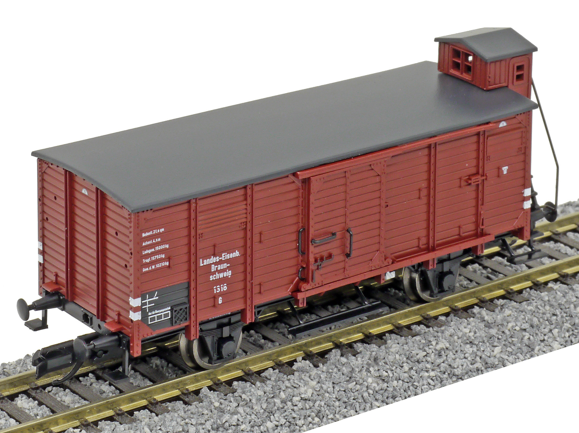 krytý nákladní vůz červenohnědý s černou střechou a s brzdařskou budkou