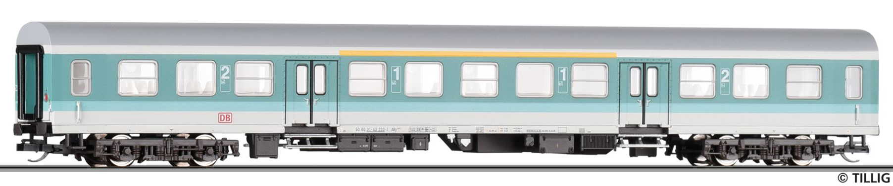 Popis   osobní vůz v barevném kombinaci tyrkysová-světle šedá 1./2. tř.