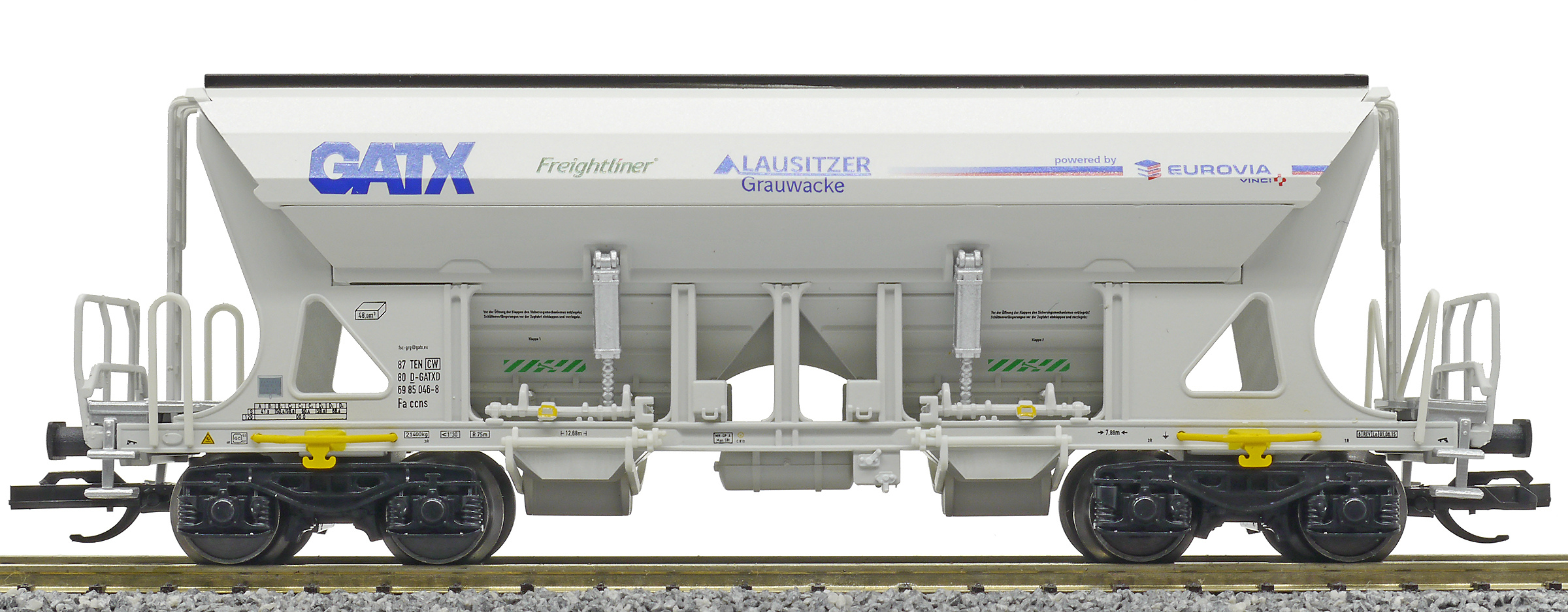 | nákladní samovýsypný vůz šedý s potiskem „Eurovia/Freightliner“ |