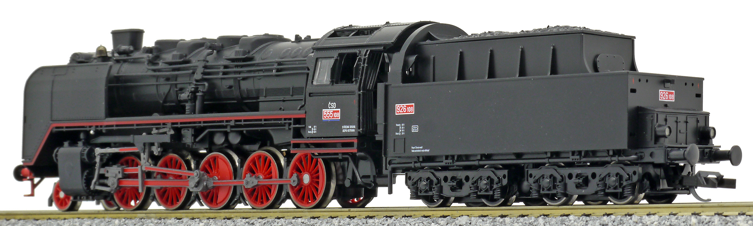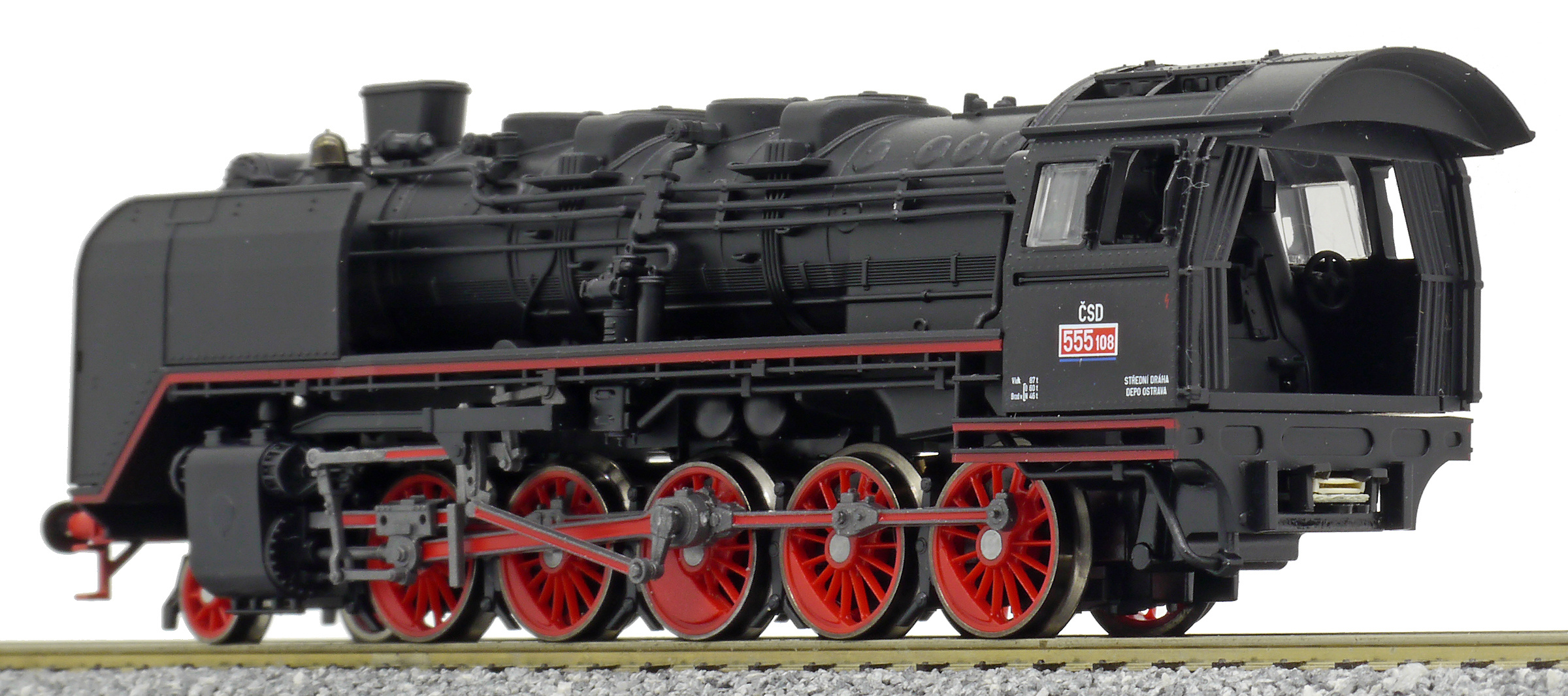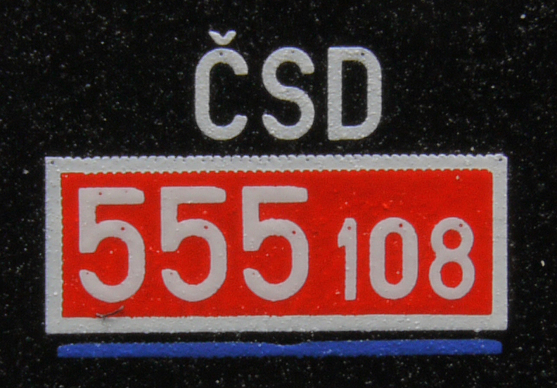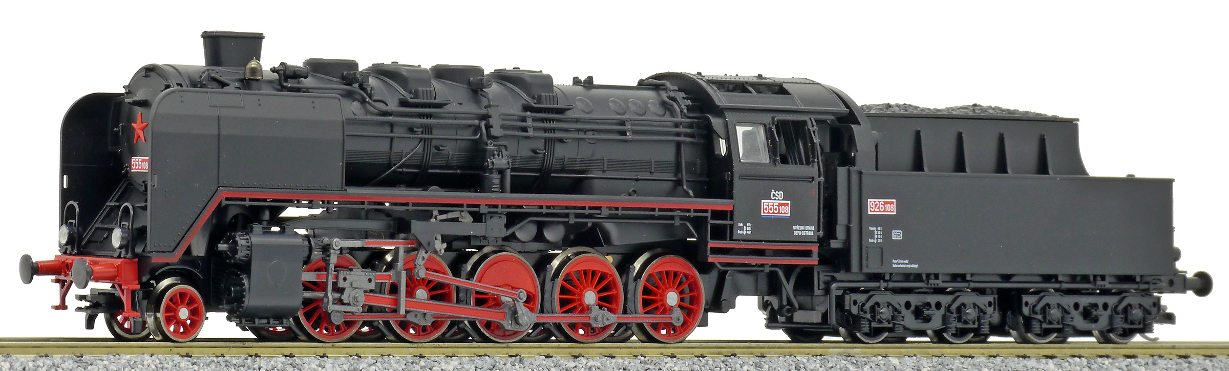 Popis   parní lokomotiva černá s kouřovými plechy, červená kola, velká rudá hvězda na dýmnici