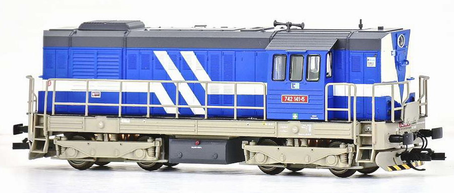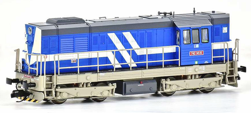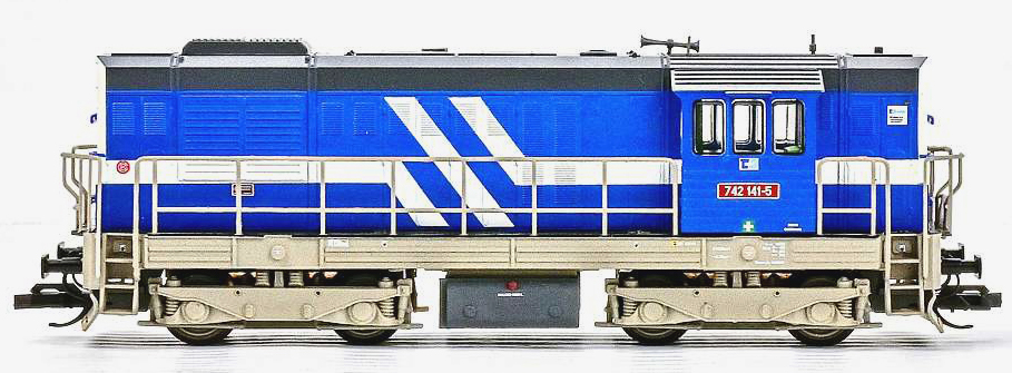 | dieselová lokomotiva modrá-bílá, tmavě šedá střecha, šedý rám a pojezd |
