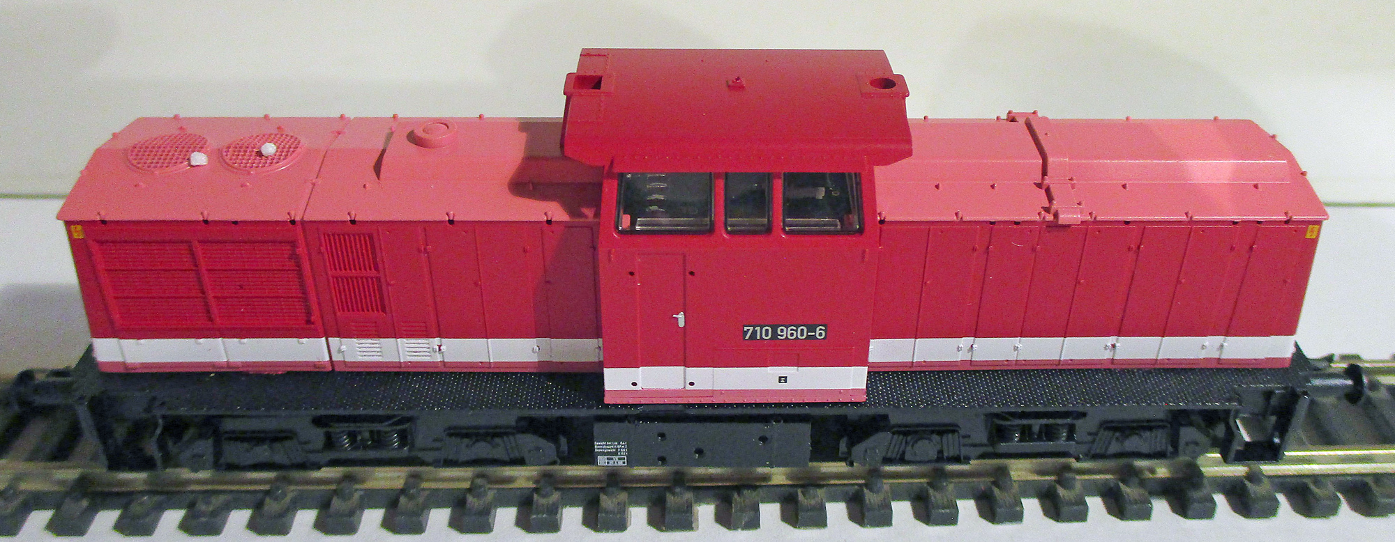 | dieselová lokomotiva červená s bílým proužkem a s pomocným pohonem |