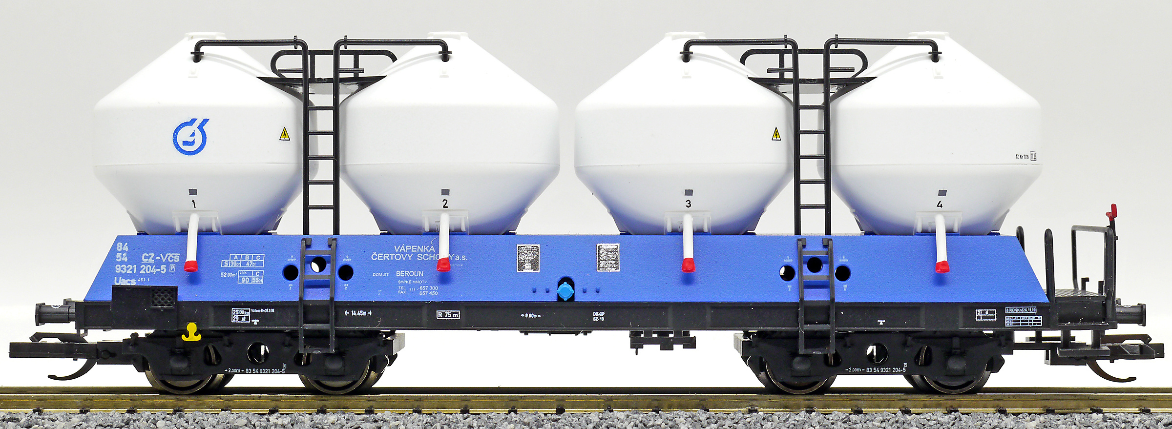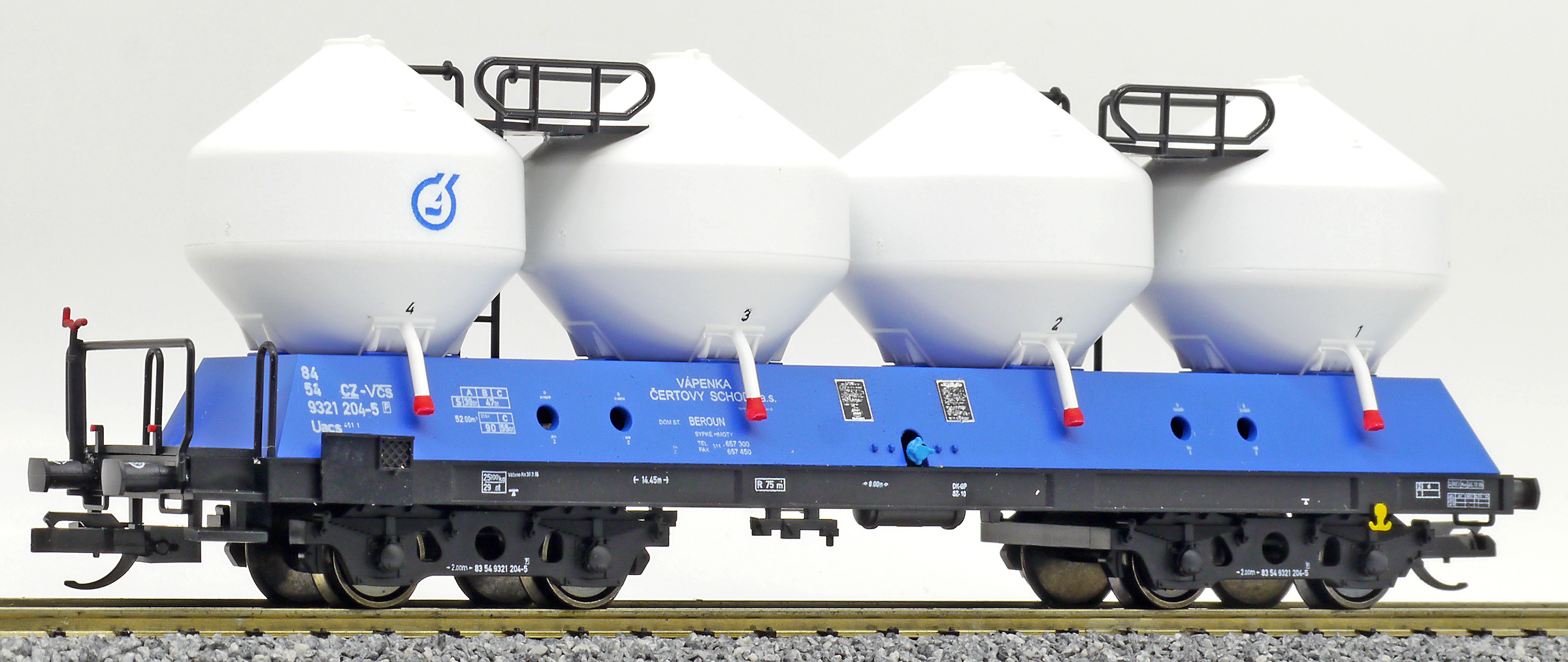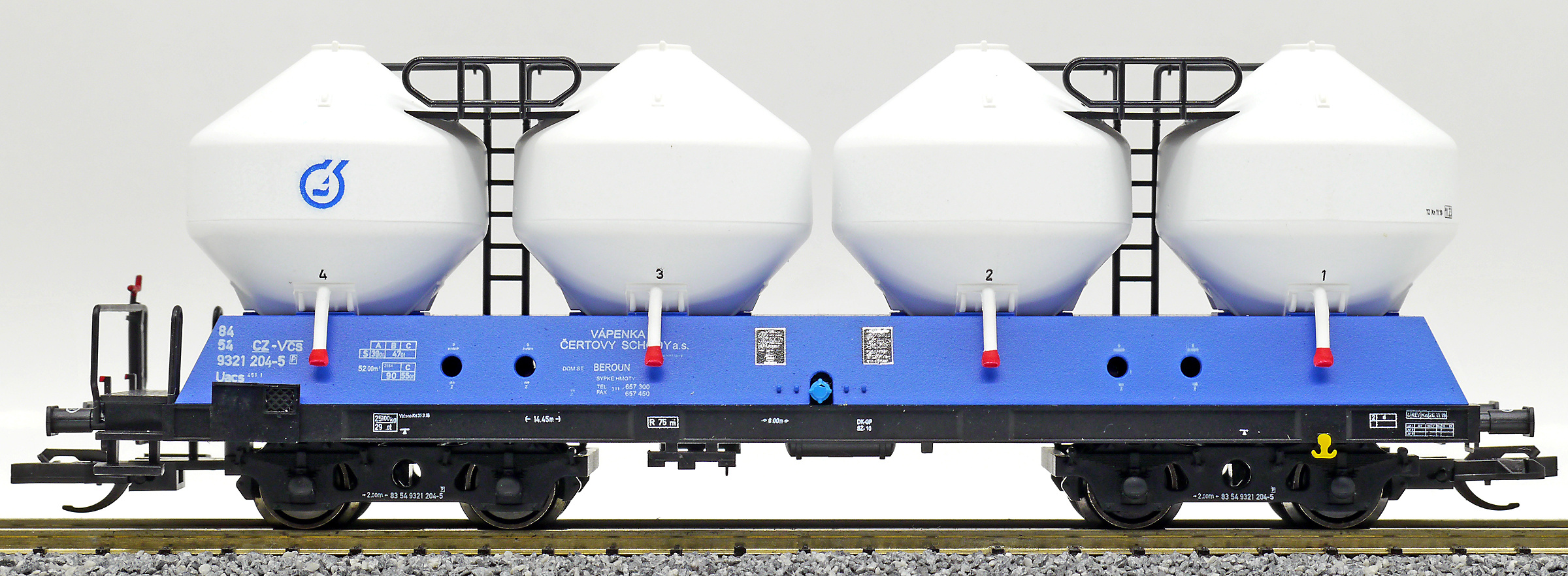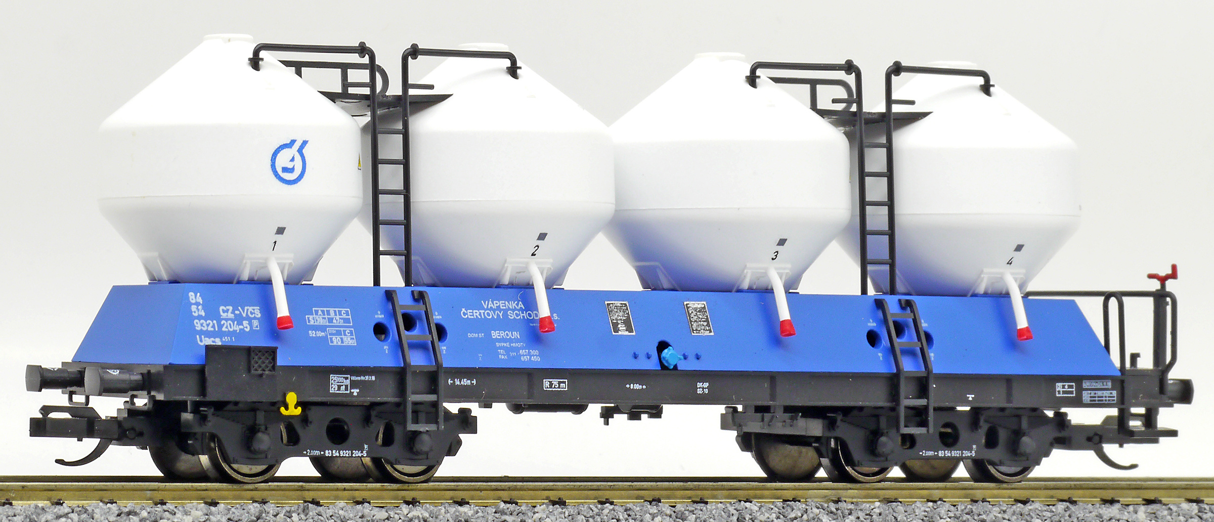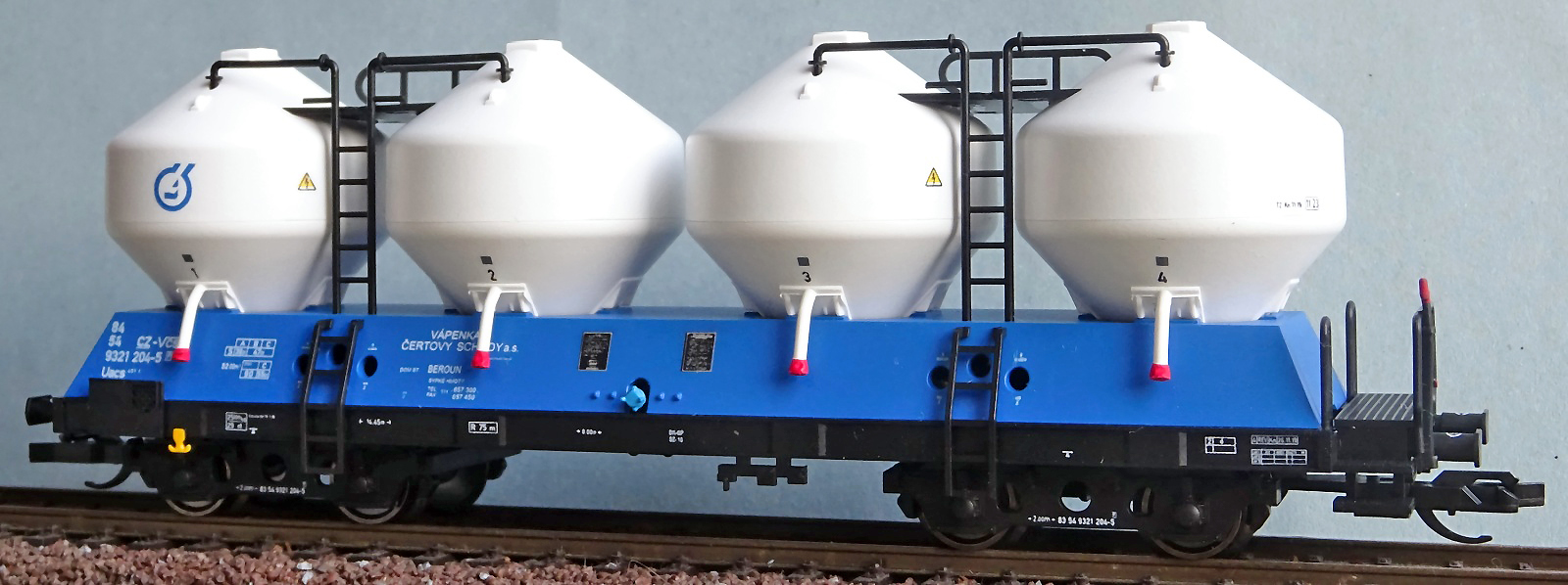 | nákladní samovýsypný vůz modrý s bílými nádobami „Vápenka Čertovy schody“ |