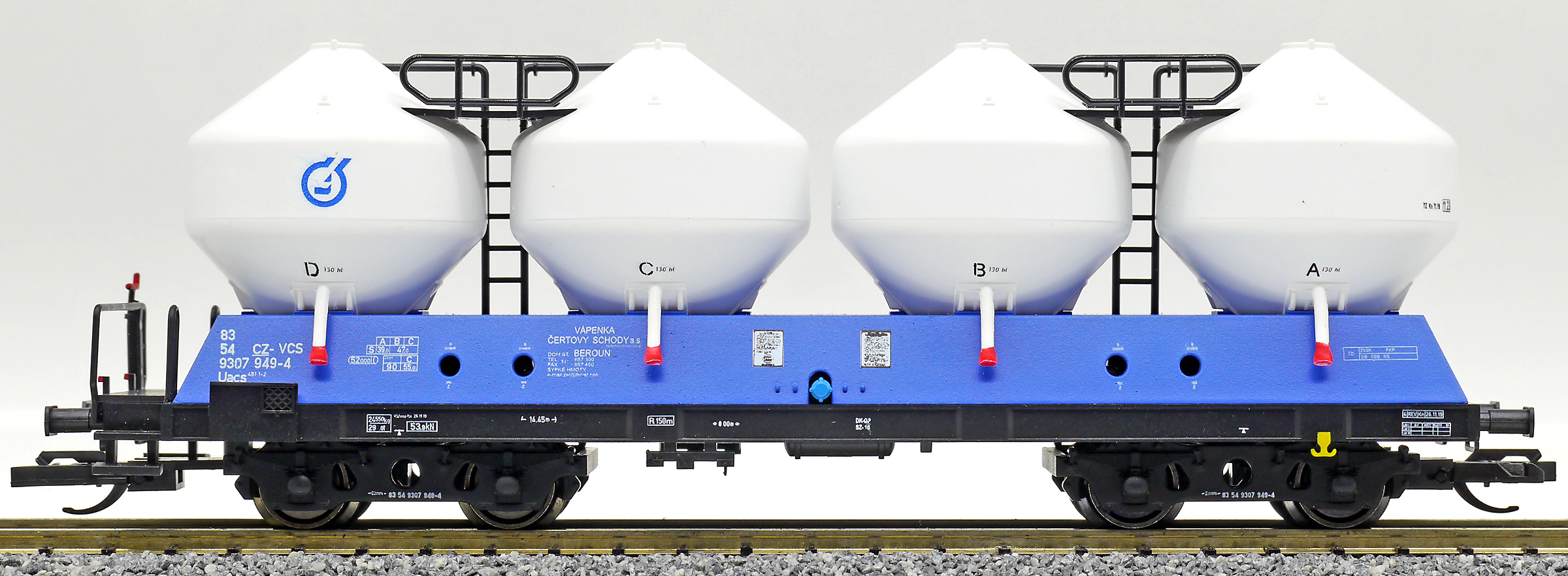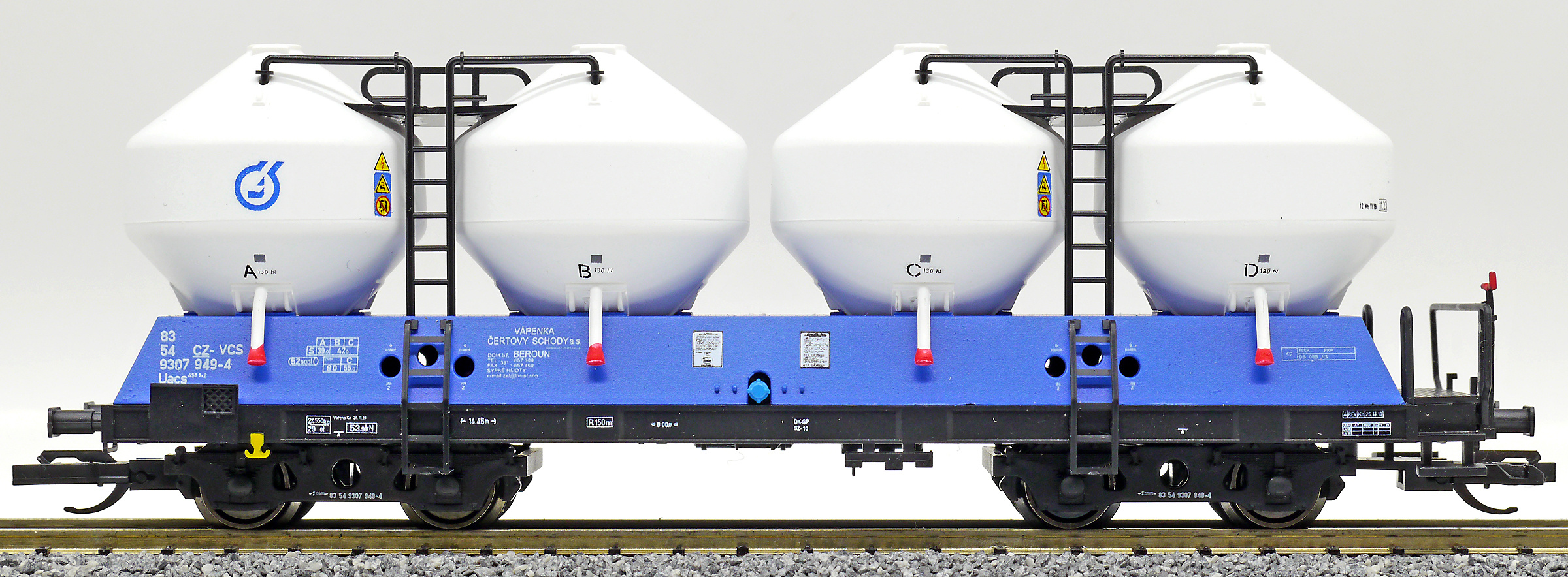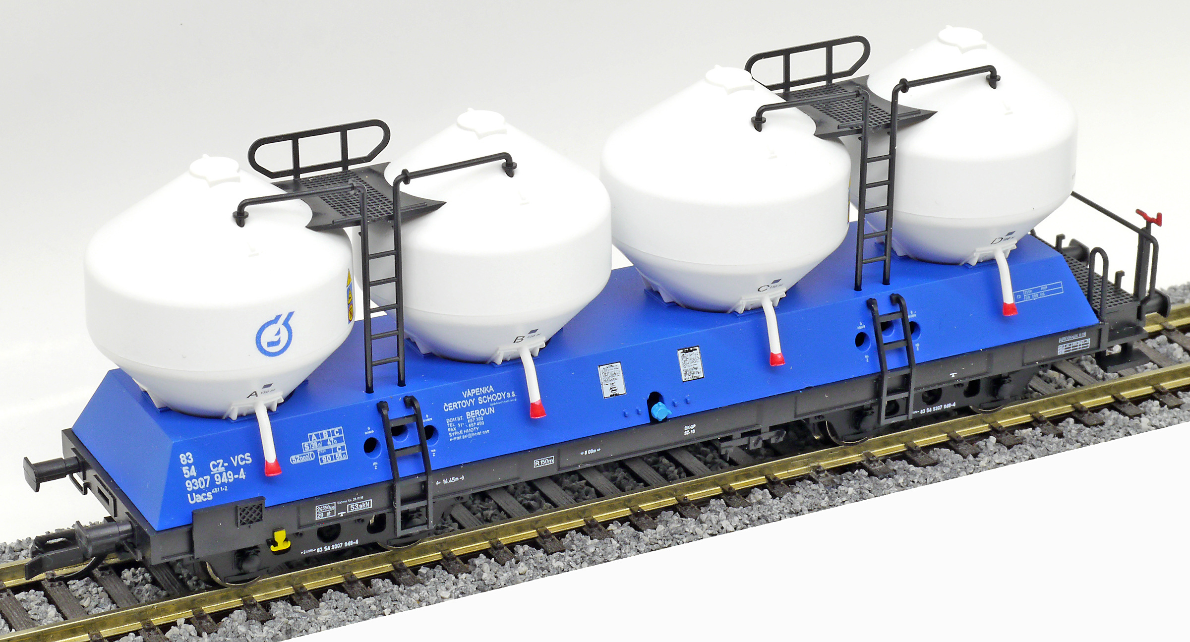 | nákladní samovýsypný vůz modrý s bílými nádobami „Vápenka Čertovy schody“ |