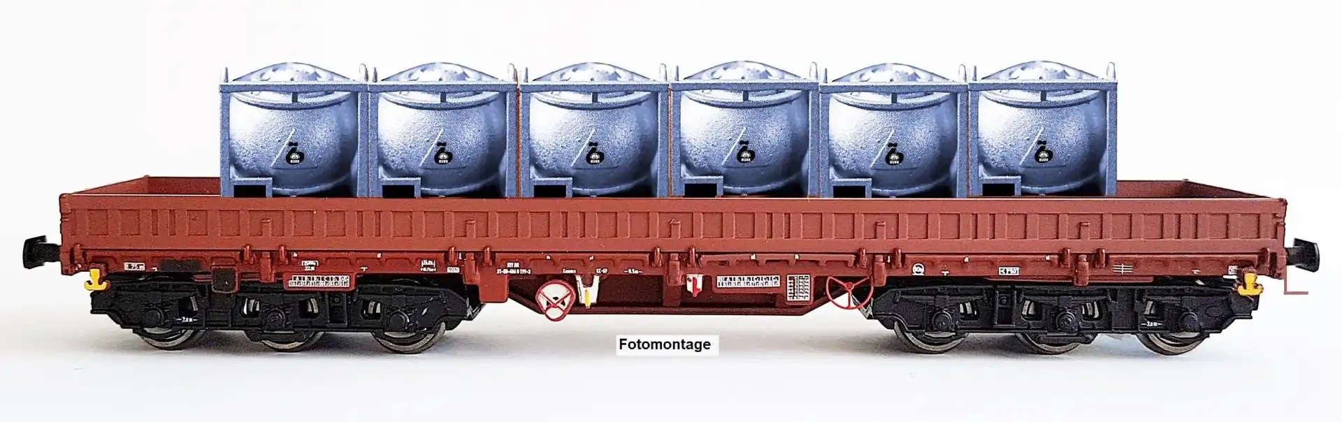 | nízkostěnný nákladní vůz červenohnědý s nákladem tanků na chemikálie „Chemische Werke Buna“ |