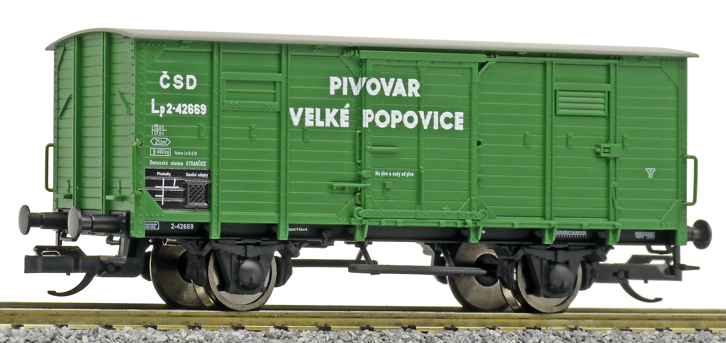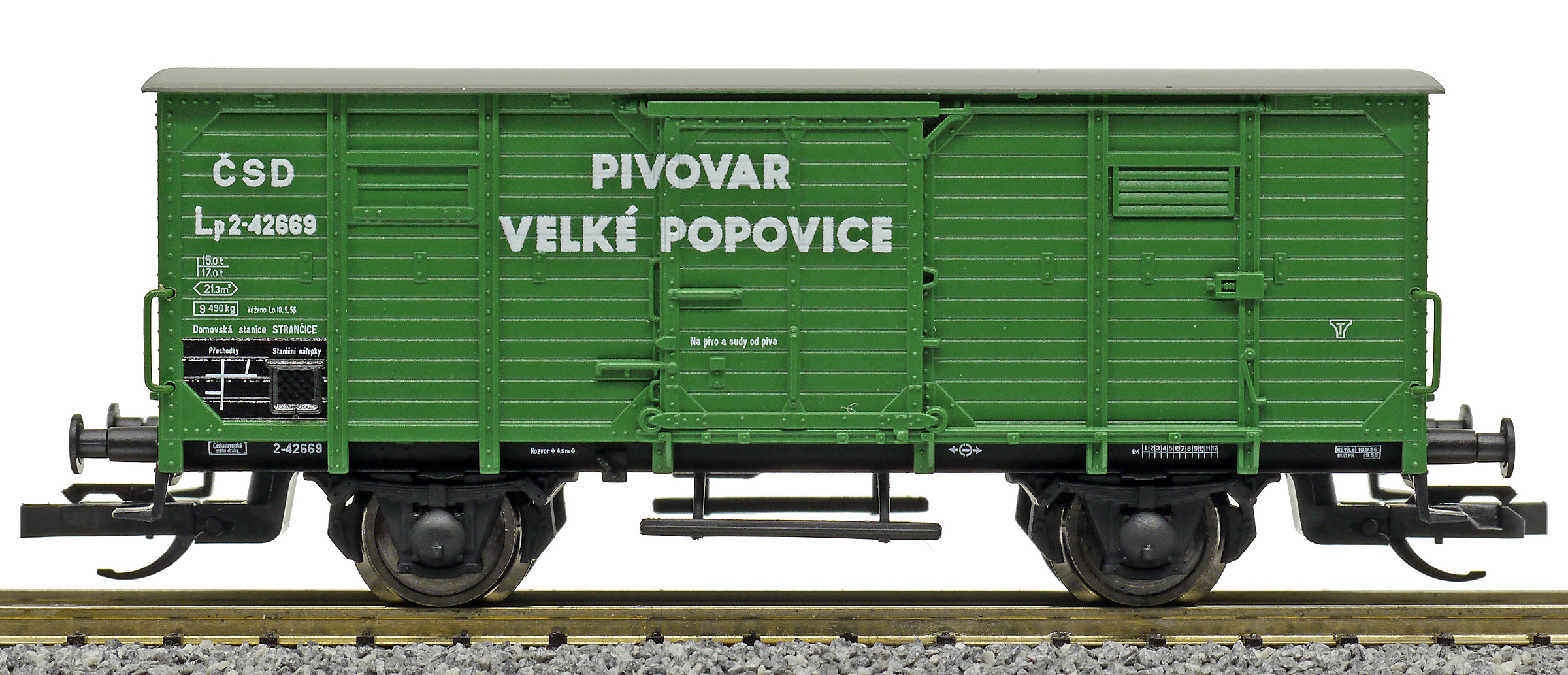 Popis   krytý nákladní vůz zelený s šedou střechou „PIVOVAR VELKÉ POPOVICE“