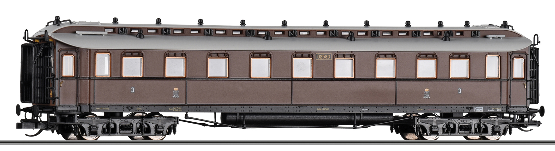 Popis   osobní vůz červený s šedou střechou „Preußischer Schnellzug“ 3. tř.