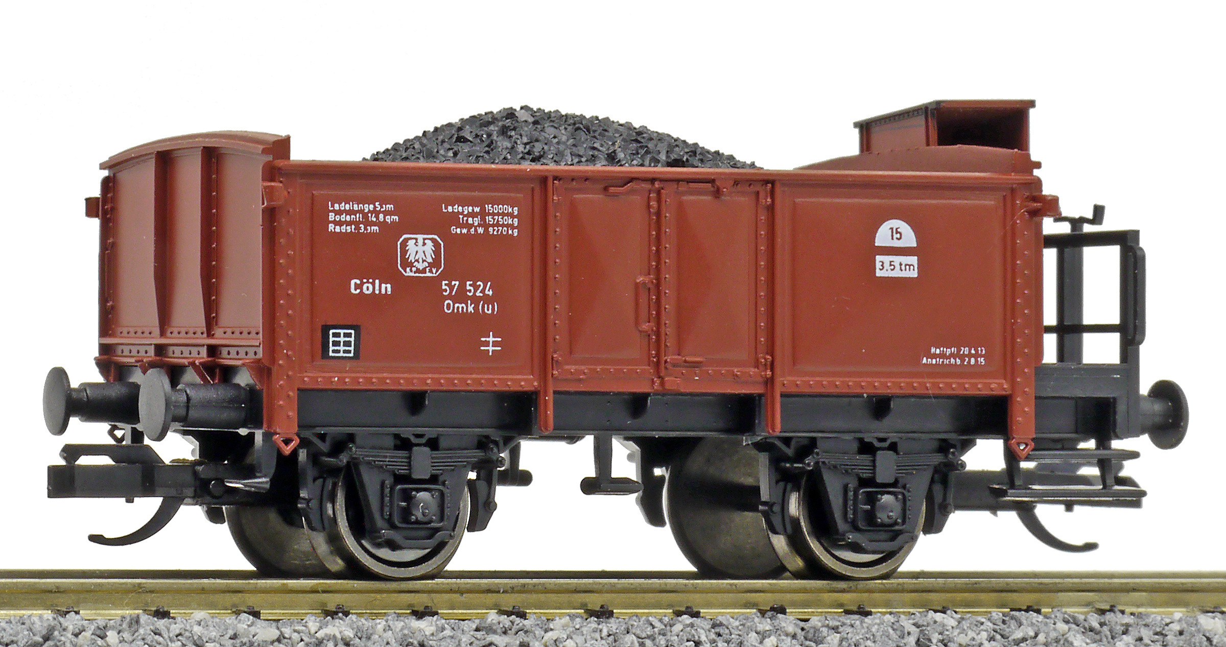 | otevřený nákladní vůz červenohnědý s brzdařskou budkou ložený uhlím |