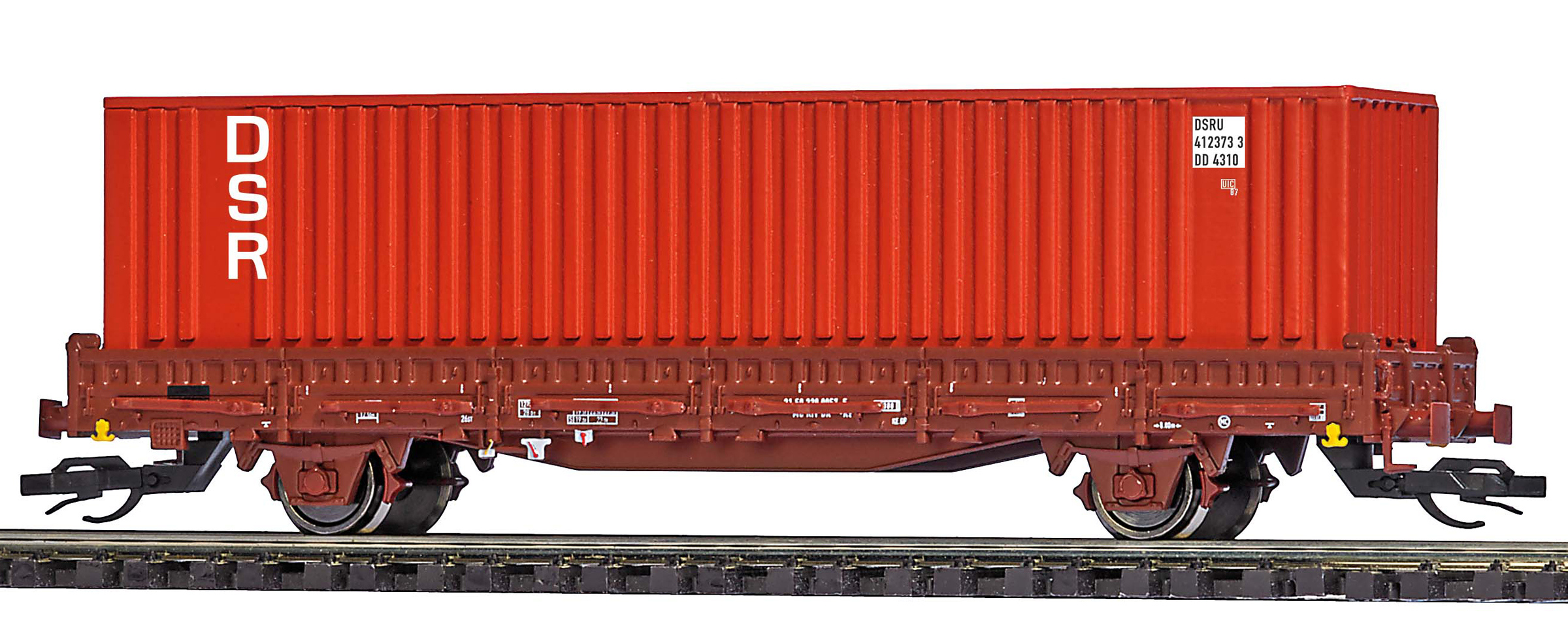 | nízkostěnný nákladní vůz červenohnědý s klanicemi s nákladem kontejneru 40' „DSR“ |