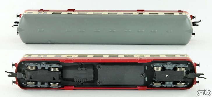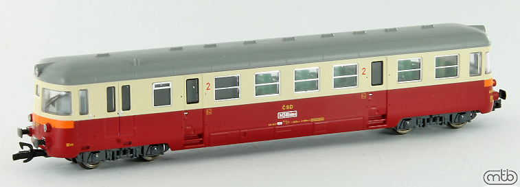 Popis   motorový vůz červený-slonová kost s šedou střechou, výstražný pruh na čelech