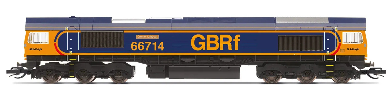 | dieselová lokomotiva modrá-oranžová, šedá střecha a černý pojezd „Cromer Lifeboat“ |