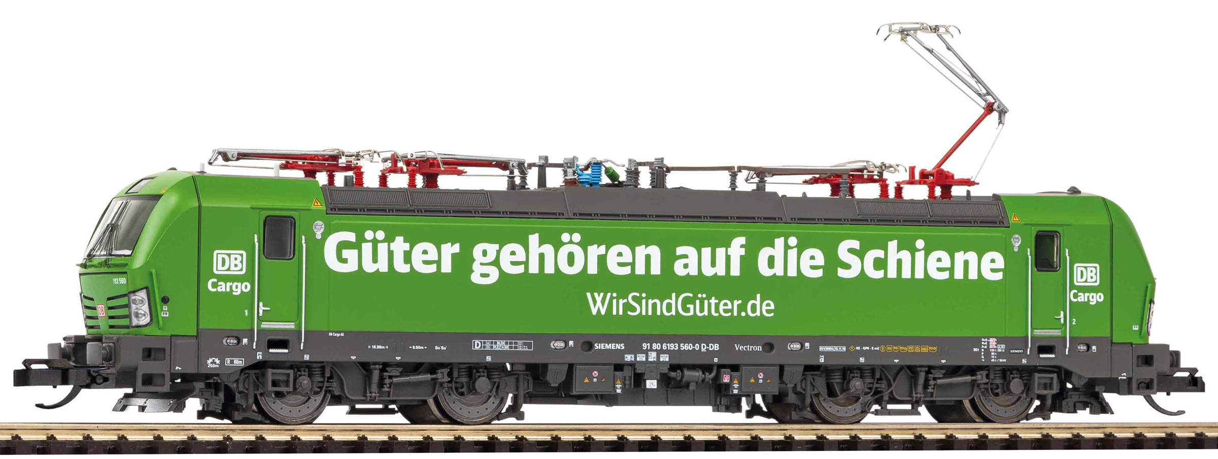 Popis   elektrická lokomotiva zelená s potiskem „Güter gehören auf die Schiene“