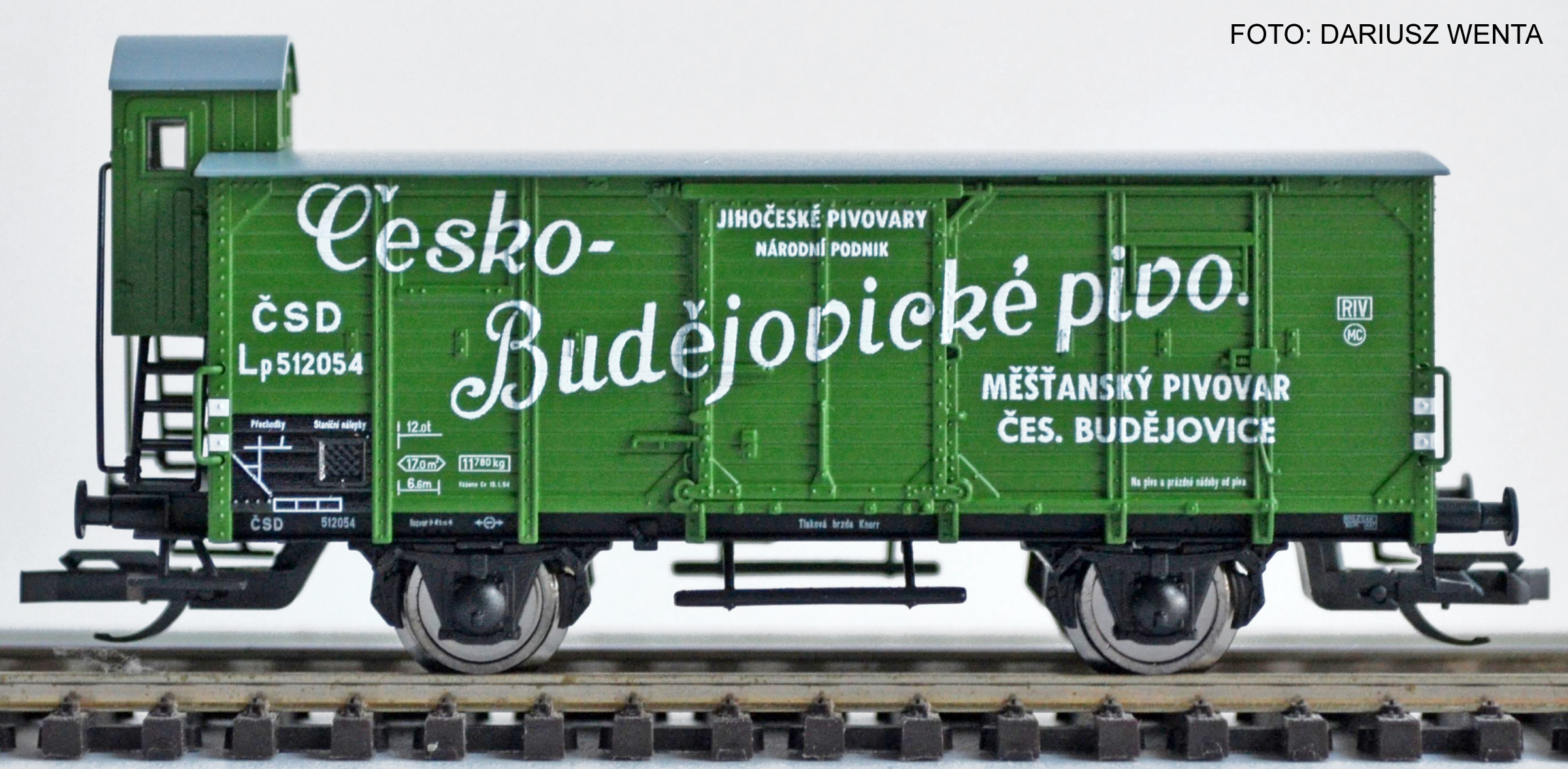 | krytý nákladní vůz zelený s šedou střechou a s brzdařskou budkou „Česko-Budějovické pivo“ |
