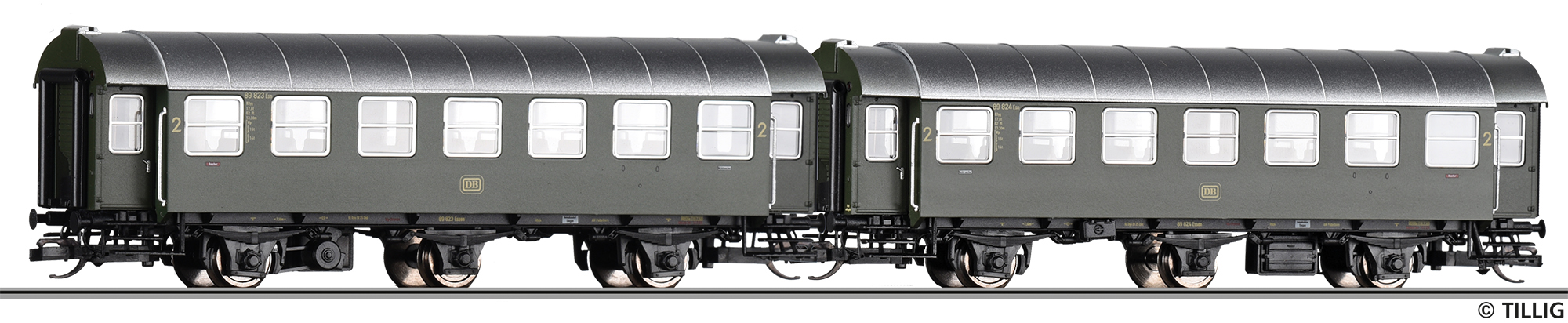| pár osobních vozů tmavě zelených se stříbrnou střechou 2. tř. |