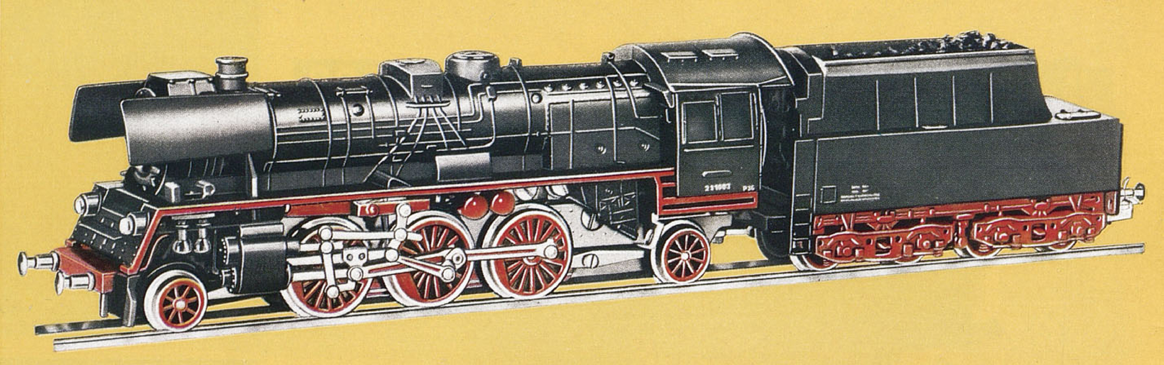 parní lokomotiva černá s červenými koly a rozvodem, kouřové plechy