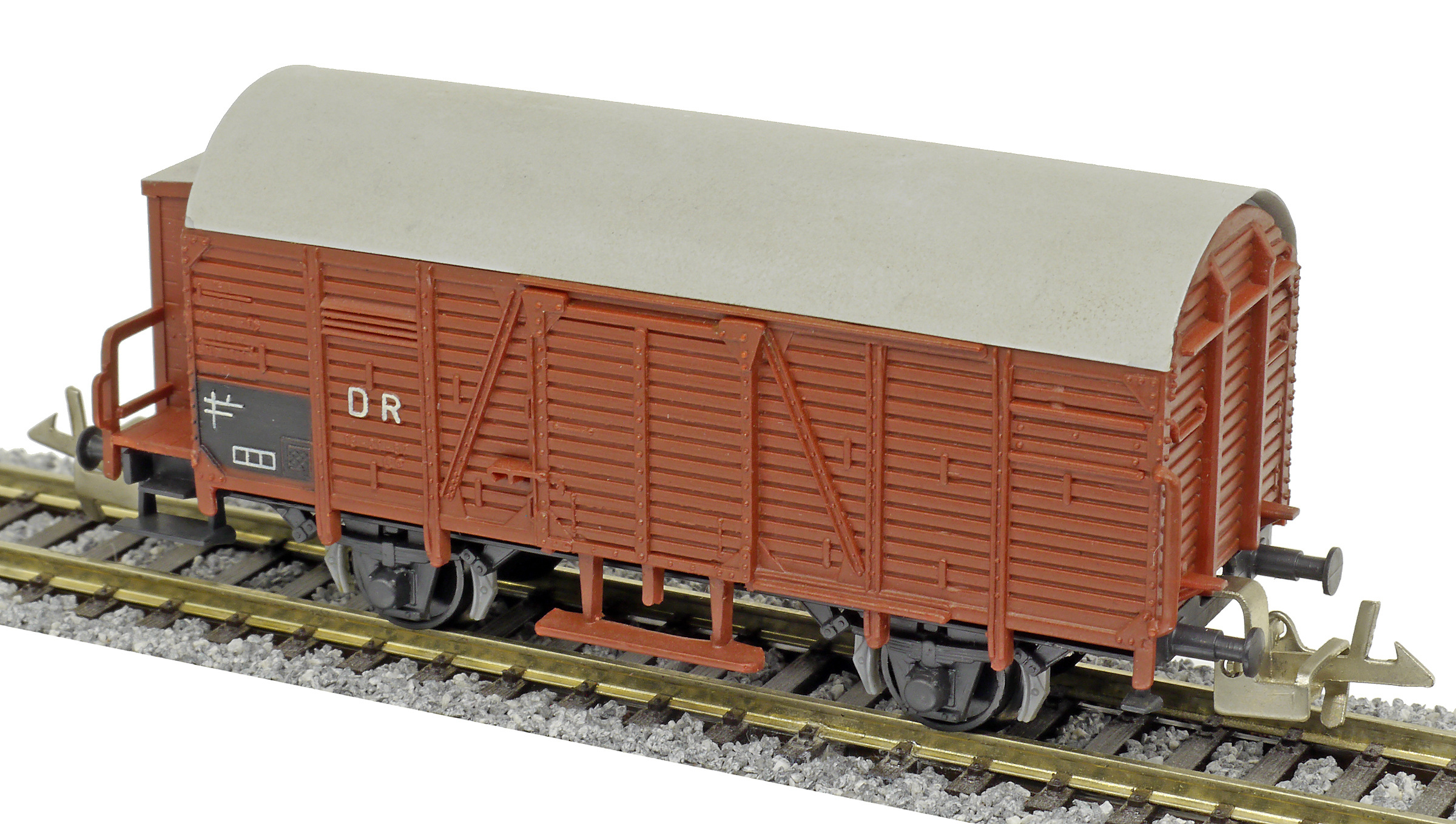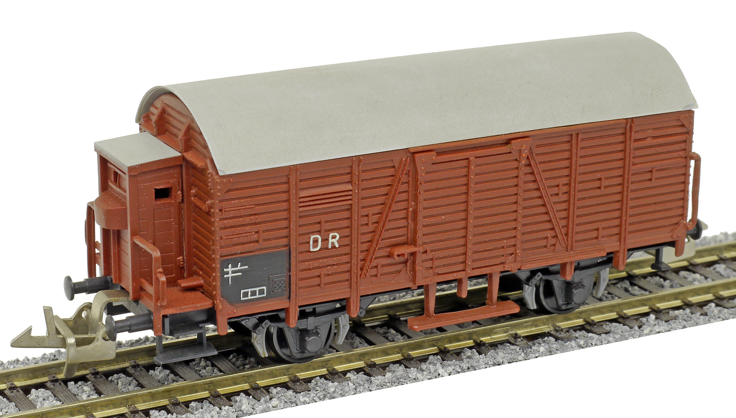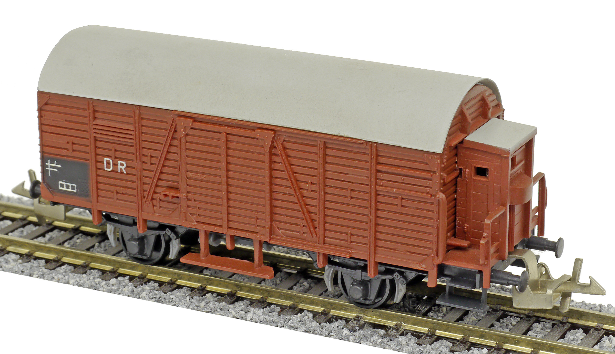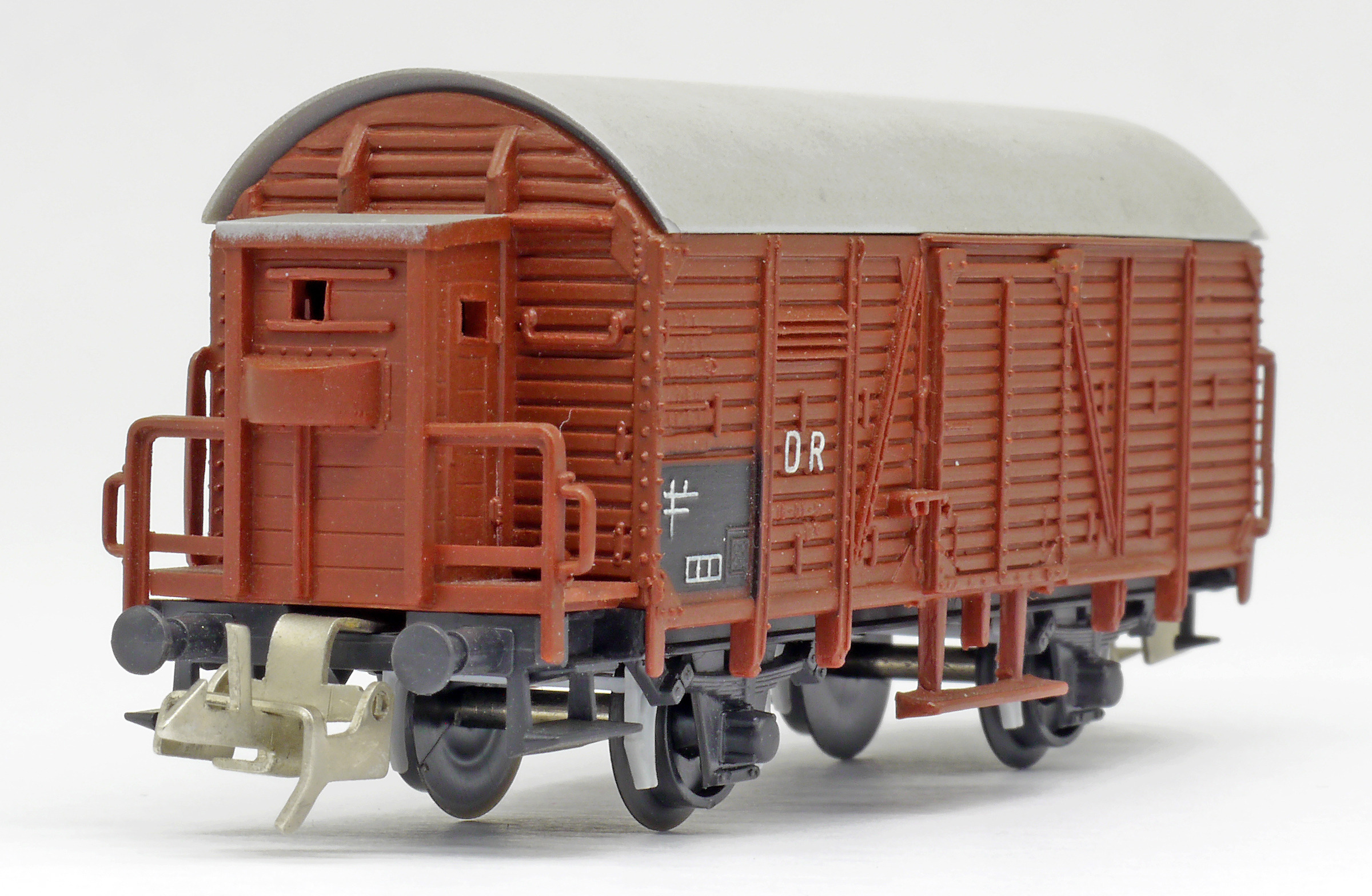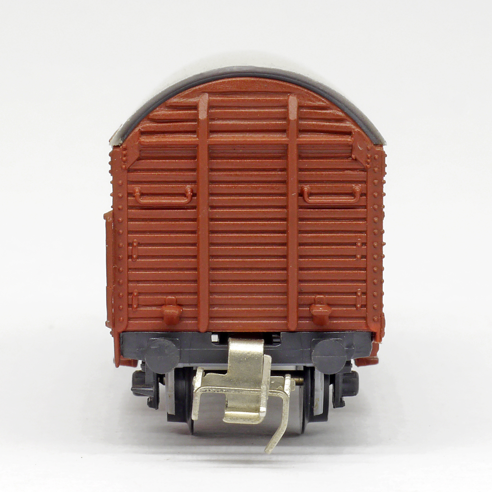 | krytý nákladní vůz červenohnědý s šedou střechou a s brzdařskou budkou |