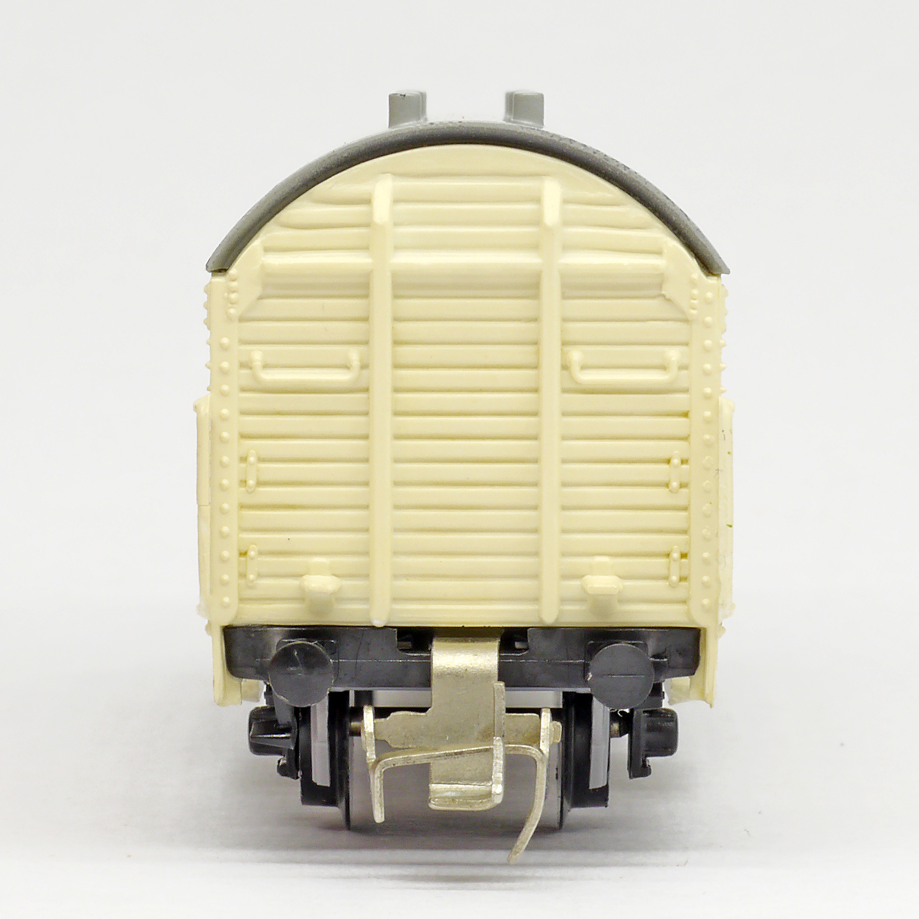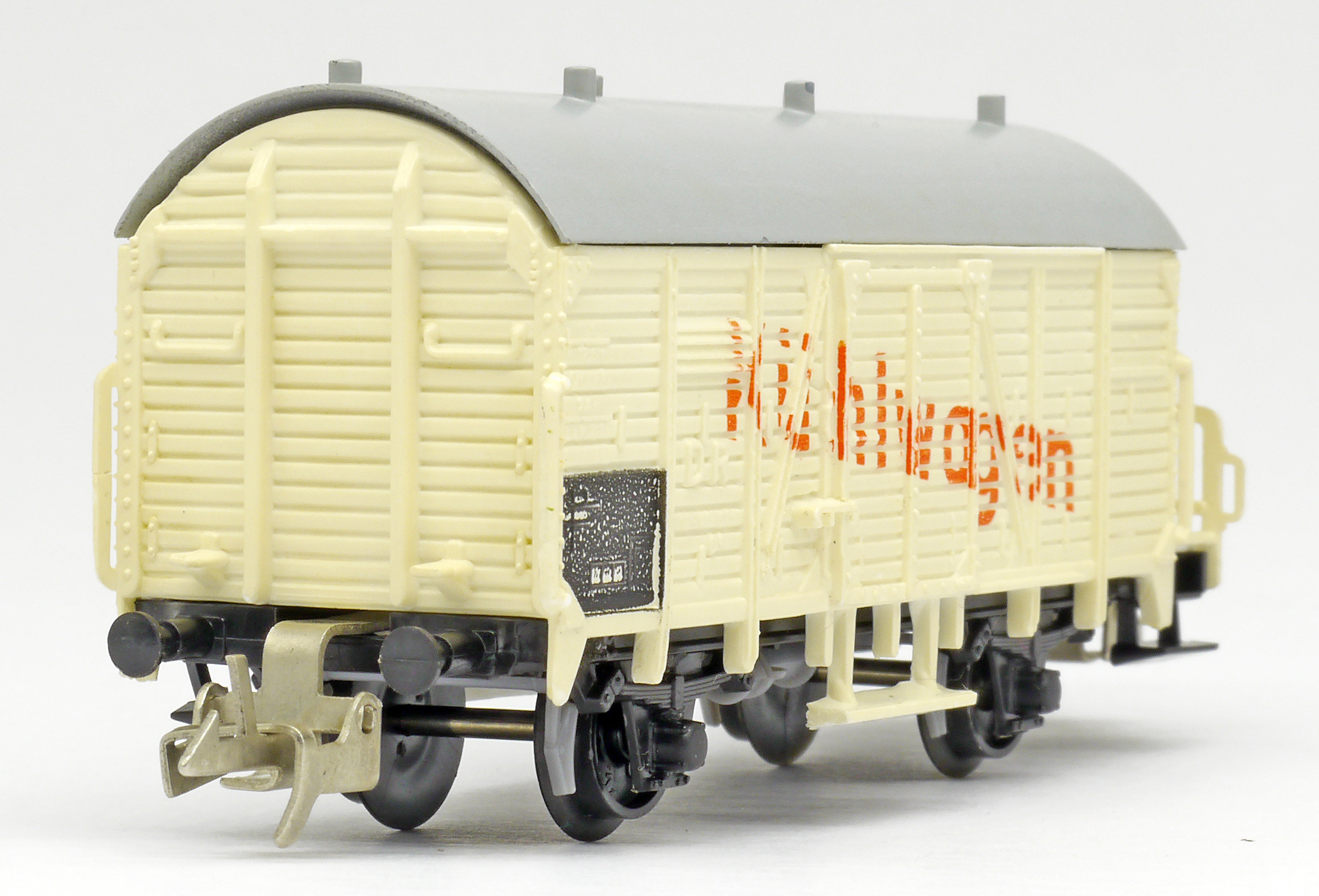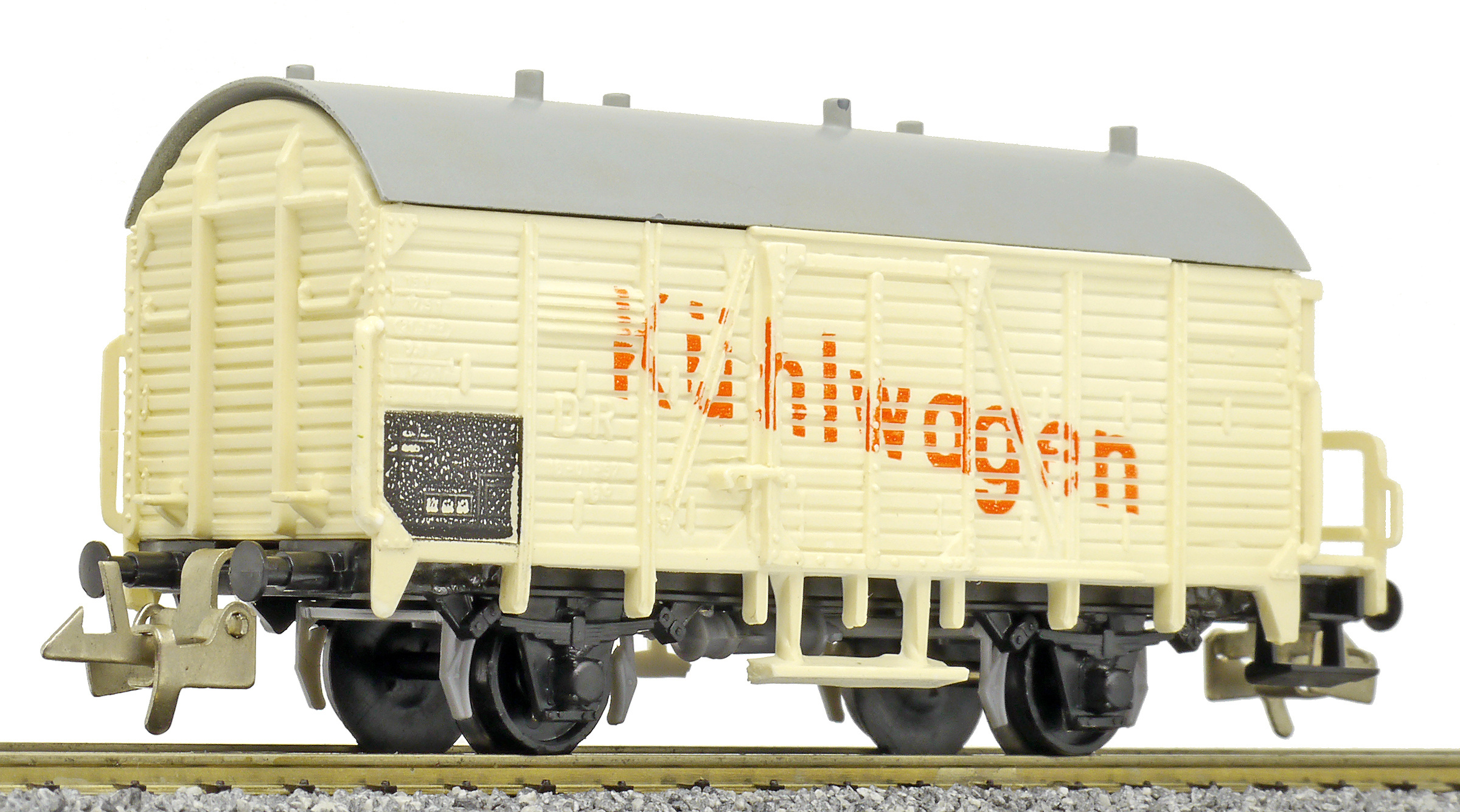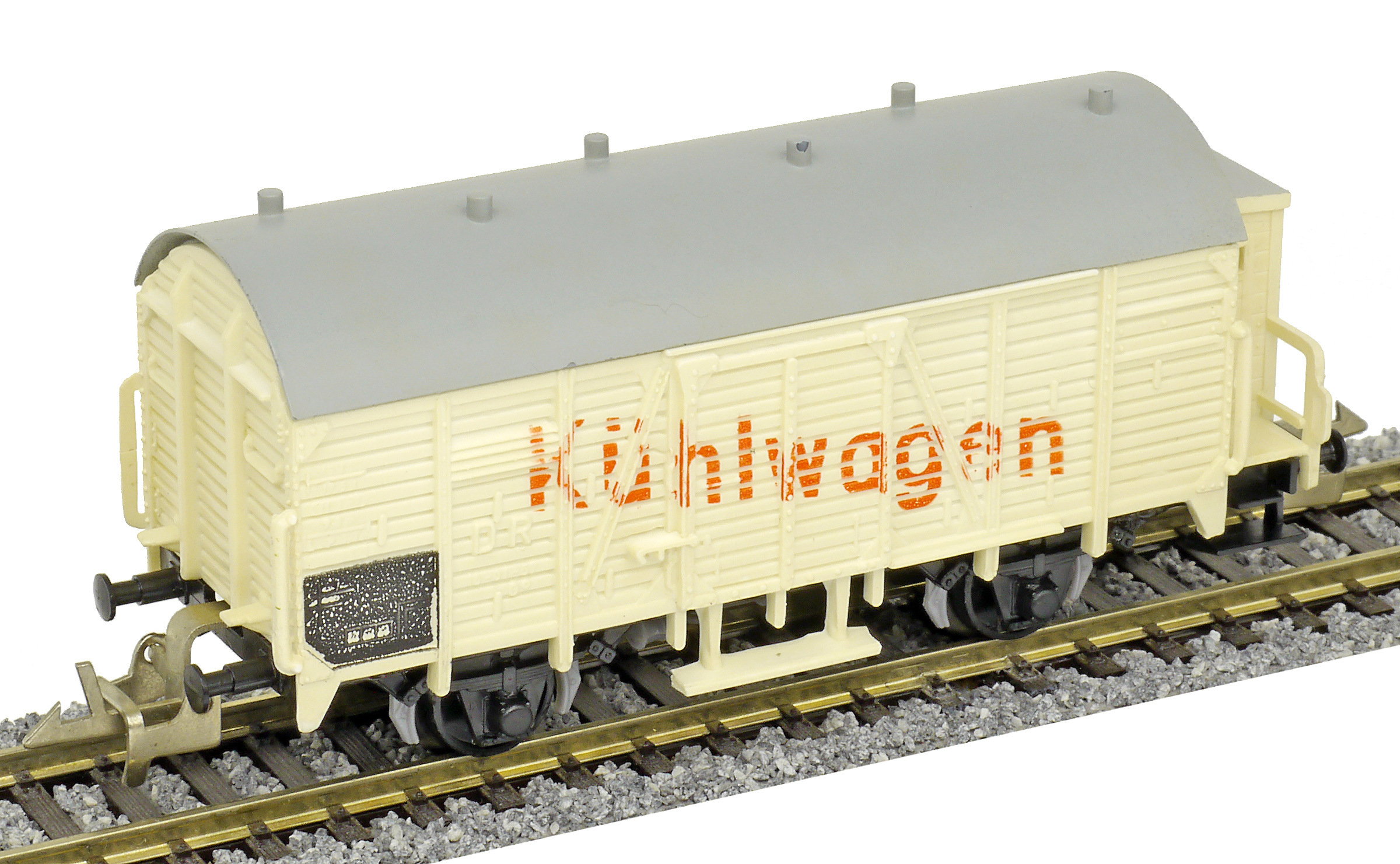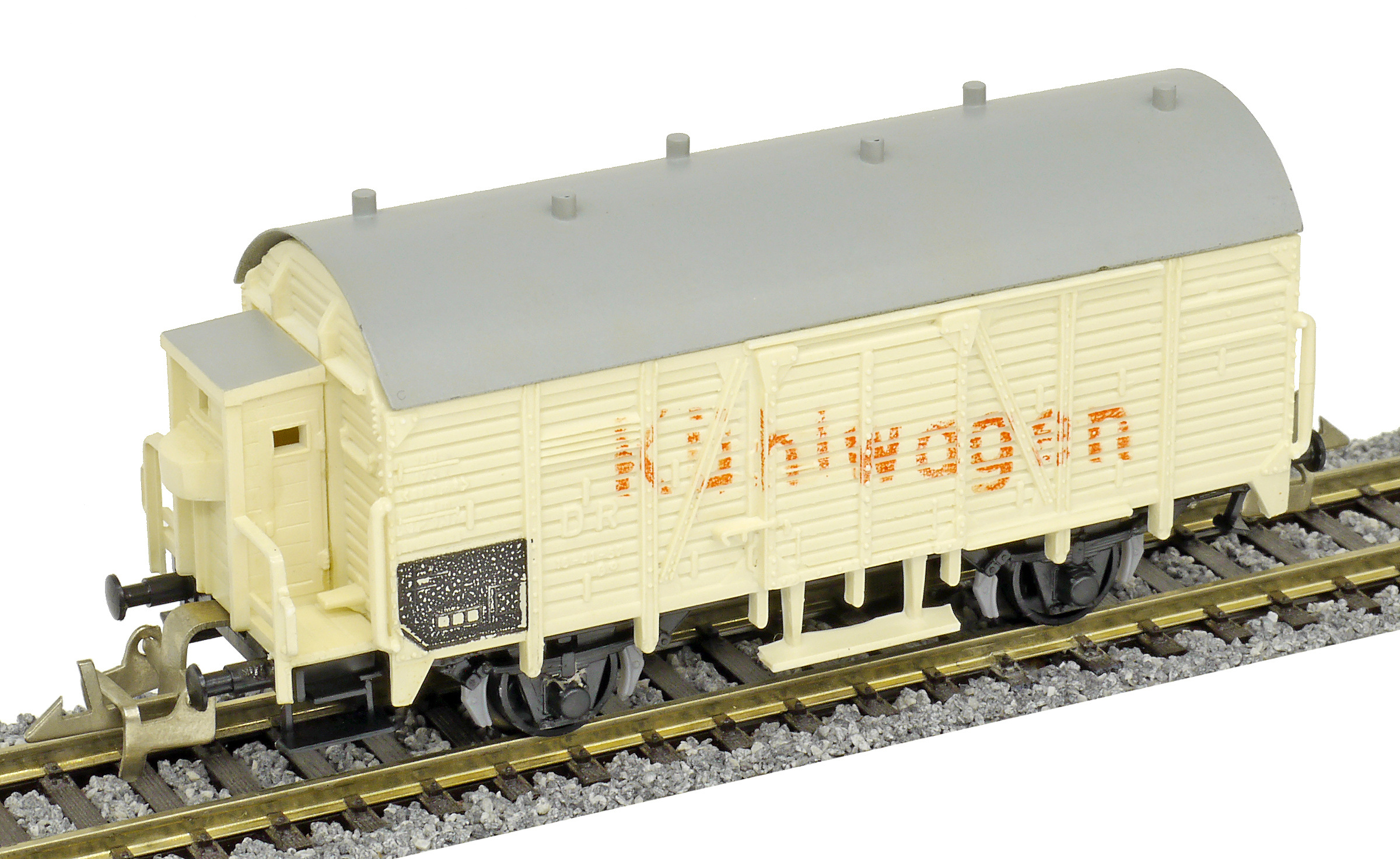 | nákladní chladící vůz světle krémý s šedou střechou „Kühlwagen“ a s brzdařskou budkou |