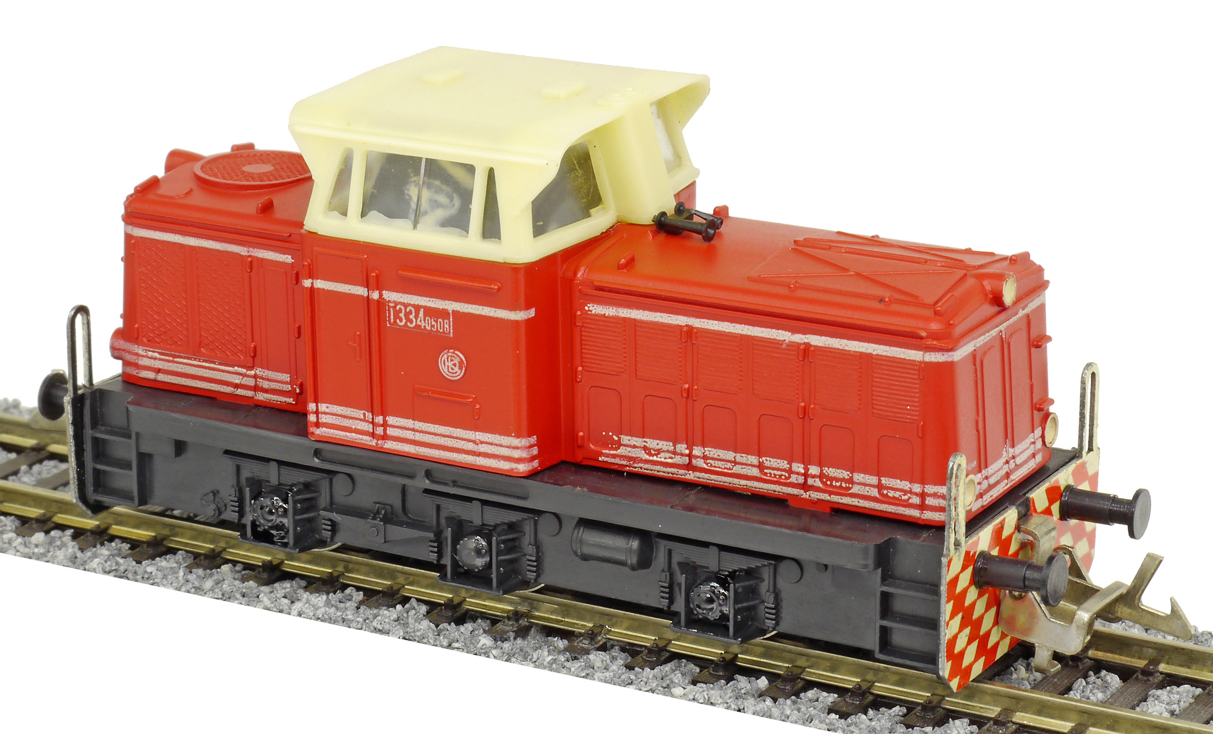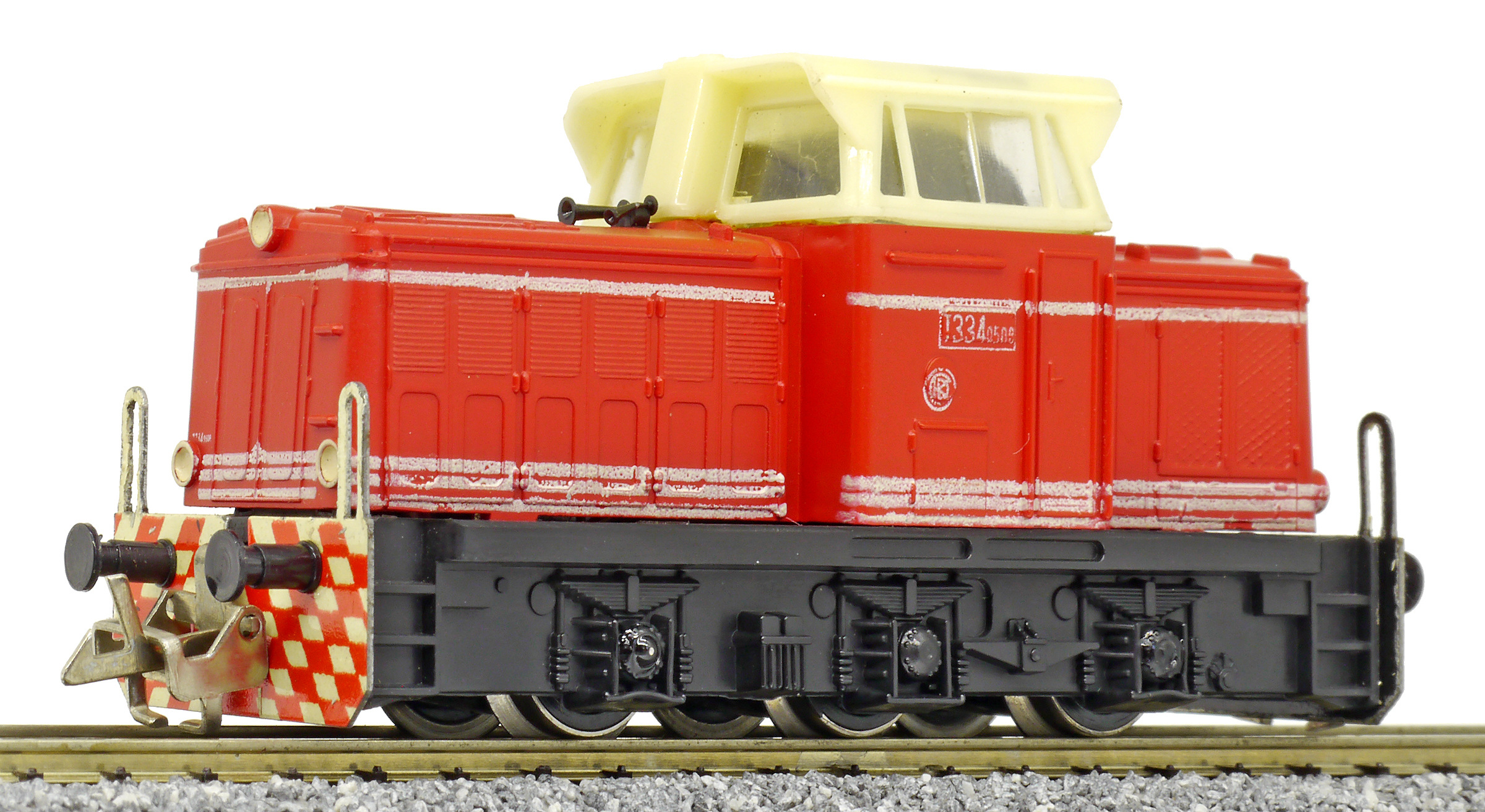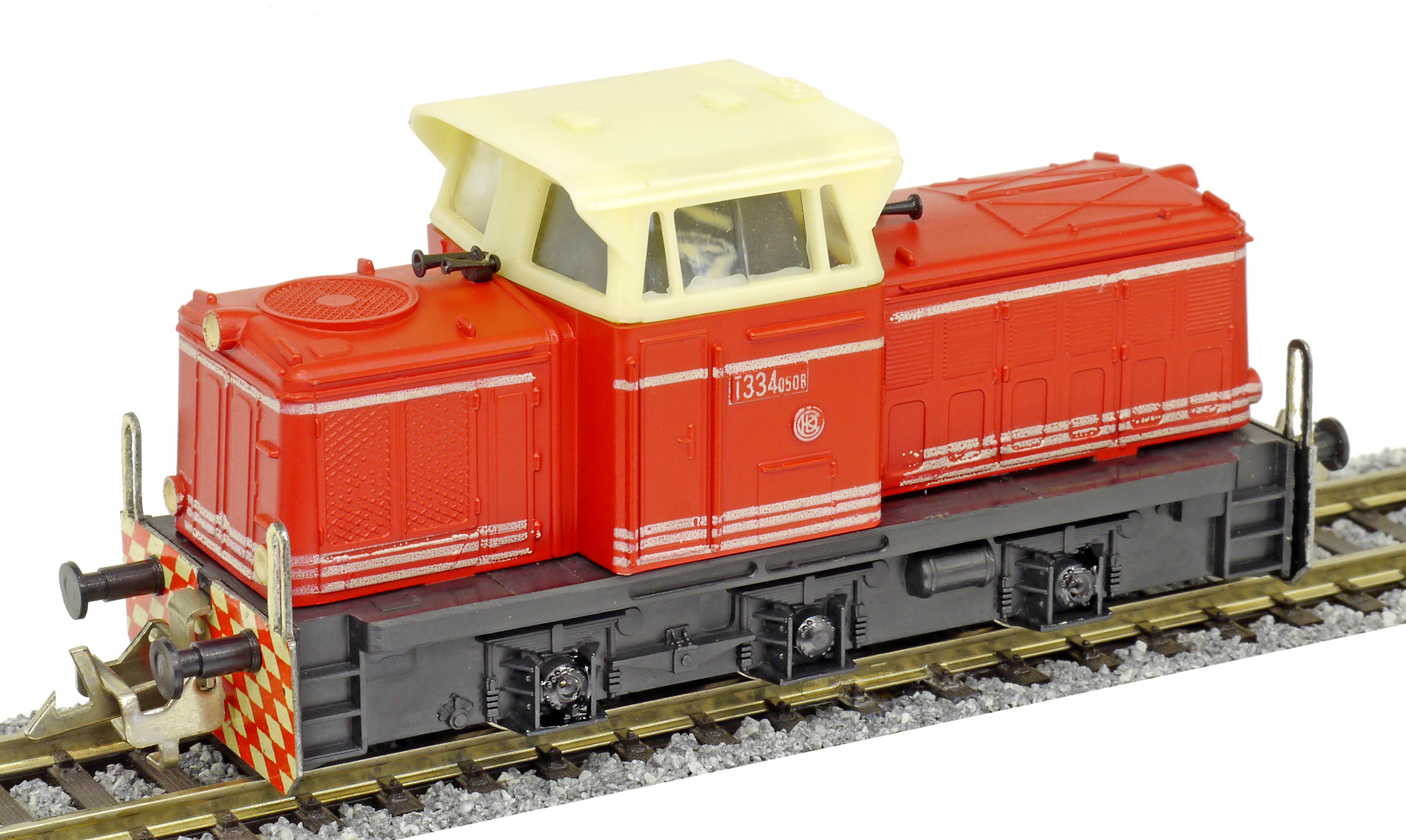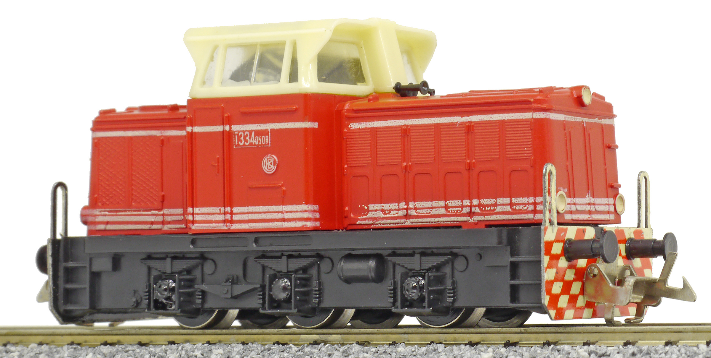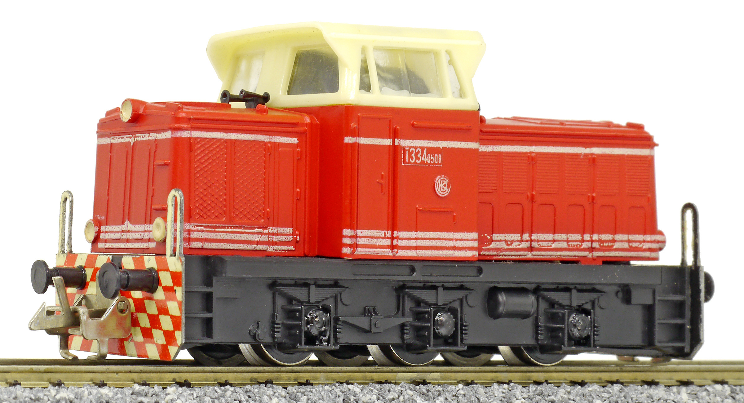 | dieselová lokomotiva červená s bílými proužky, krémová budka, černý rám a pojezd |