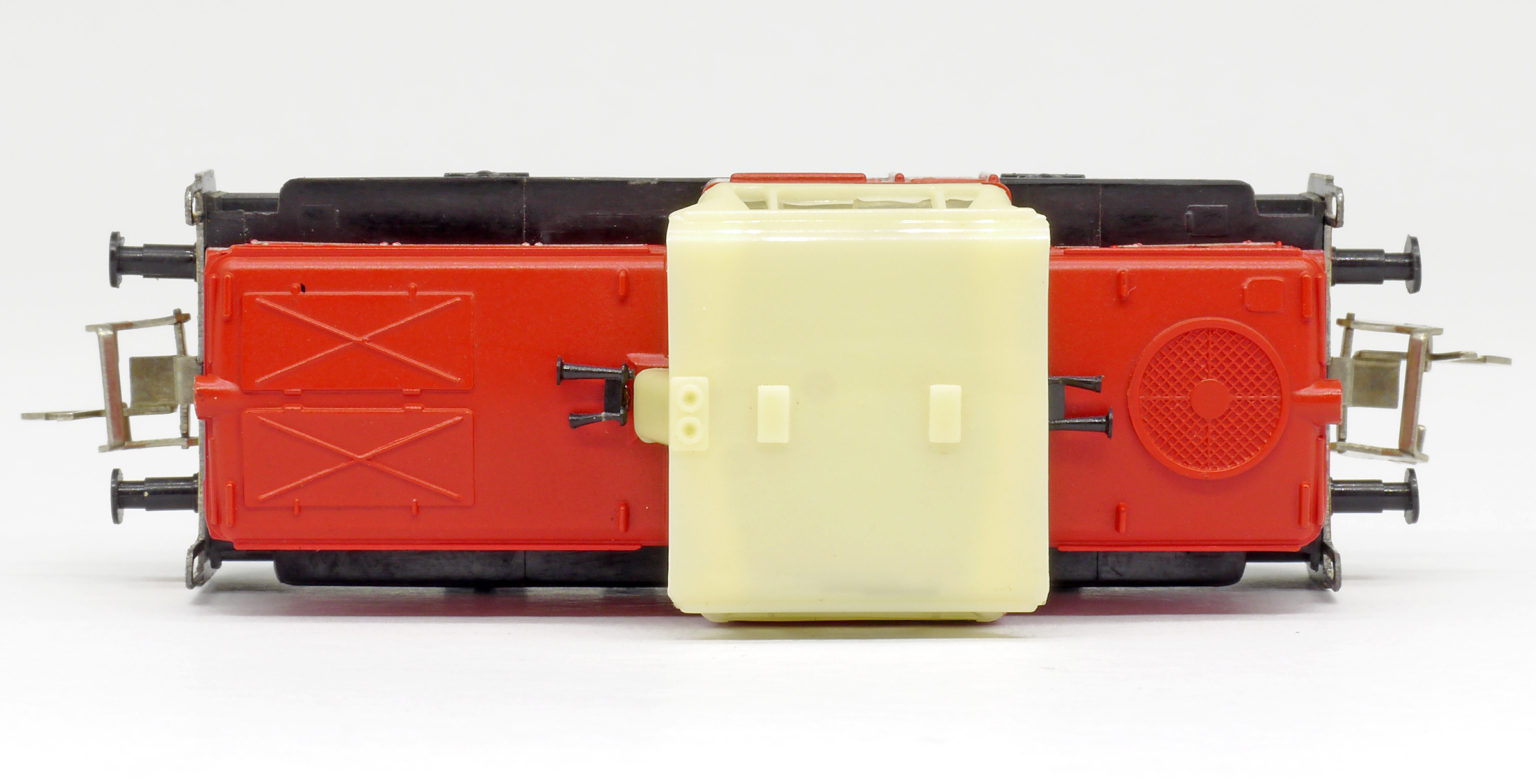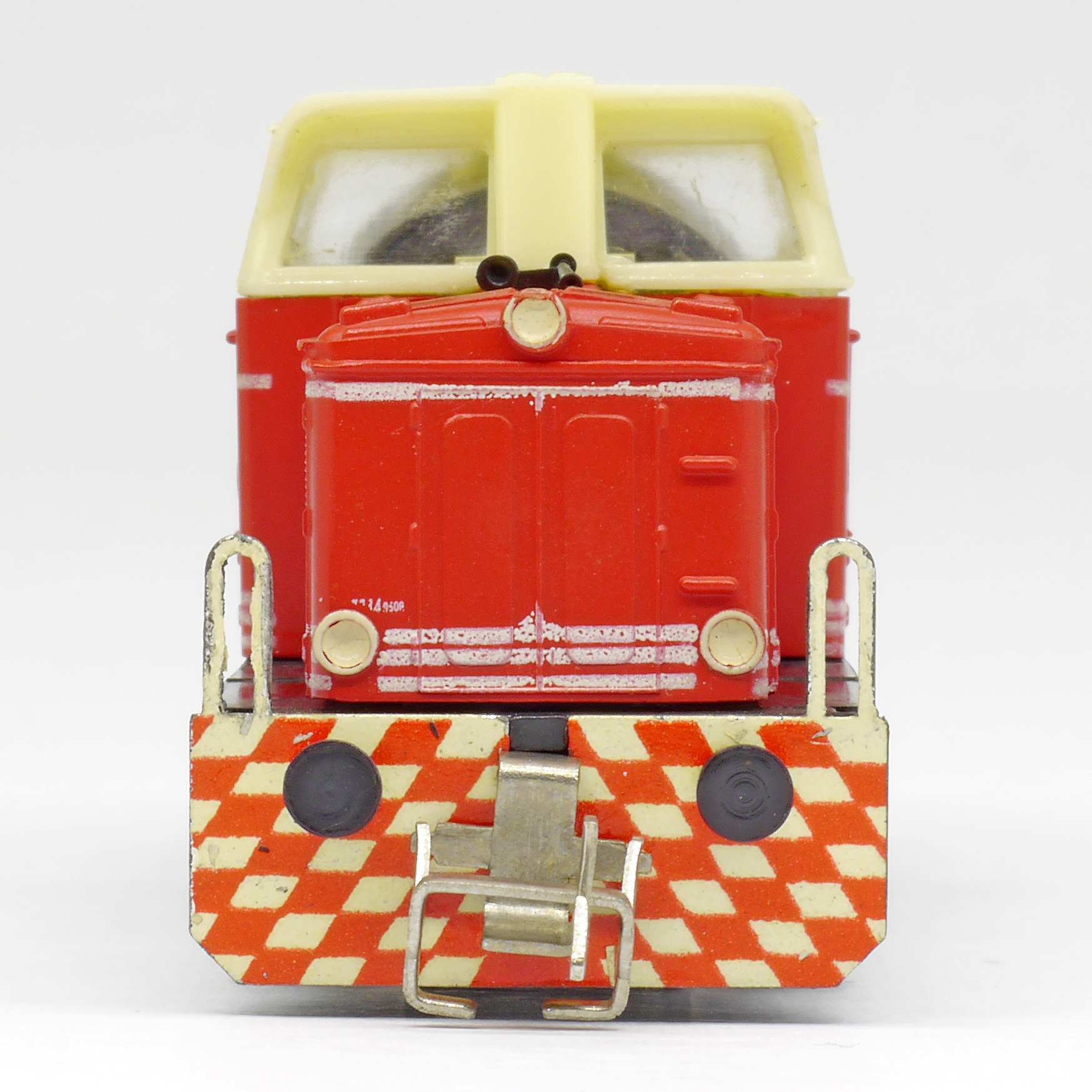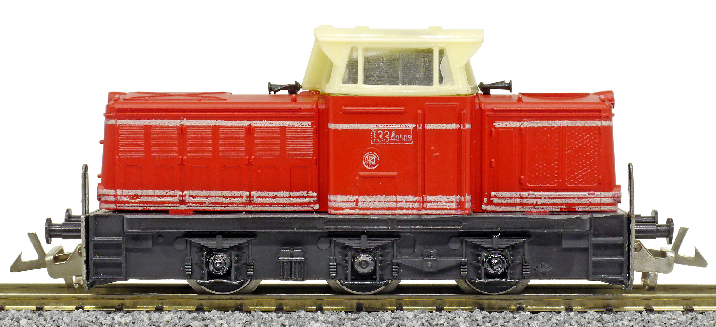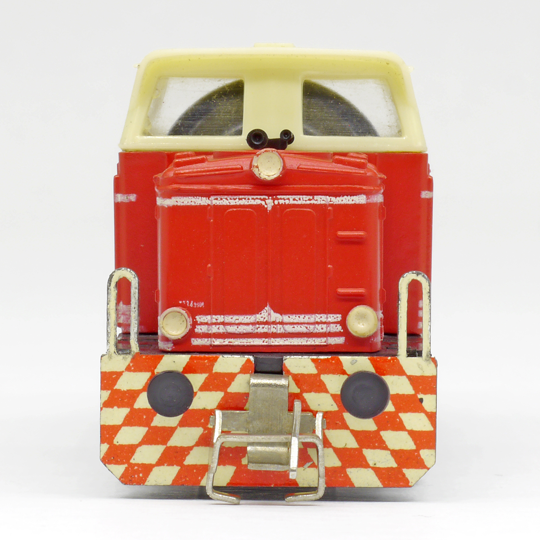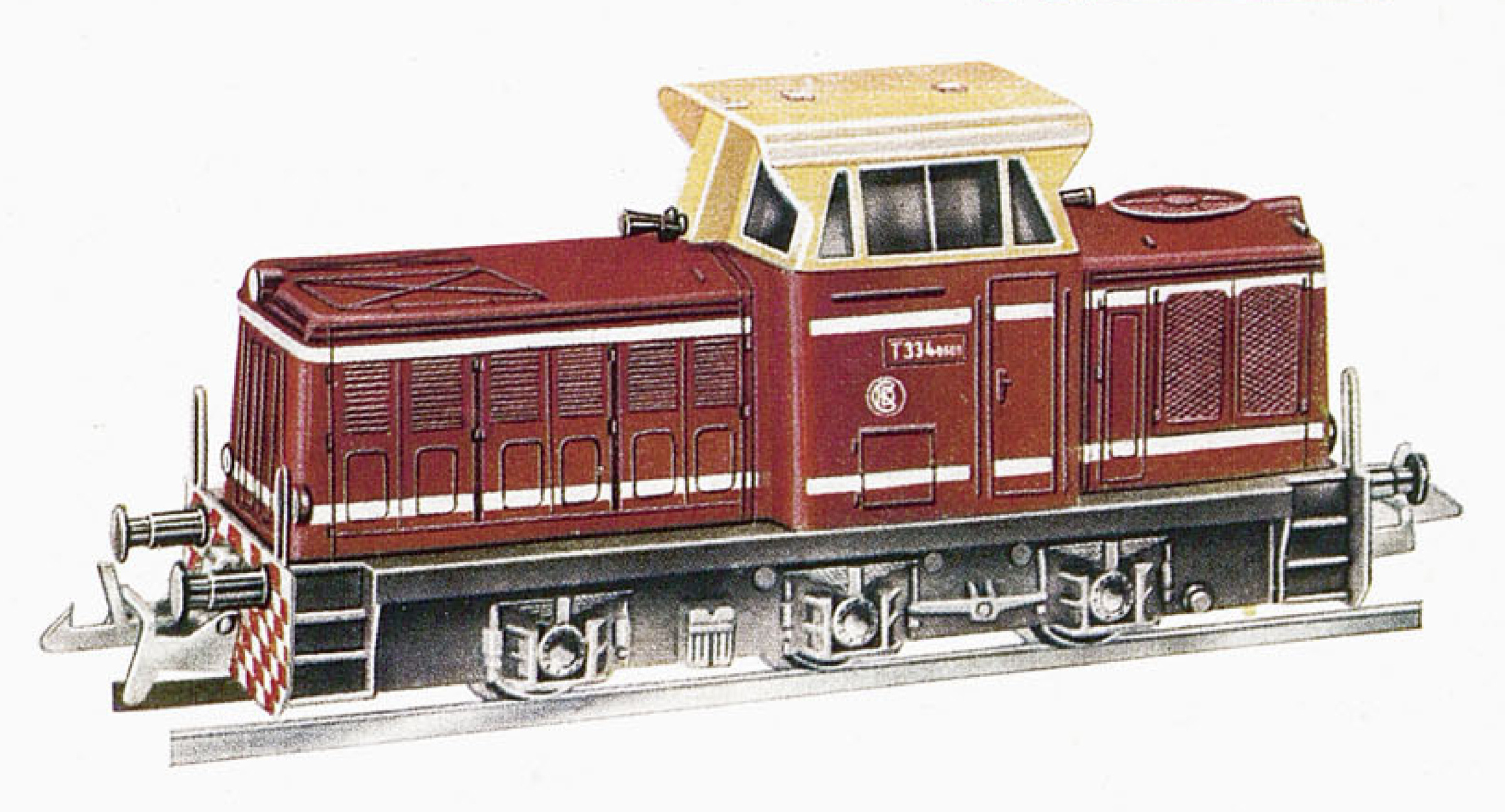 | dieselová lokomotiva červená s bílými proužky, krémová budka, černý rám a pojezd |