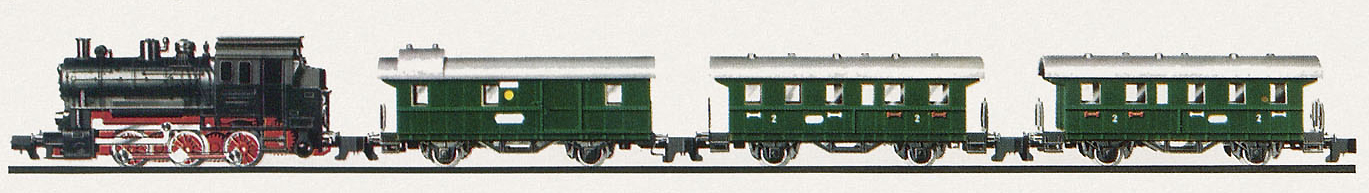 set parní lokomotivy, zavazadlového vozu a dvou osobních vozů