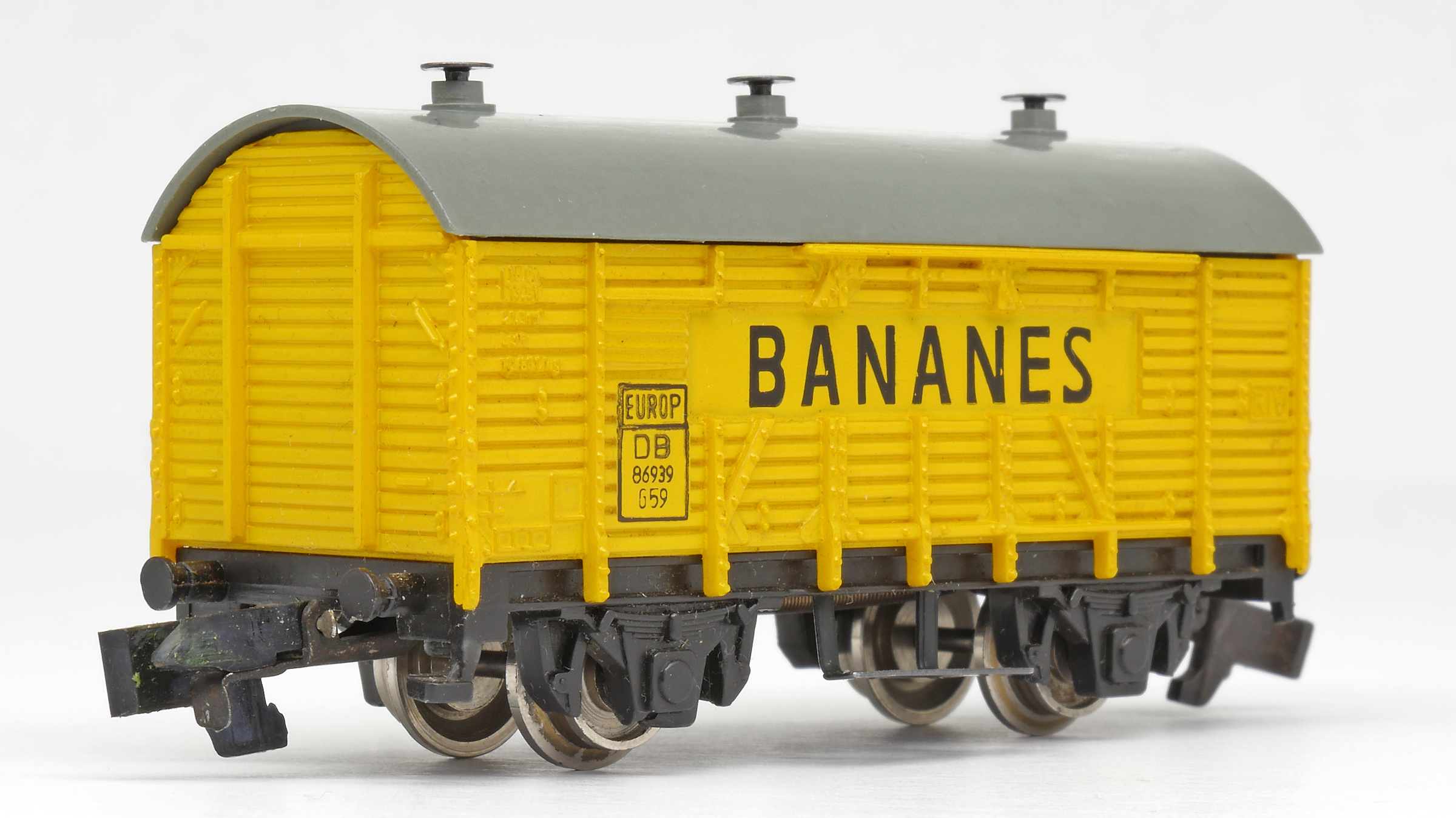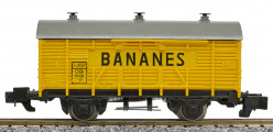 krytý nákladní vůz žlutý s tmavě šedou střechou „BANANES“