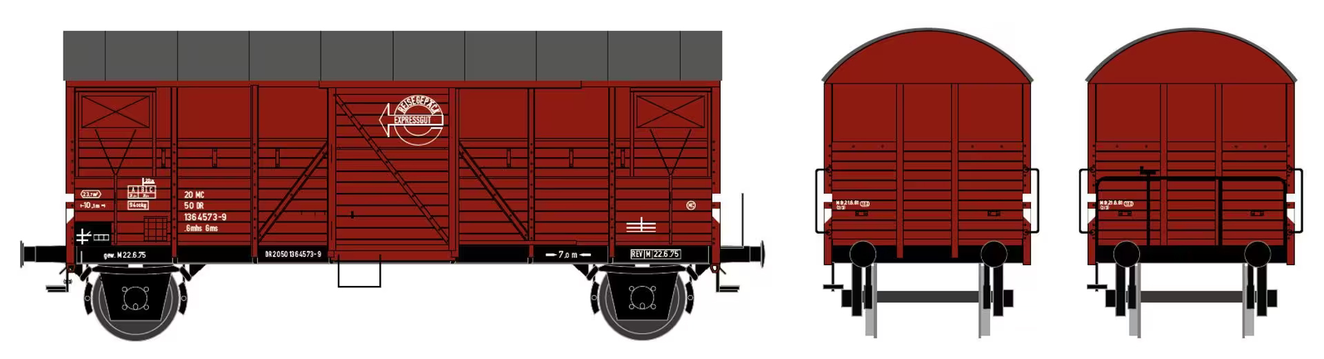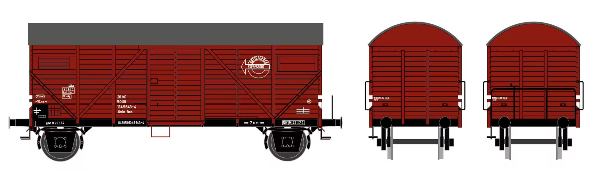 | krytý nákladní vůz červenohnědý s tmavě šedou střechou „EXPRESSGUT“ |