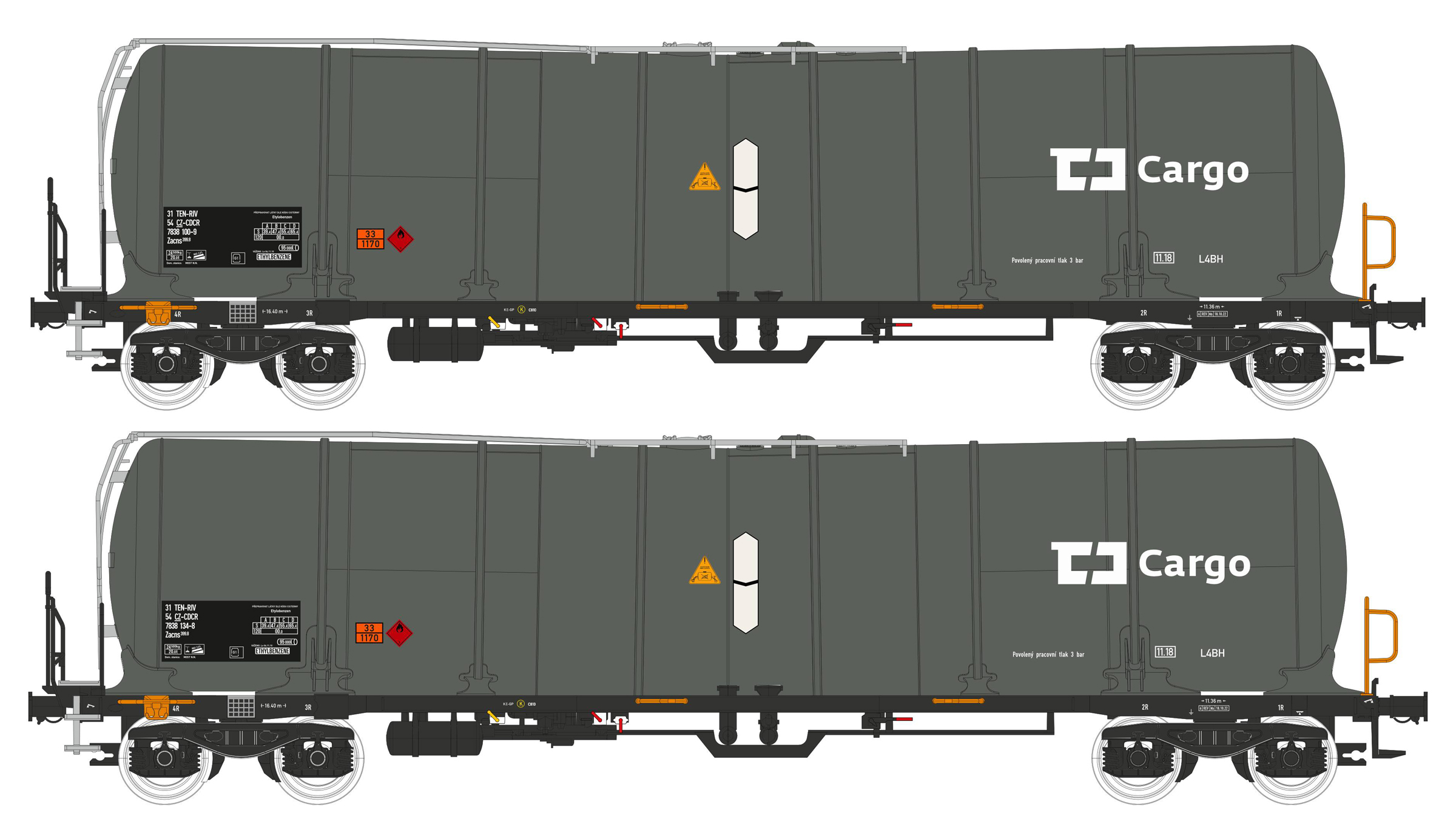| set dvou šedých kotlových vozů s logem „ČD Cargo“ |