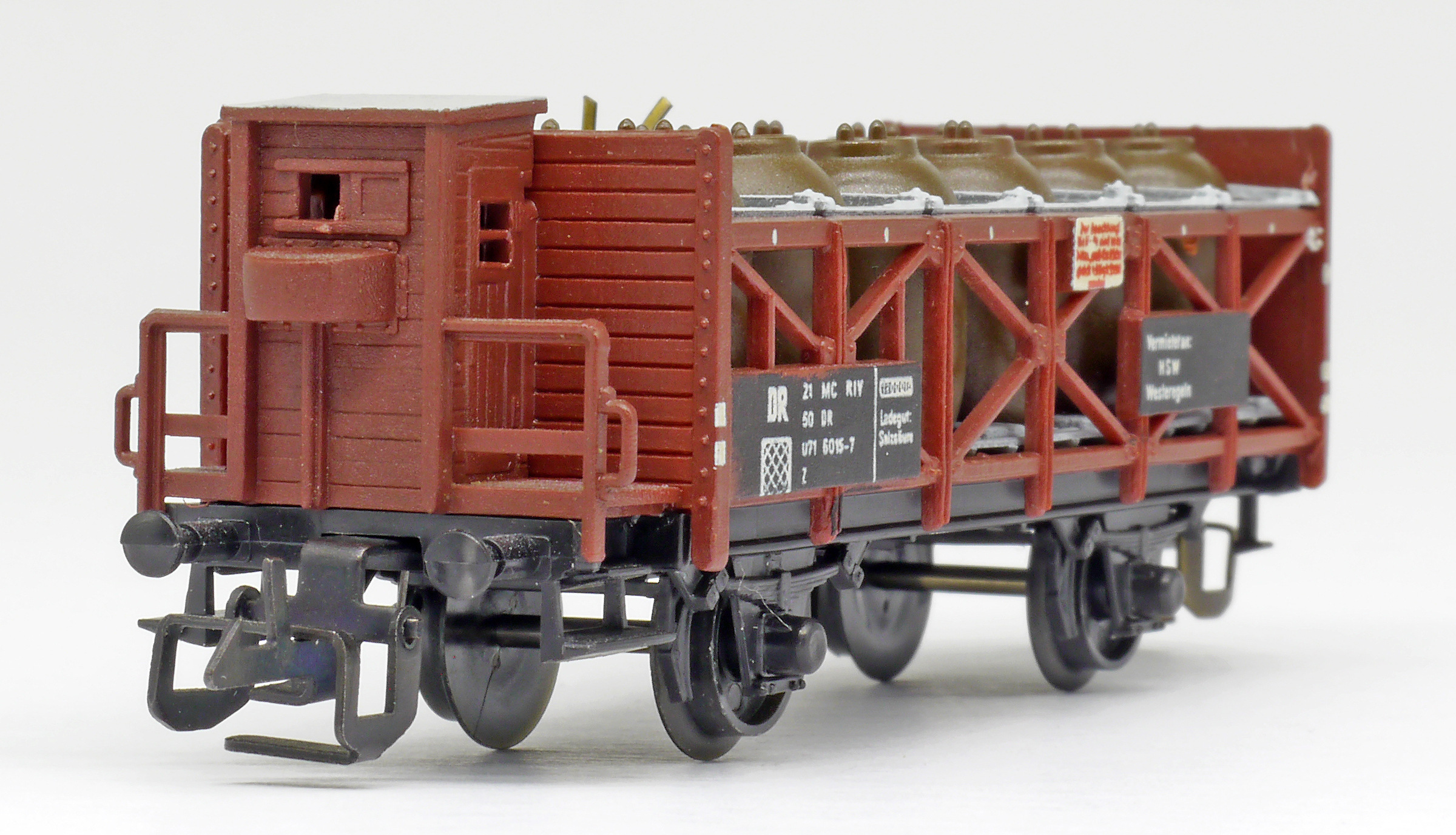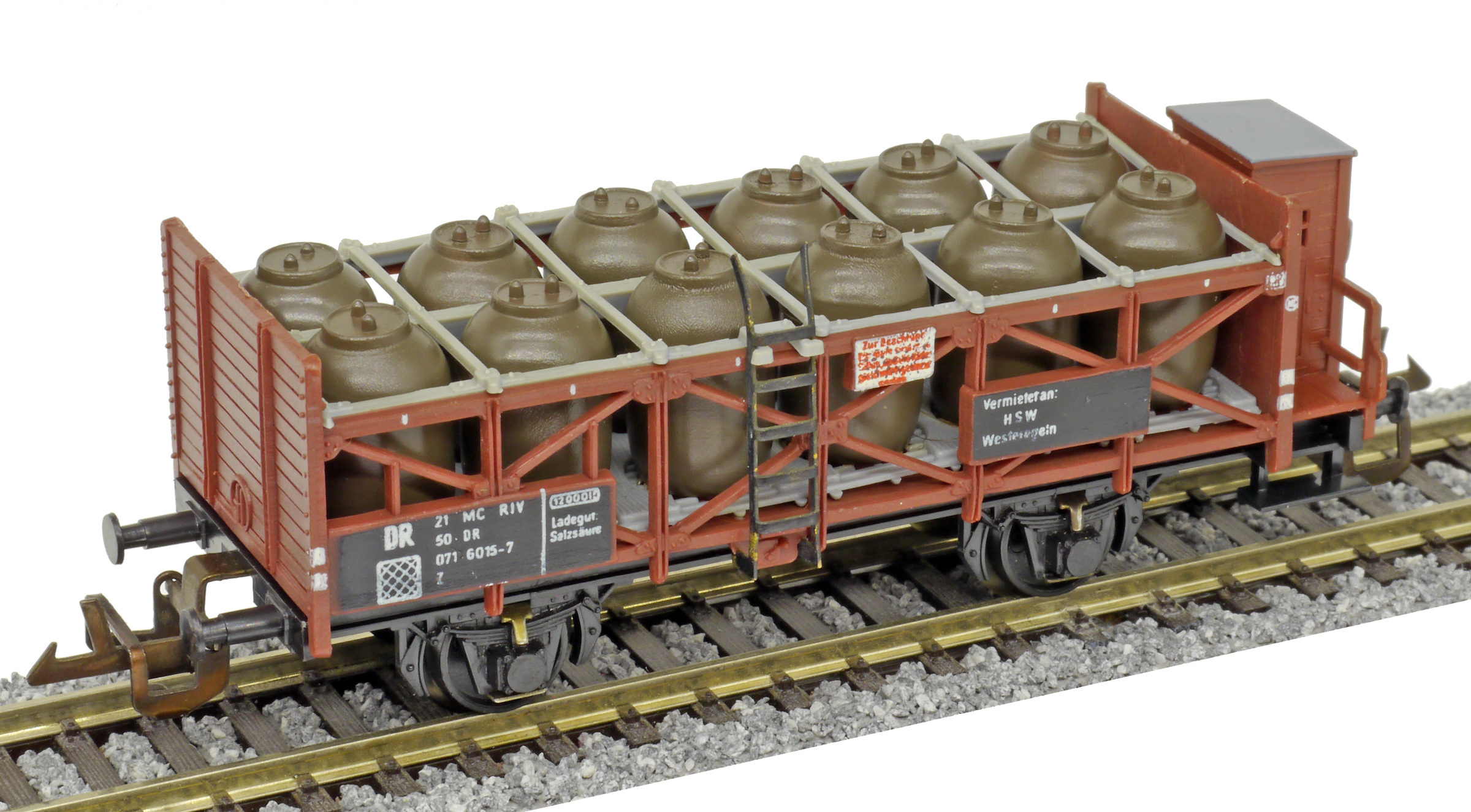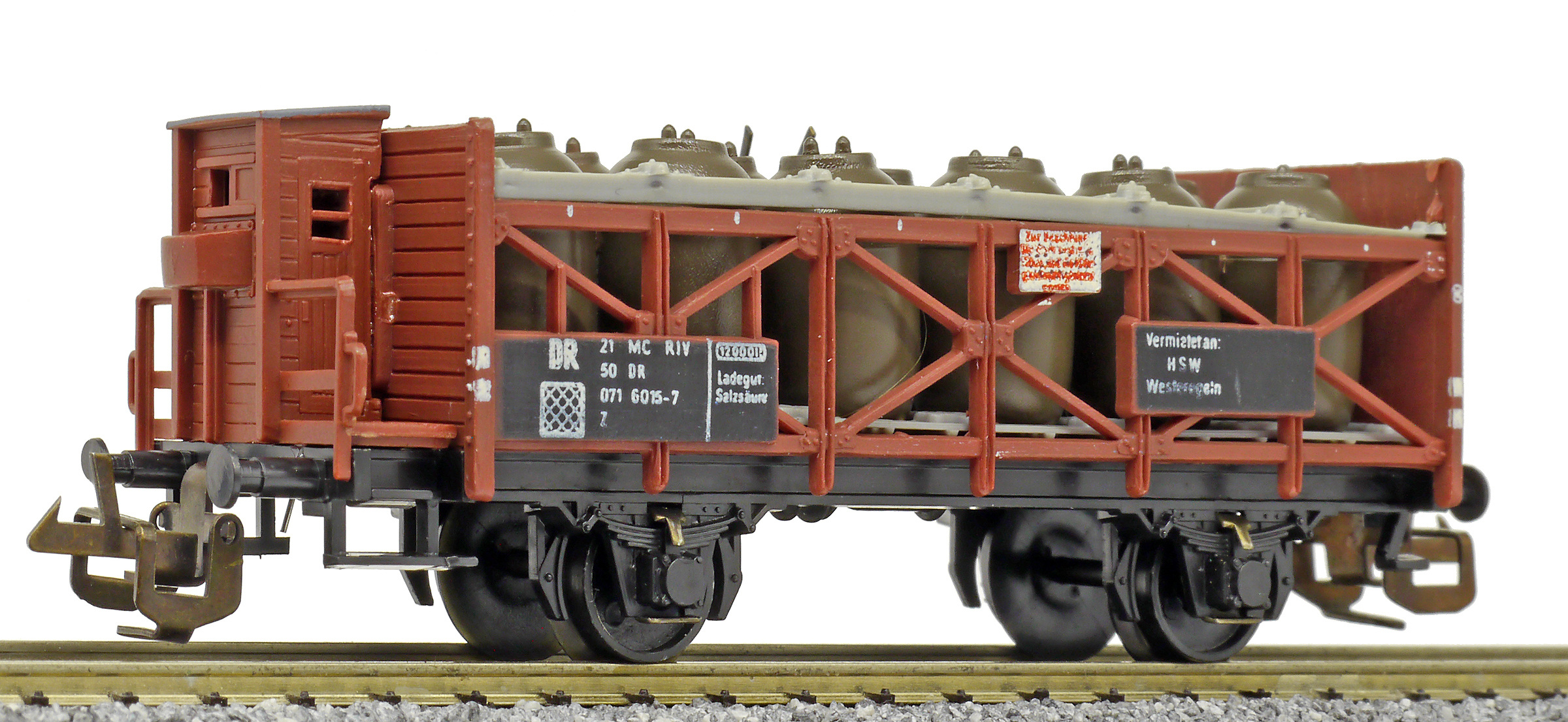 | nádobový vůz na přepravu kyseliny červenohnědý s brzdařskou budkou |