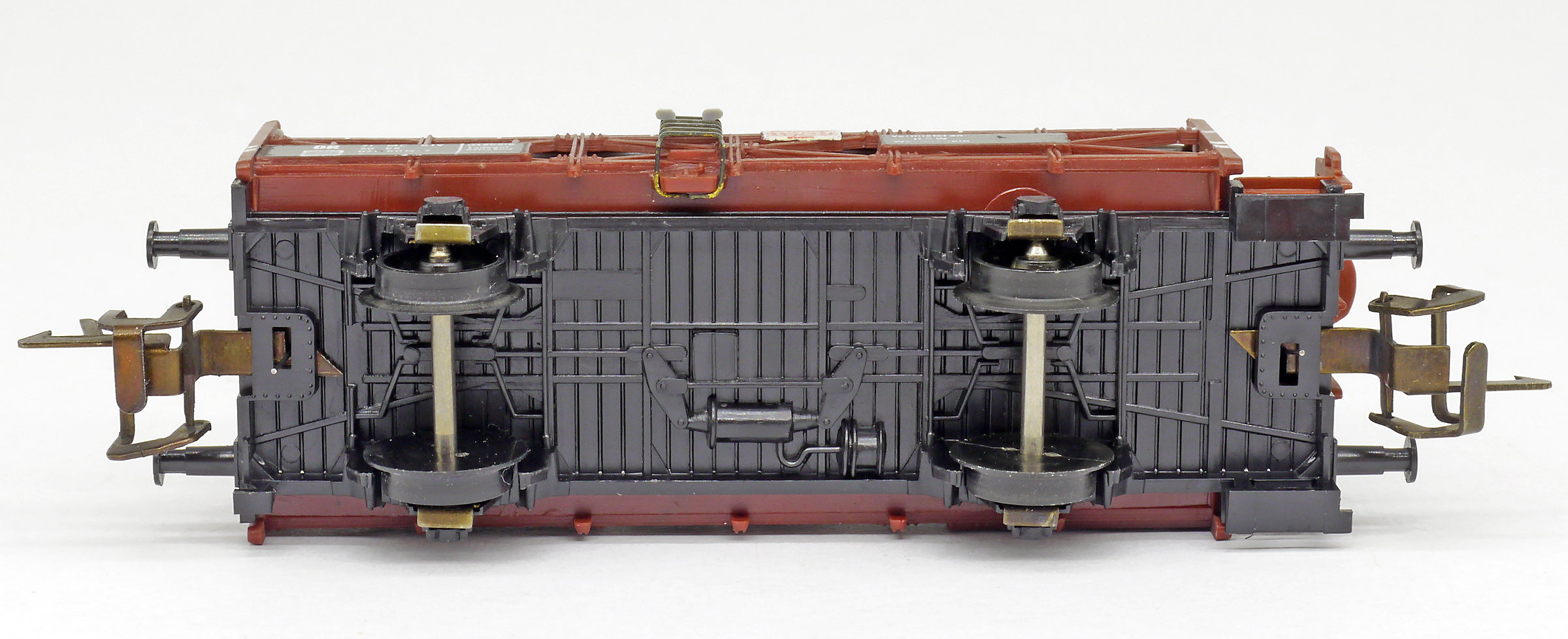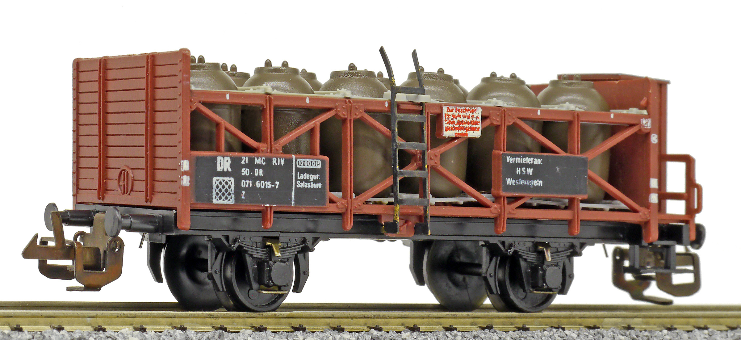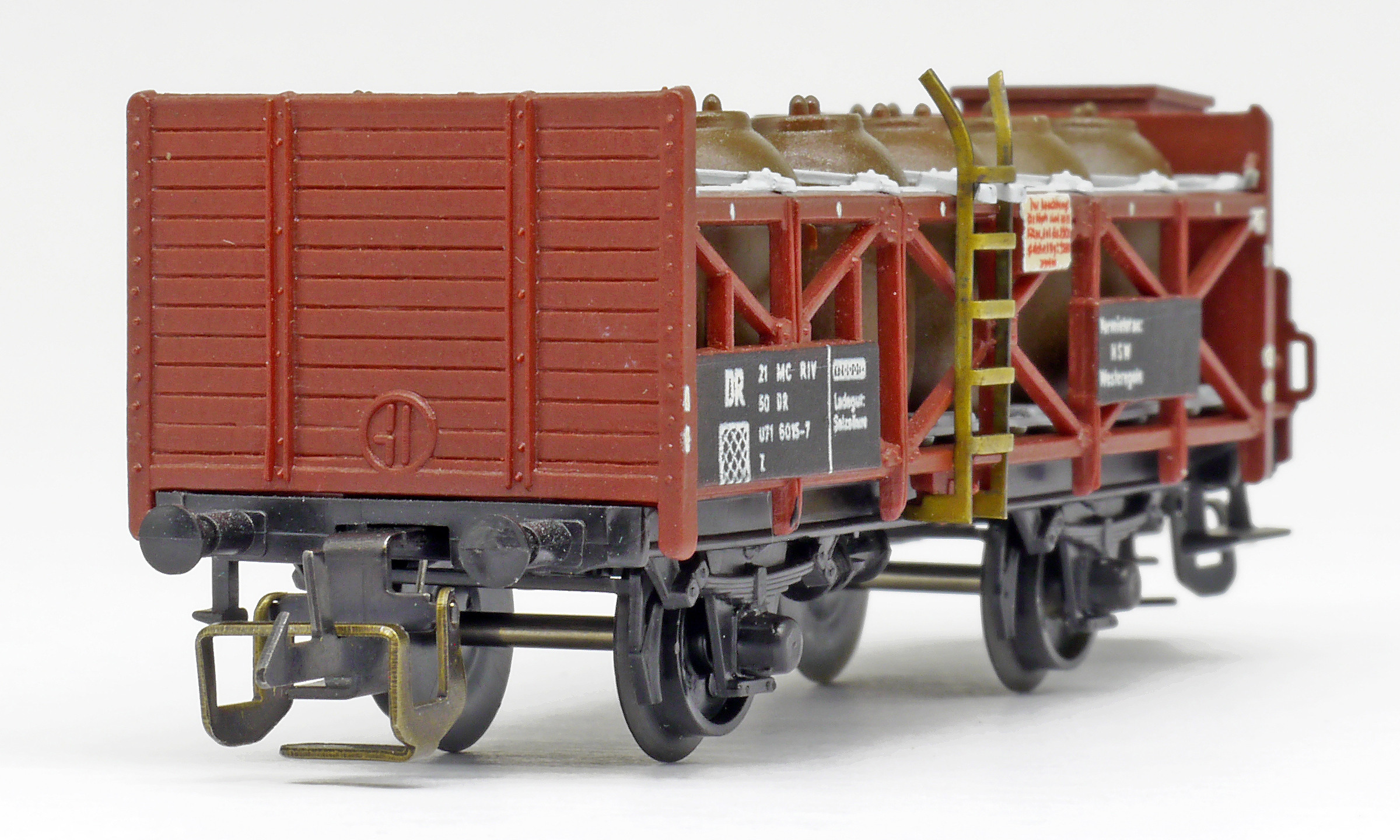 | nádobový vůz na přepravu kyseliny červenohnědý s brzdařskou budkou |