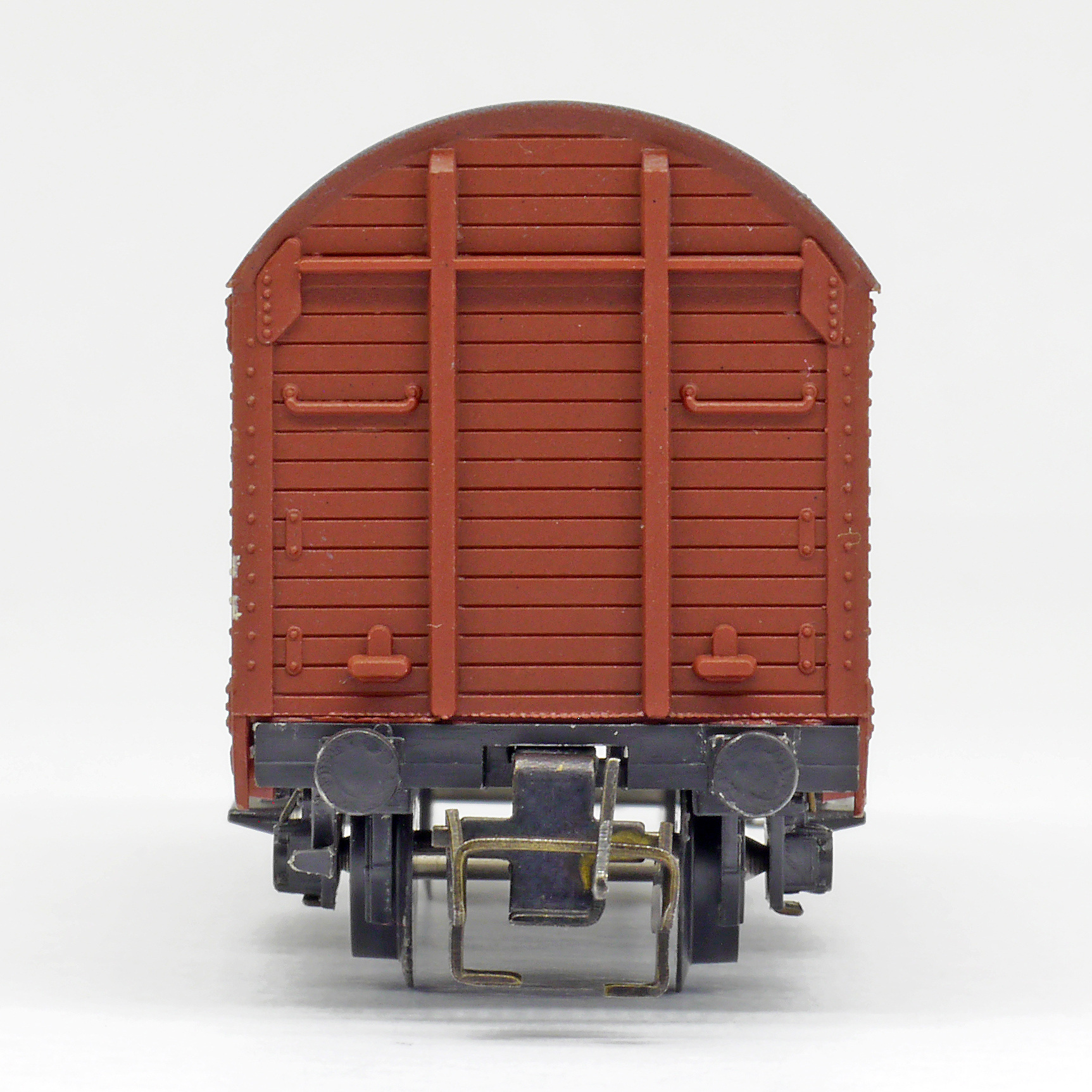 | krytý nákladní vůz červenohnědý s šedou střechou a s brzdařskou budkou |