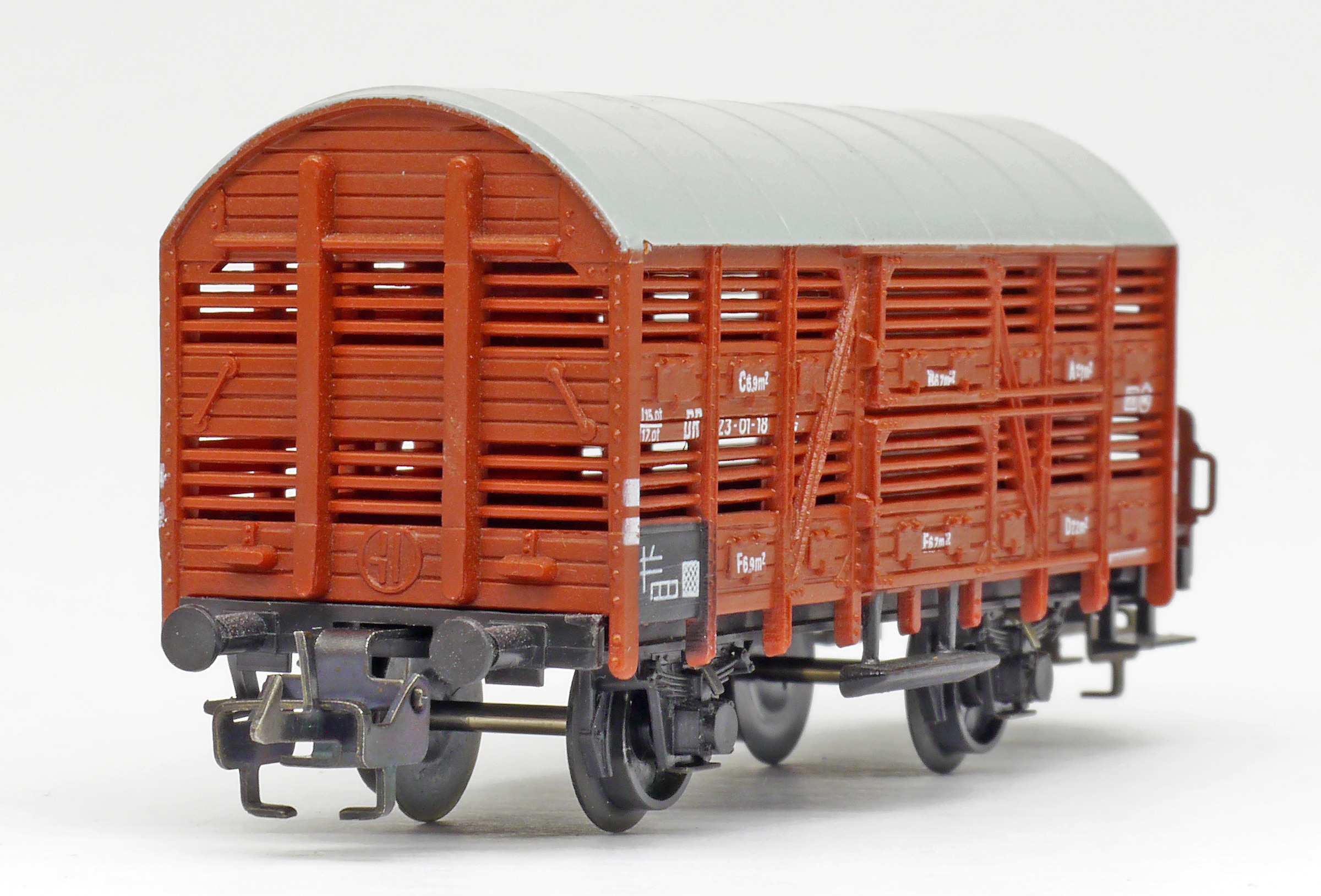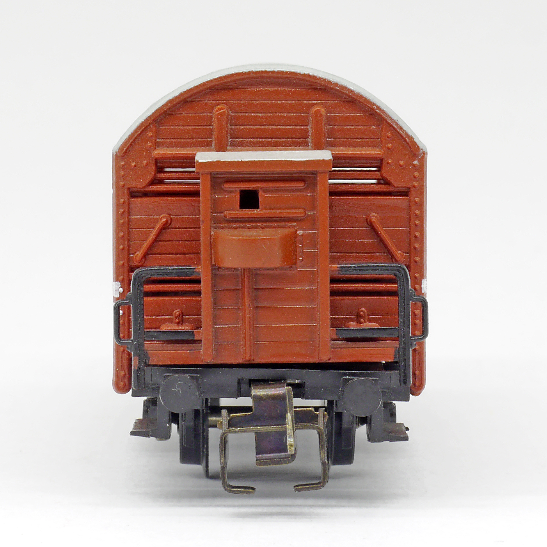 | nákladní vůz na přepravu zvířat červenohnědý s šedou střechou a s brzdařskou budkou |